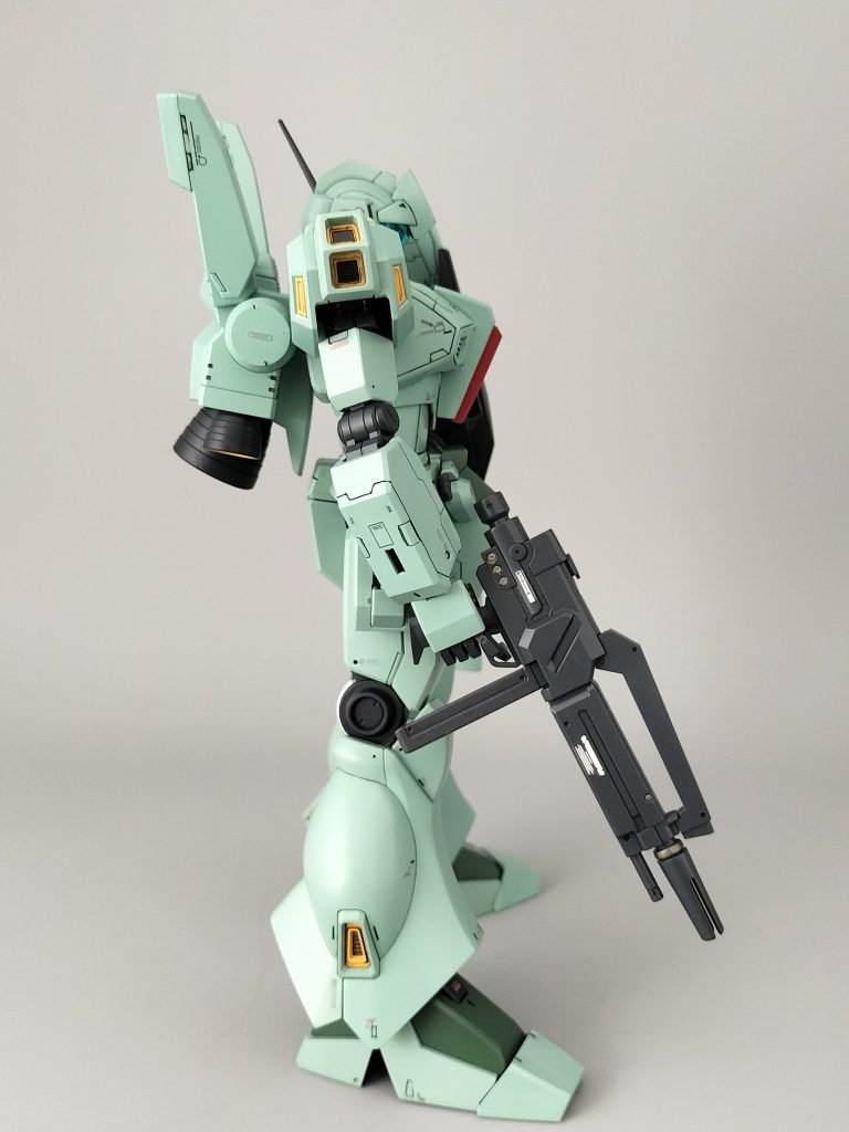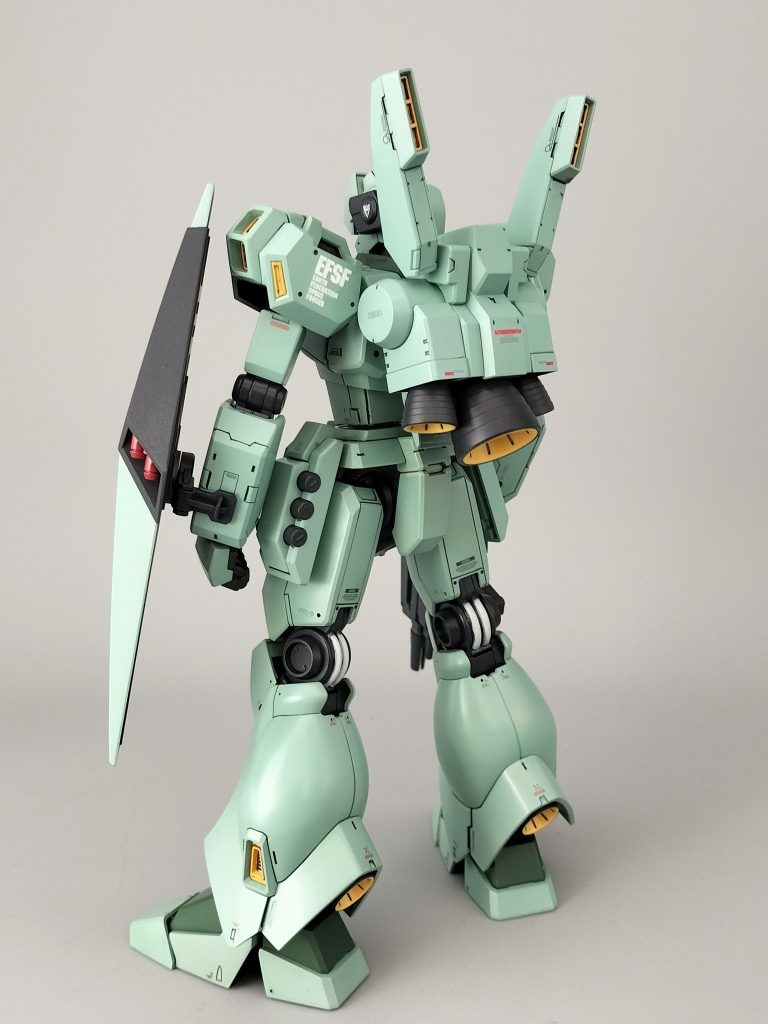 MGを改造するモデラーさんを尊敬します。小生はMGって手を入れる場所あるの!?と思ってしまうものです。胴体を長くした事でスラッとしていいですね。ペイントも終えた完成品で連邦軍の表記デカールがすごく映えています。連邦軍のロゴが映えるジェガン、印象的です。カッコいいです。