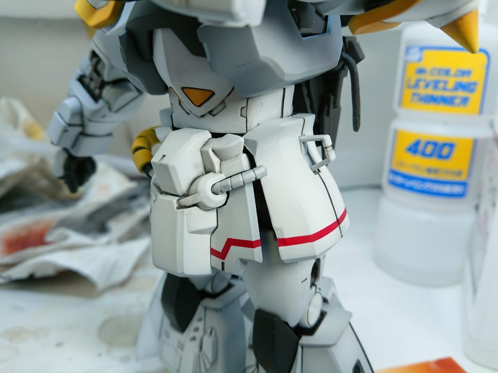 赤ラインは全体の白を塗装後,3㎜幅で切ったマステをアーマー下端ぴったりに貼って,そこから約1.5㎜隙間を空けてマステ貼って赤塗りました.