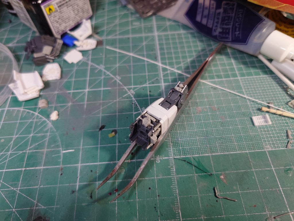 おでこにプラ板貼り付けて目が鋭くなるように、他は筋彫り直しと外装を真ん中でカットしひっつき虫で仮止めして様子見