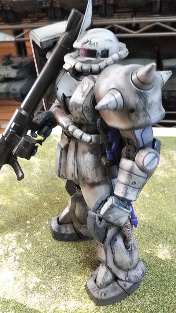 戦場では、これくらいすぐ汚れるのではないでしょうか?MSはやはり汚してこそ、ですよ カッコいいザク、ありがとうございます 後ろの戦車棚がすごいですね