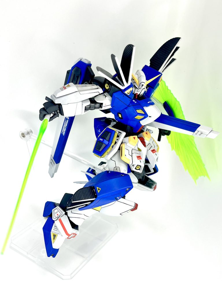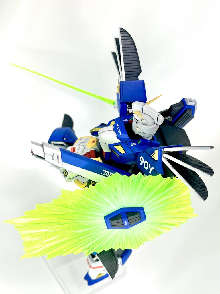 特に改造などせず、ほぼプレーンの素組です。スジボリで情報量を追加、一部ポイントでグレーを塗っています。バーニアやスラスタ、フレーム部分だけメタリックで光沢仕上げにしています。フィンの基部は白でしたが、F90ⅢY用に青に変更しました。フィンも赤ではなく、白とグレーにしF91に寄せました。