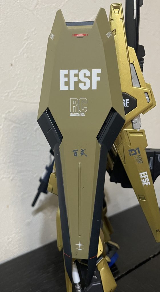 先日ウチでロールアウトしたばかりのAEUG仕様の百式ちゃんをUC0096の慢性的な戦力不足に悩むロンドベルへ再配備したということで、マーキング(デカール)変更とシールドを実装させました。