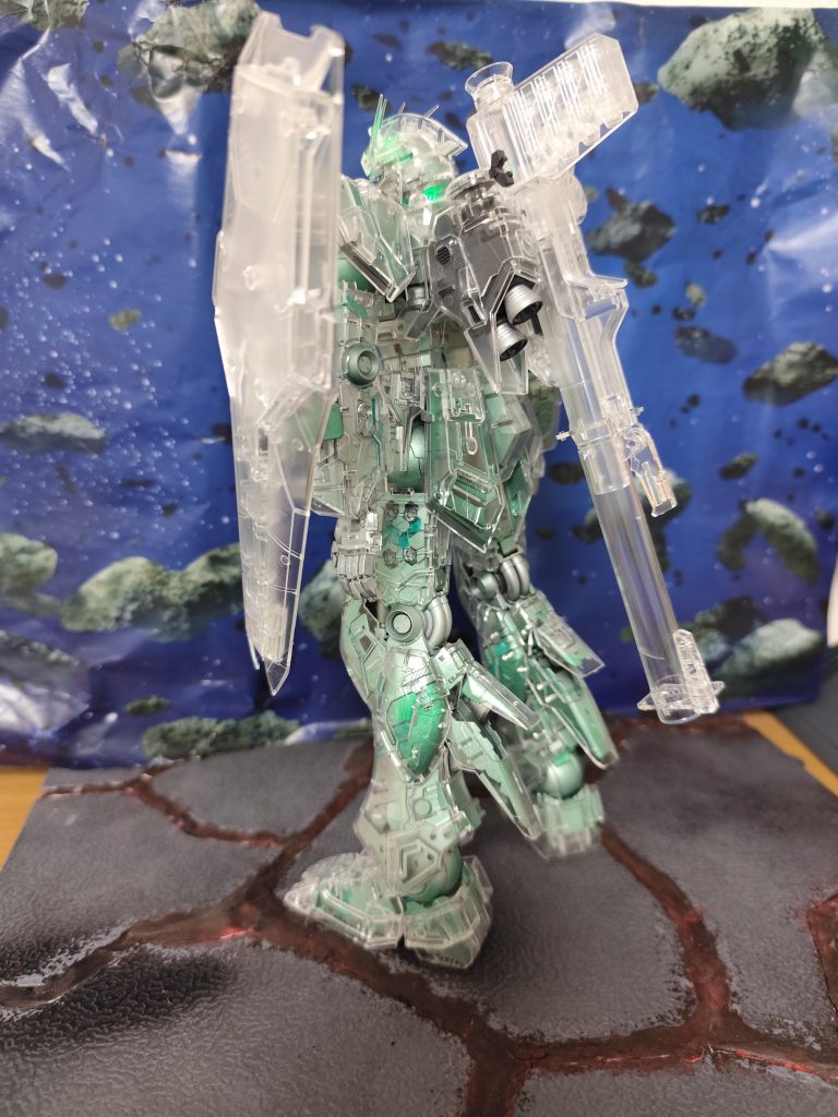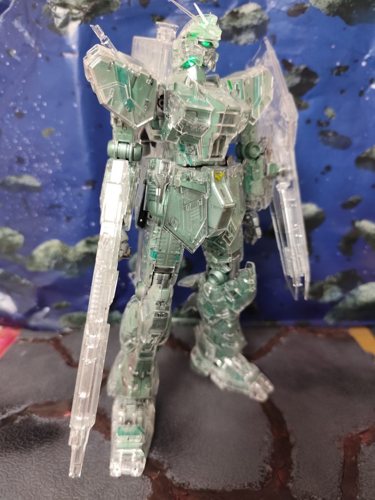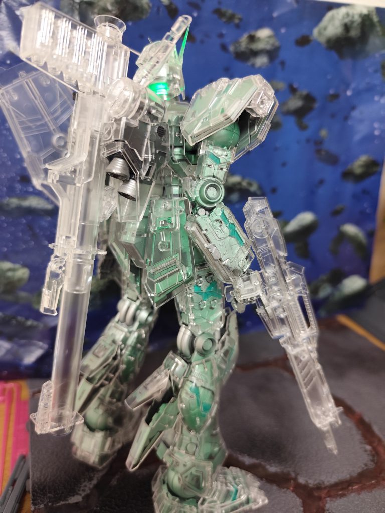 です。一度フレームを黒にしましたがなんか違和感を感じて、サイコフレーム発動状態イメージで緑基調の塗装で完成させました。めちゃ気に入ってます。緑をうっすら、に、したのが大正解で、お気に入りの仲間入りしました。作った時は、なんでこれ買っちゃったんだろうぐらいの気持ちだったんですが、当面箱にしまわない(笑)