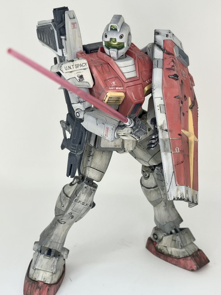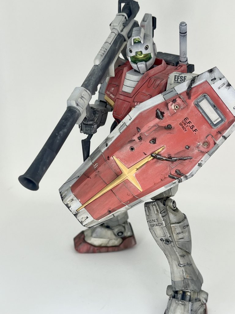 足元の汚れを多めにウェザリングカラーで汚しました。盾も武器として使うと思うので底面に擦り傷多め。それと、ハンダゴテやヤスリで傷をつけてみました。