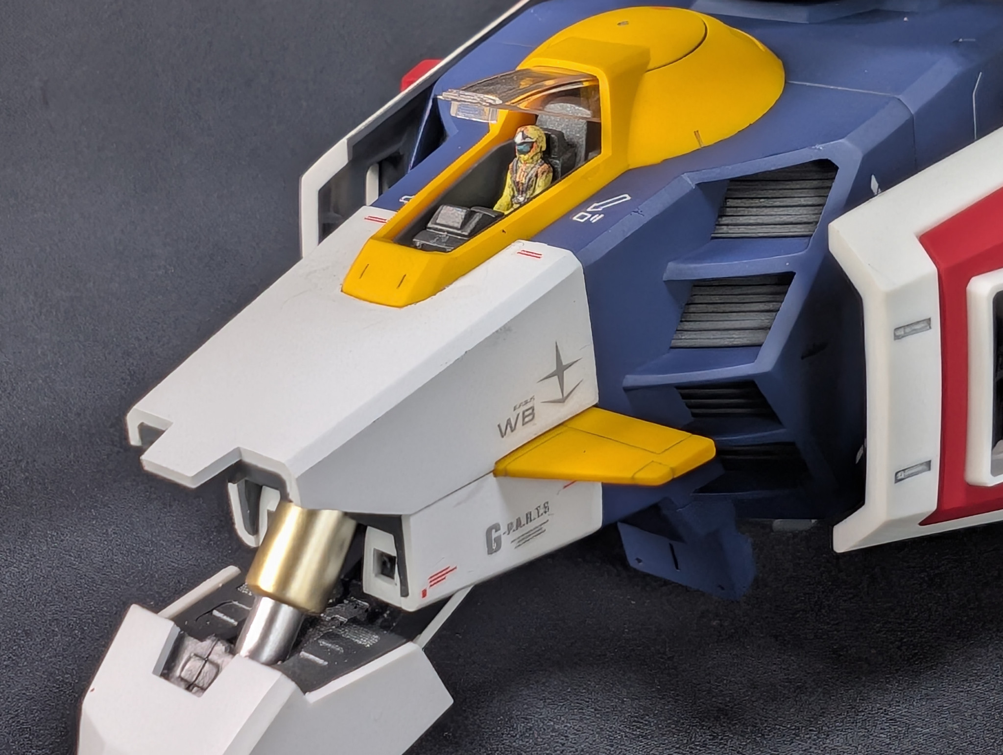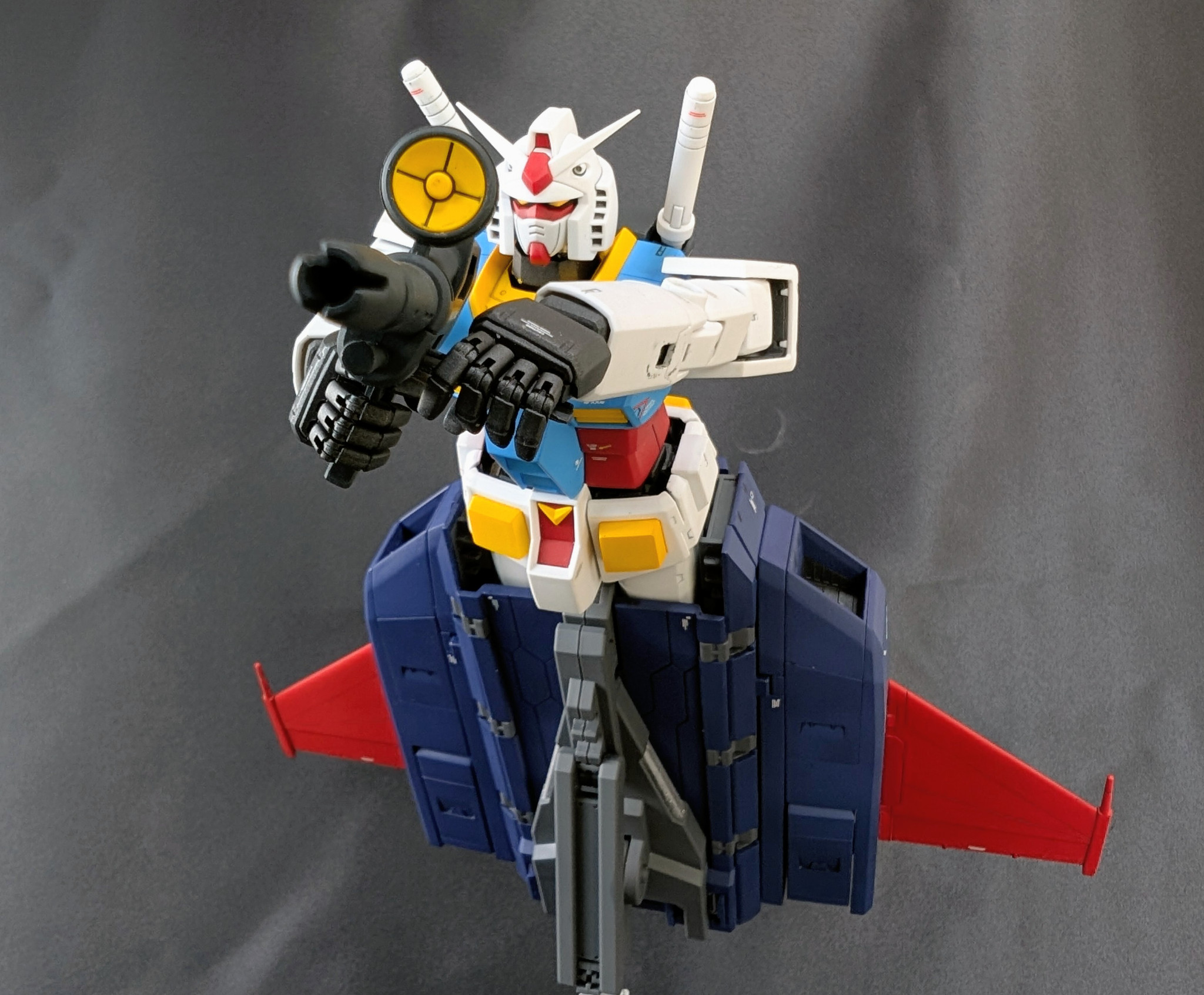 キットは再販品ではなかったのでパーツの一部が劣化して強度が落ちてたのと、大きなパーツにたまに歪みがあって合わせが悪く中々面倒でした。合体機構を考えて、ガンダム格納時に干渉する部分だけは塗装していません。ガンダムver.2.0をアニメ版に近い感じにしたので、同じ様にと思いましたがもう少しブルーが明るくしても良かったかなと…。