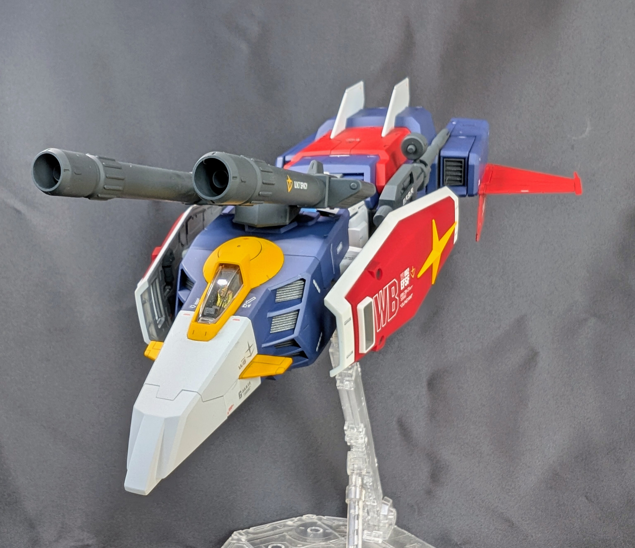 Gスカイ形態。旧キットの「コア・ファイターでかい問題」をジョイントをかます事で見事に違和感を解消してます。ちなみにこちらのコア・ファイターにはスレッガーさんが乗ってます。