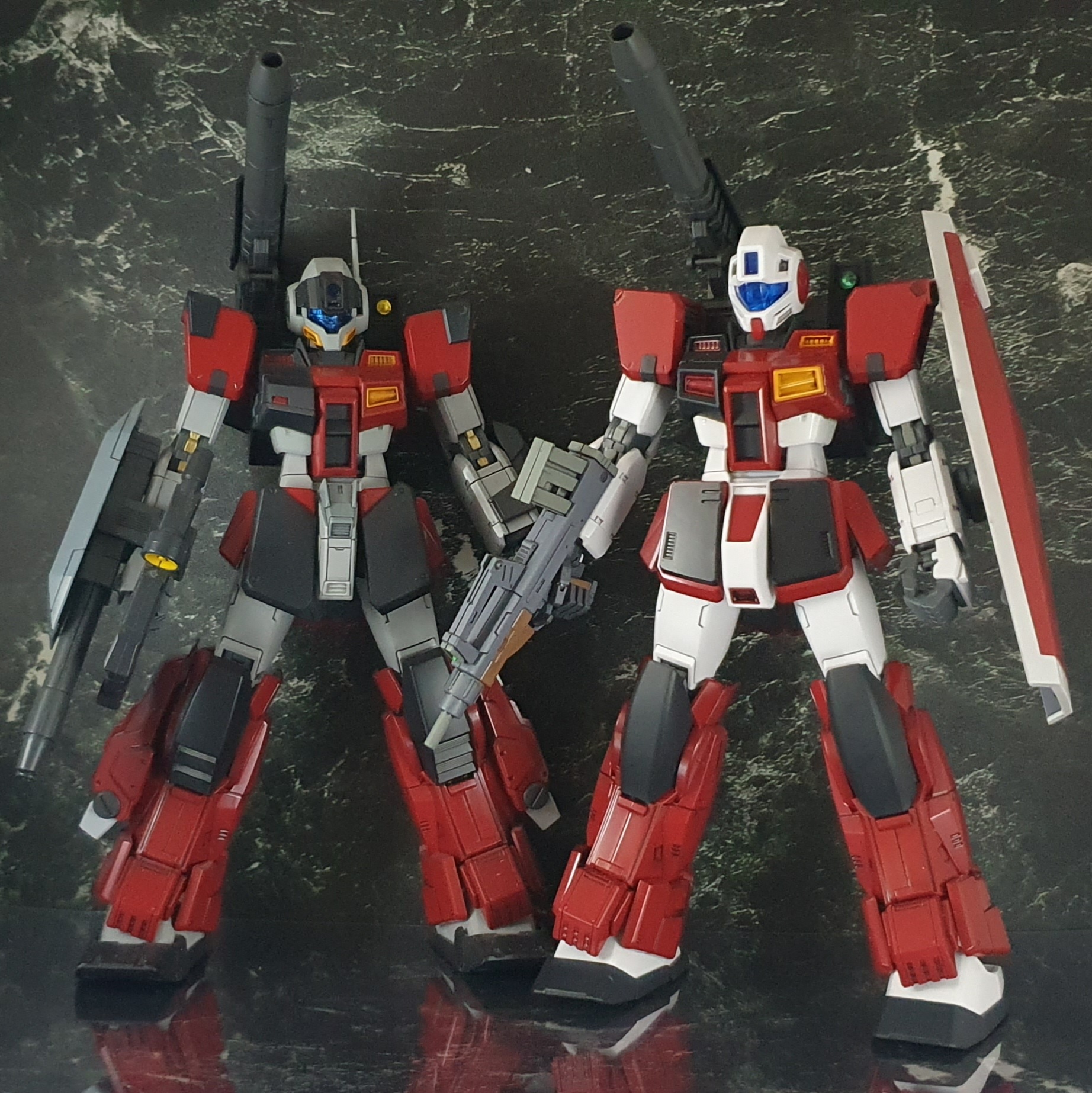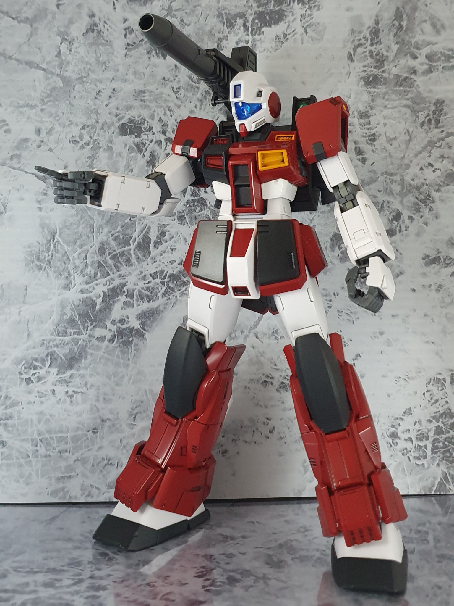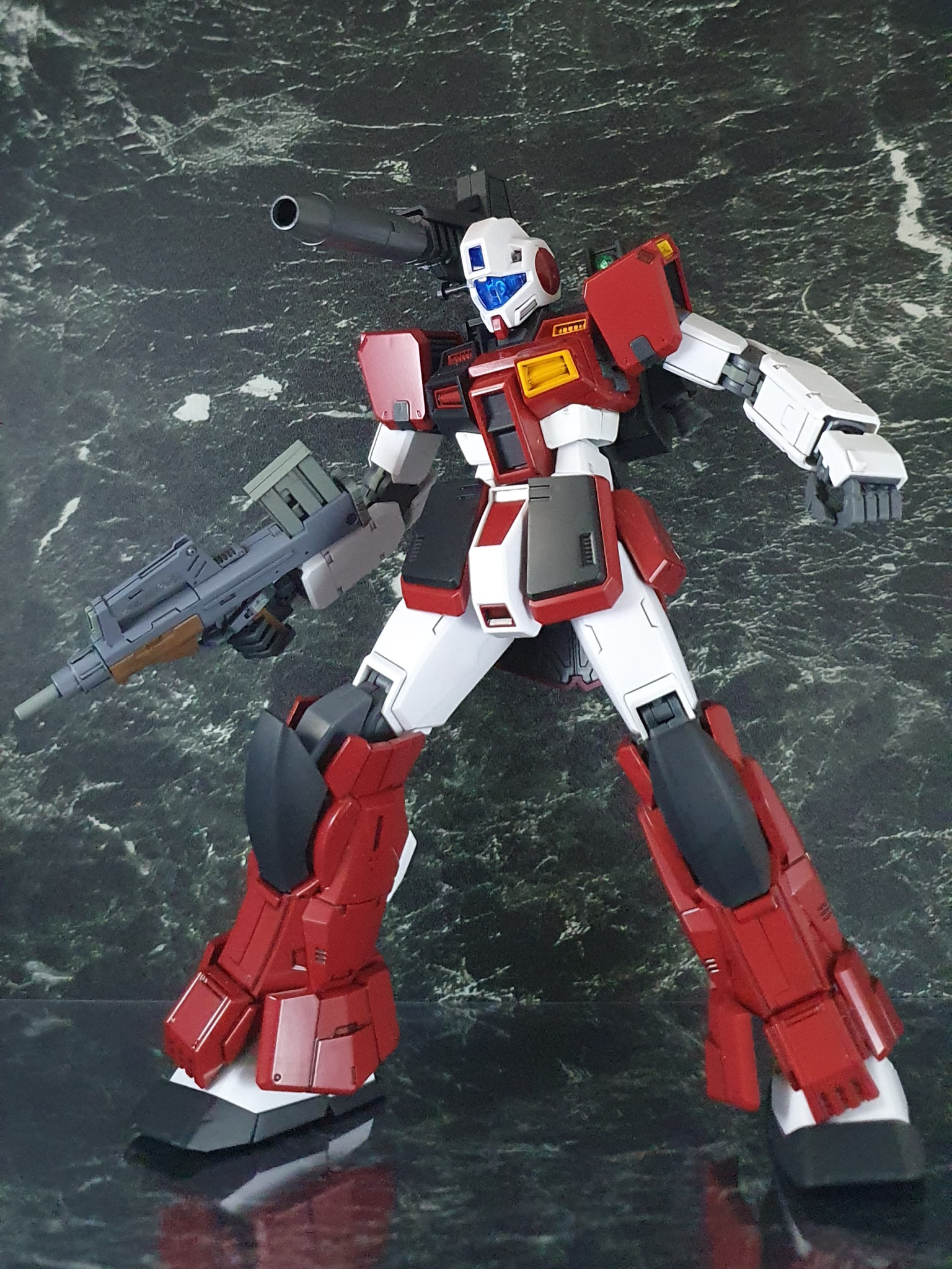 《改造点》 【頭部】MG ジムコマンドそのまま!バイザーのみレジン複製し、クリアブルーに変更! 【胴体】色分けに伴い分割!!黒い側のダクトは埋まってる感じに、赤い方のダクトは出っ張ってる感じに改造 【脚部、腰部】MG ガンダムストームブリンガーをベースにしつつも、ヒザアーマーの変更。左右の追加スラスター(?)の排除を実施。腰部アーマーも改造 【武器】MG ストームブリンガーをベースに、キャノン砲の銃口付近を改造。印象を変え、バックパックの取り付け位置をかなり下方に修正した。