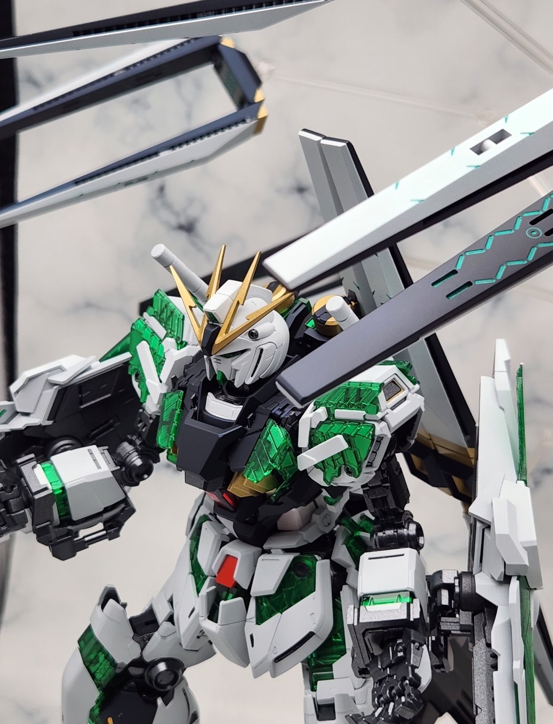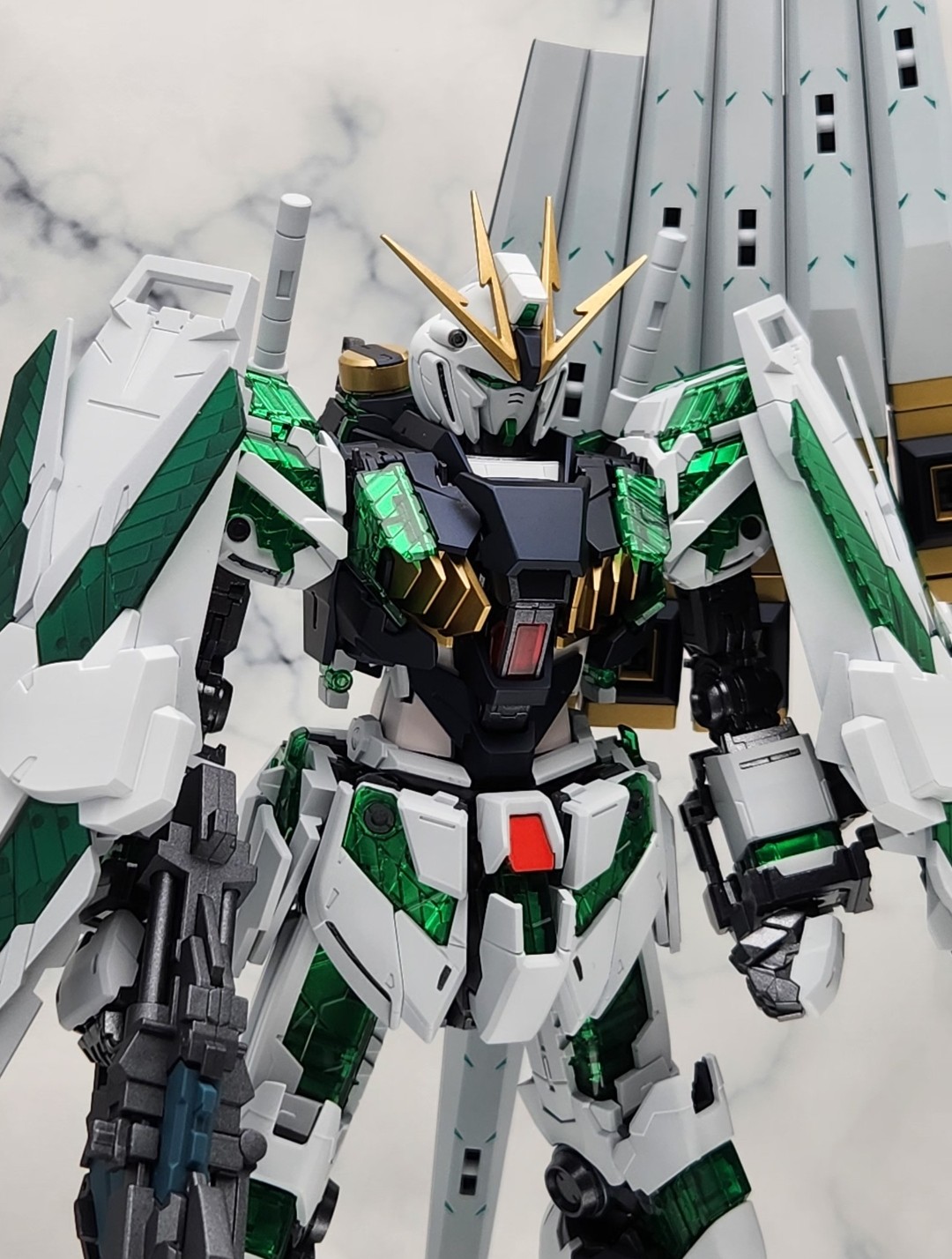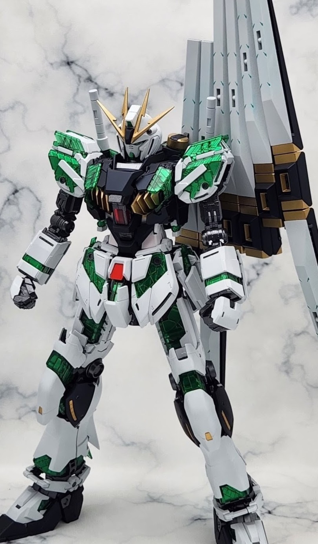 ナラティブサイコフレームのモールドを活かすために、凹凸側(裏)からガイアのプレミアムチタンシルバーを吹き、その後両面をクリアグリーンでコーティングしています。透明感も残しつつ、変に透けすぎていない仕上がりになって満足です。
