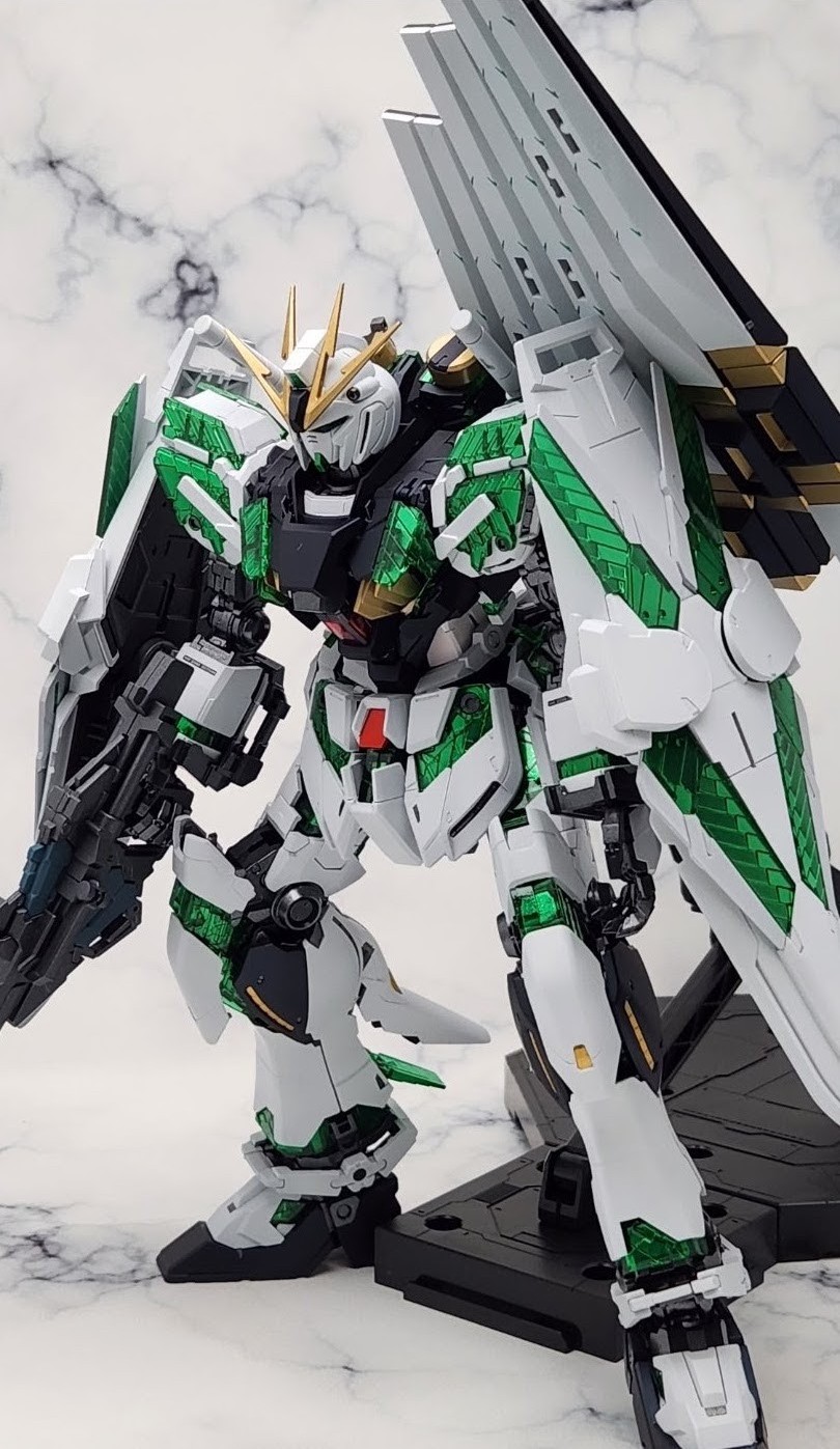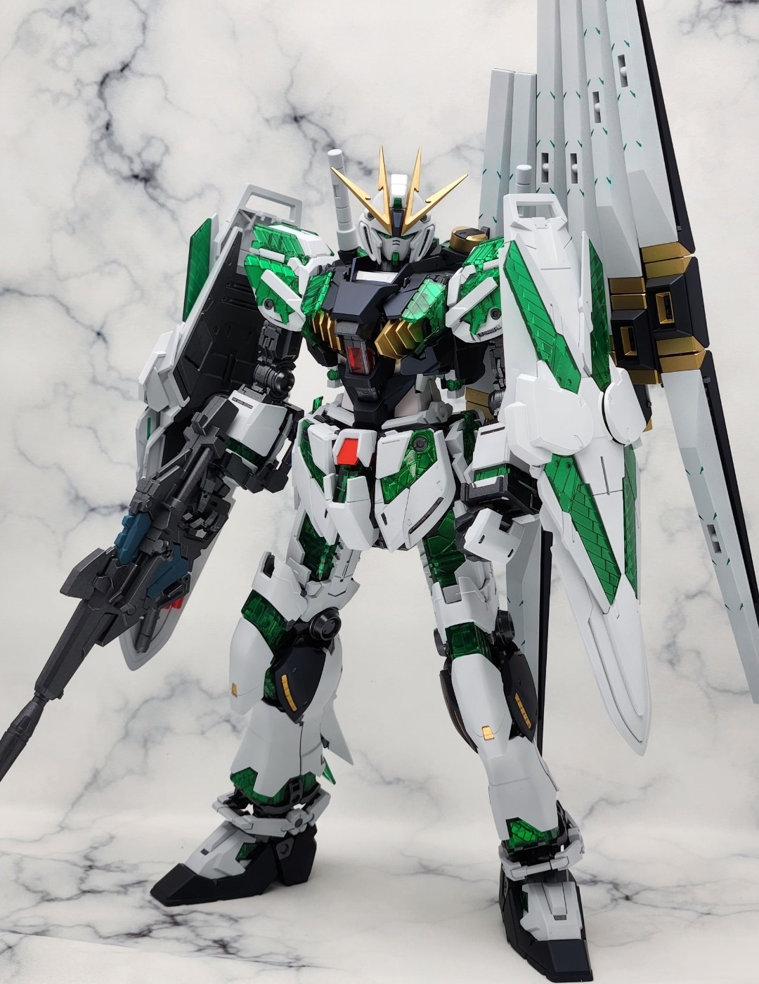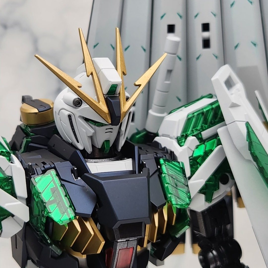 ナラティブサイコフレームのモールドを活かすために、凹凸側(裏)からガイアのプレミアムチタンシルバーを吹き、その後両面をクリアグリーンでコーティングしています。透明感も残しつつ、変に透けすぎていない仕上がりになって満足です。