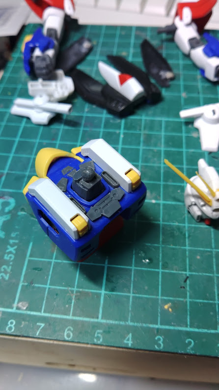 改造ポイントとしては…顔の小型化、首の延長、肩アーマーの取り付け位置上昇、胸の厚み増し、腰の延長とふんどし位置の変更、太股ブロックにロール軸追加…などなど、腰アーマーは旧キットから流用しました