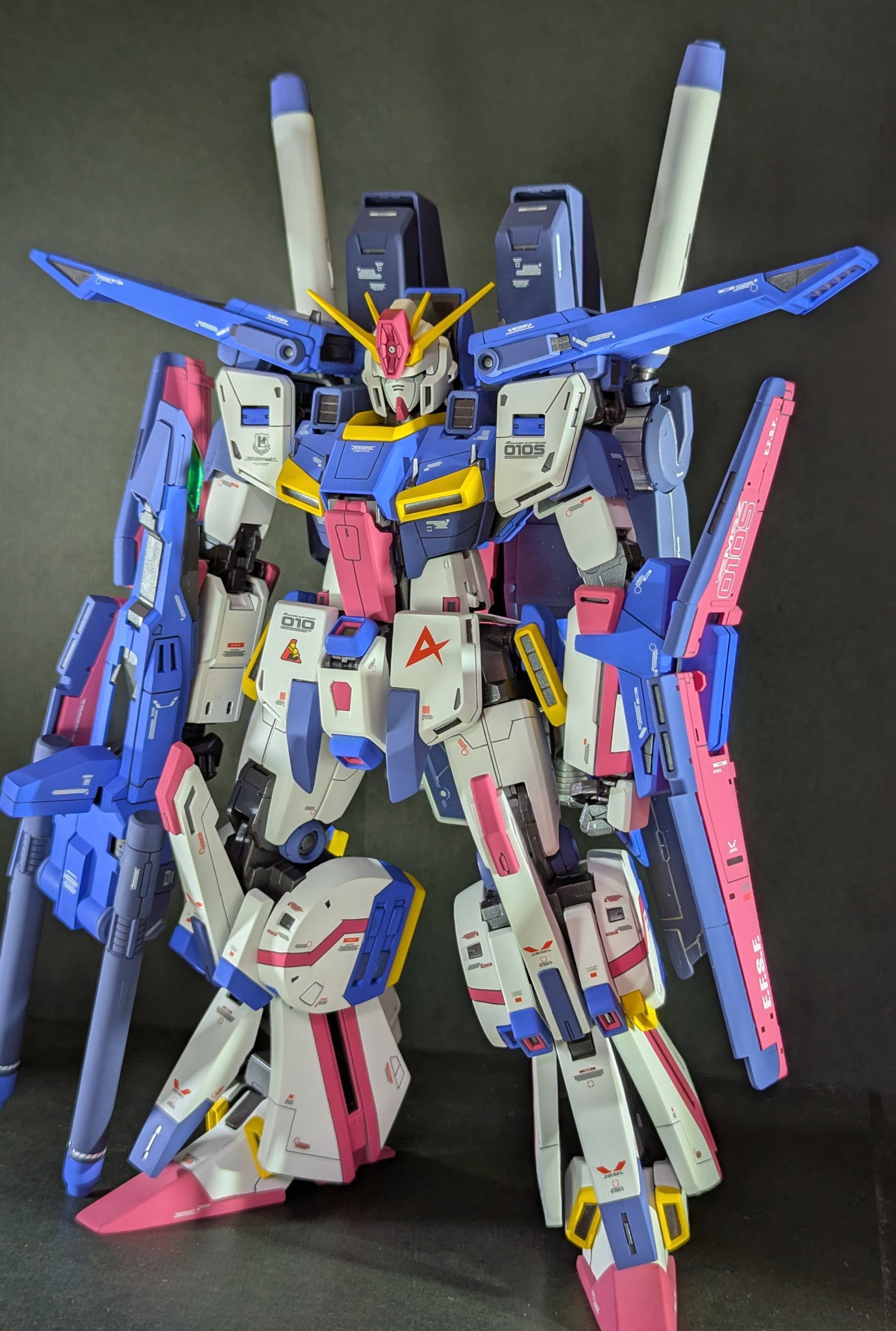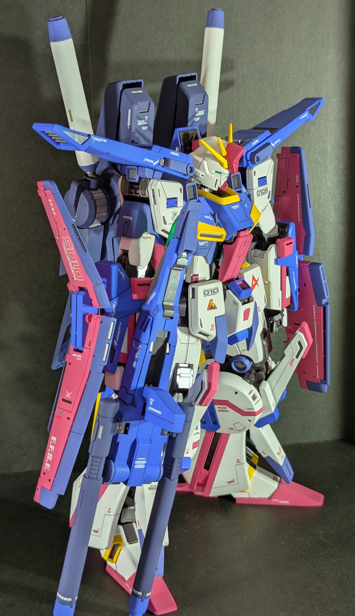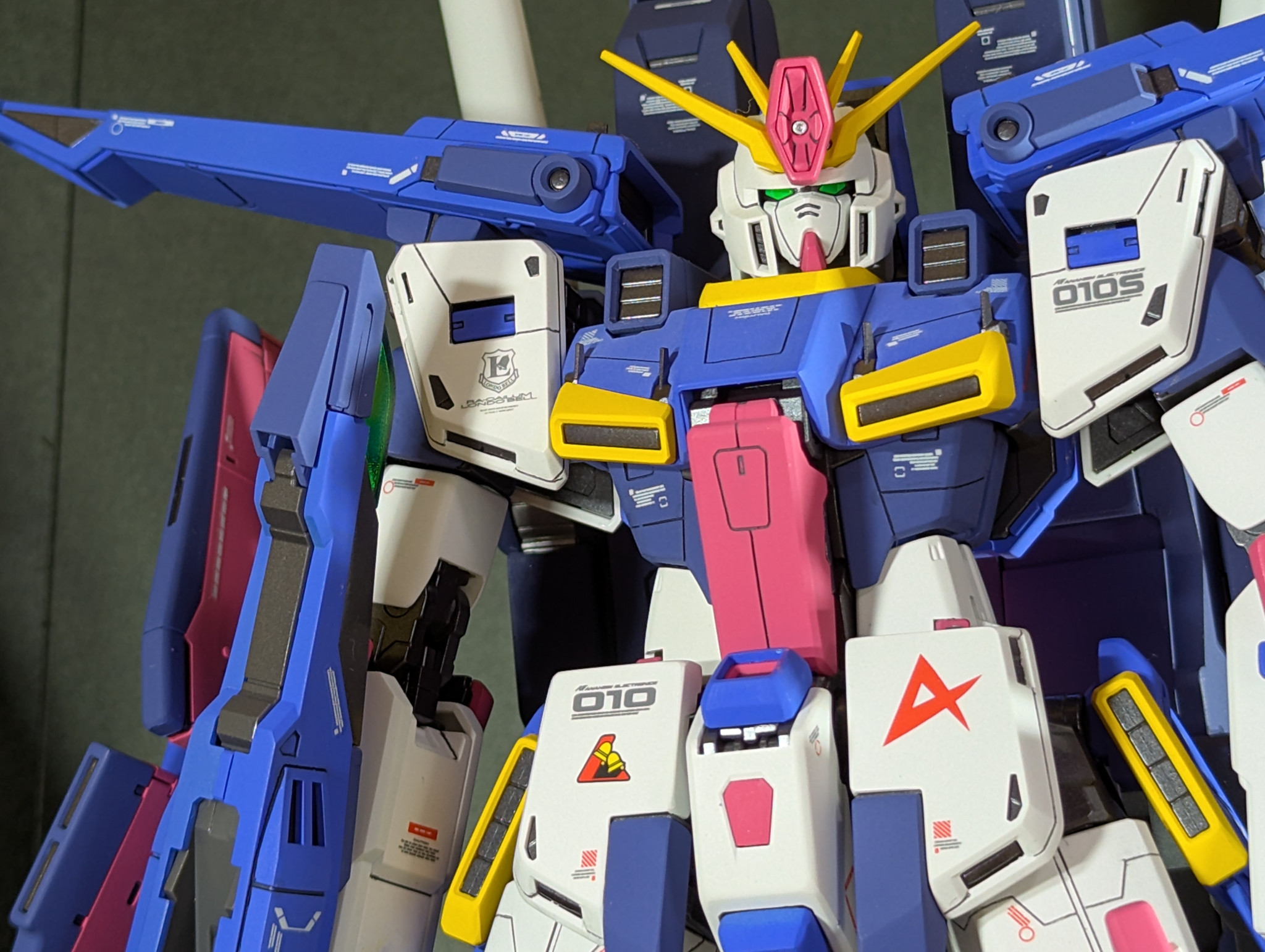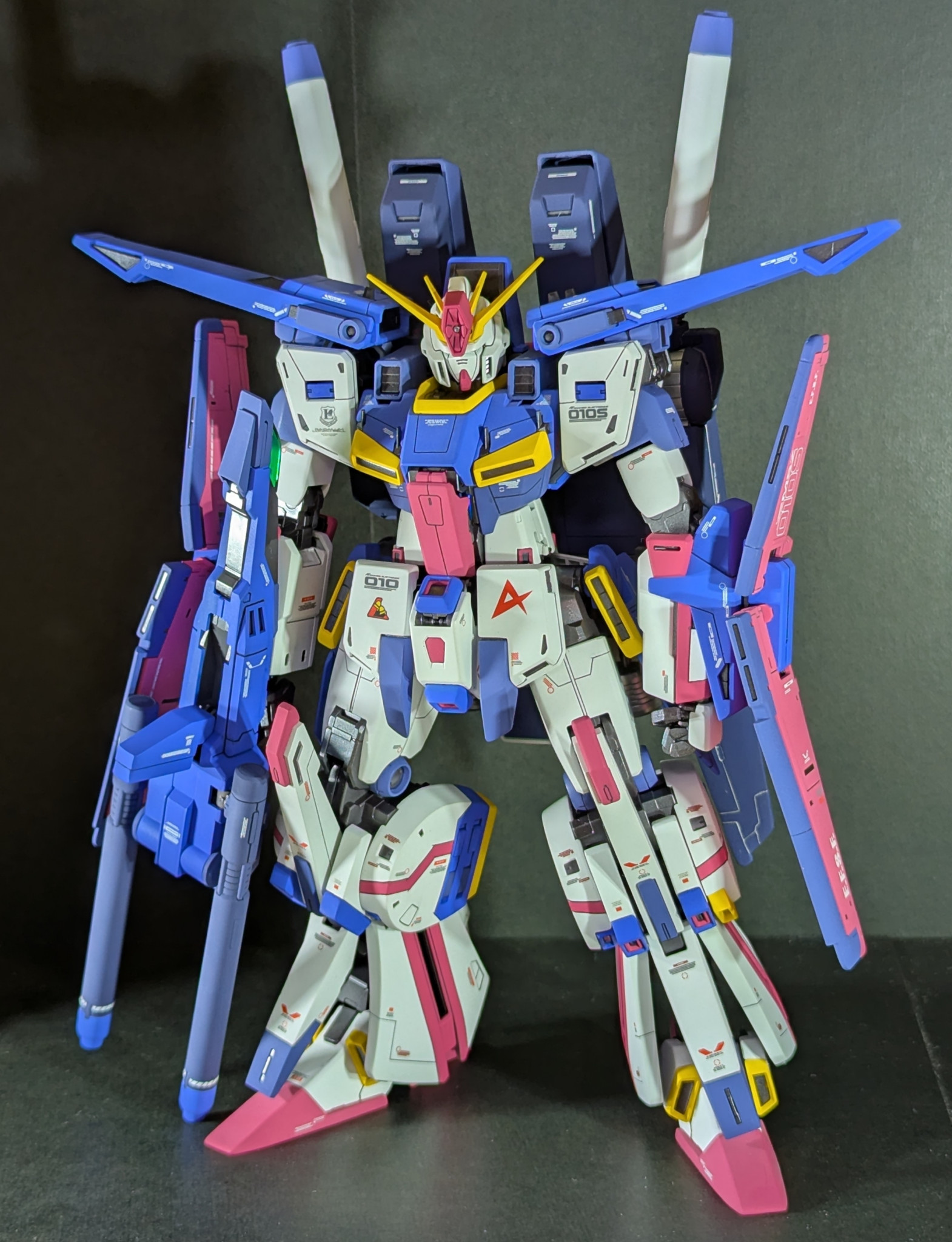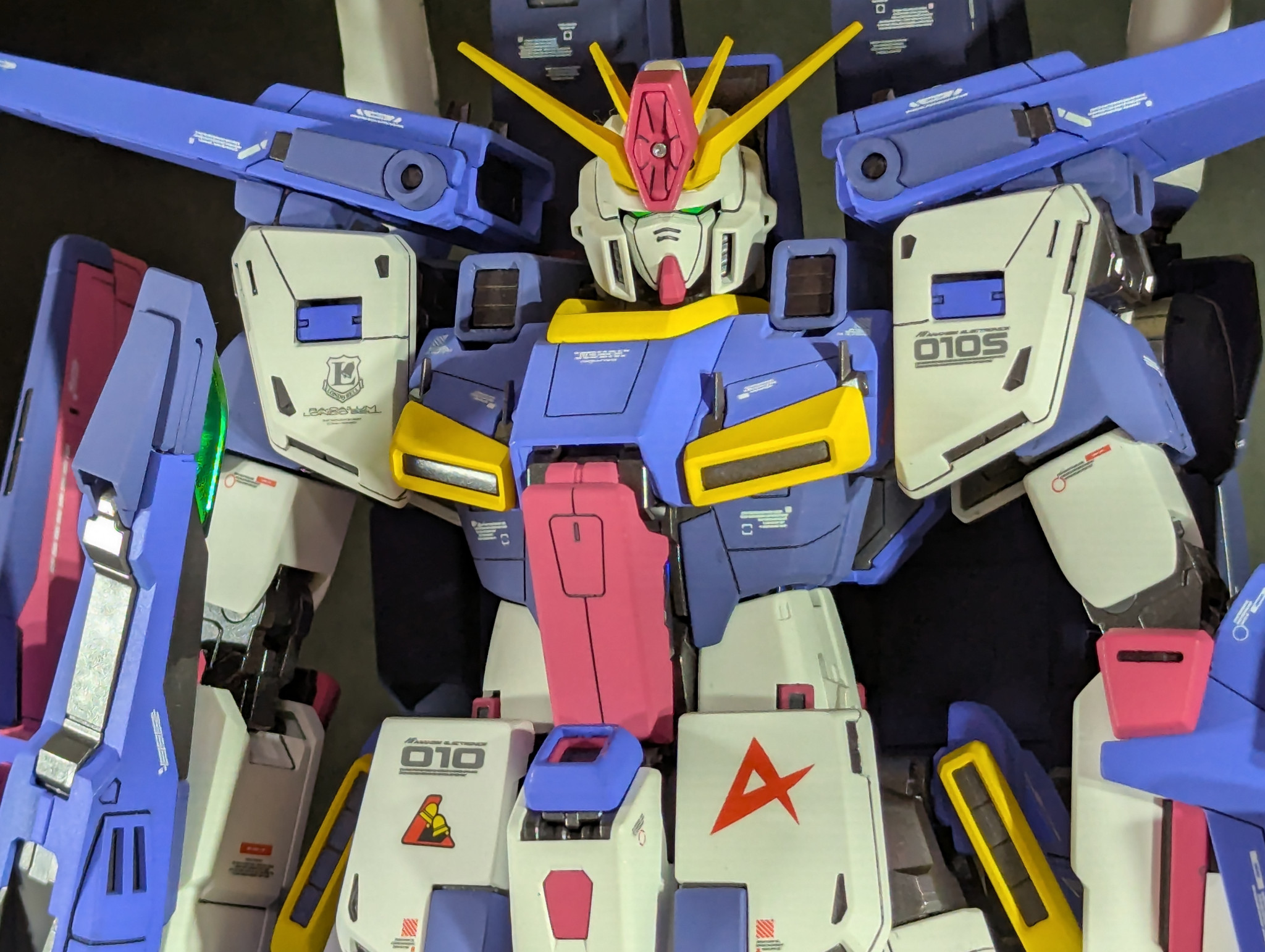 元のイメージを踏襲しつつも、エース用にリペイントされ、白っぽいけど白じゃないZZの特徴やトーンを落とした青や赤が視覚効果のある配置がされていて惚れ惚れします。