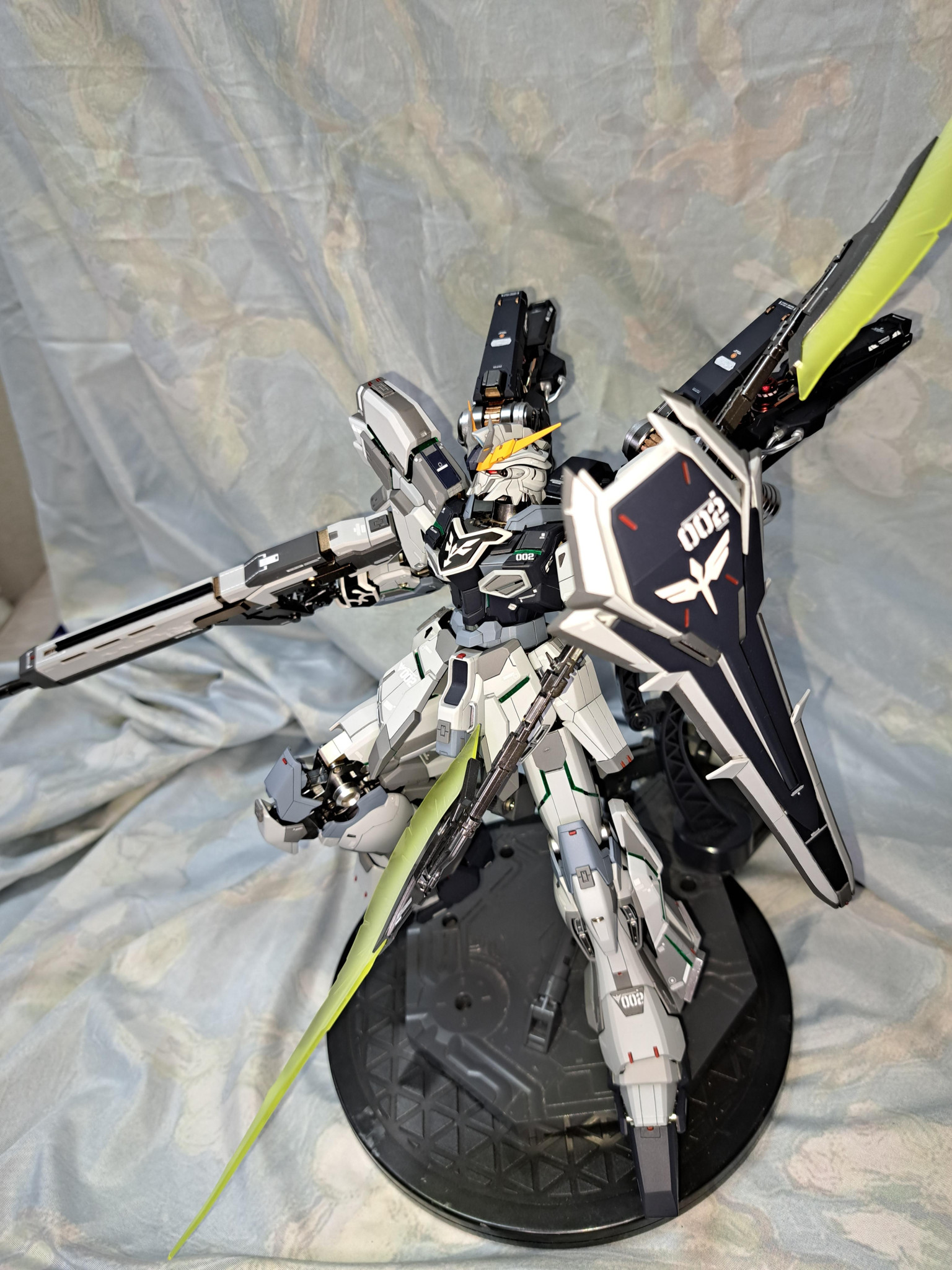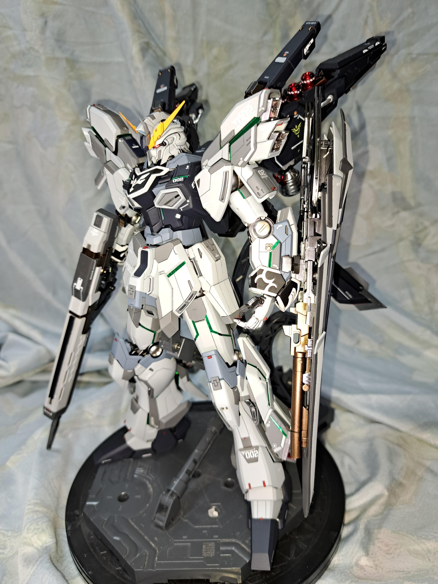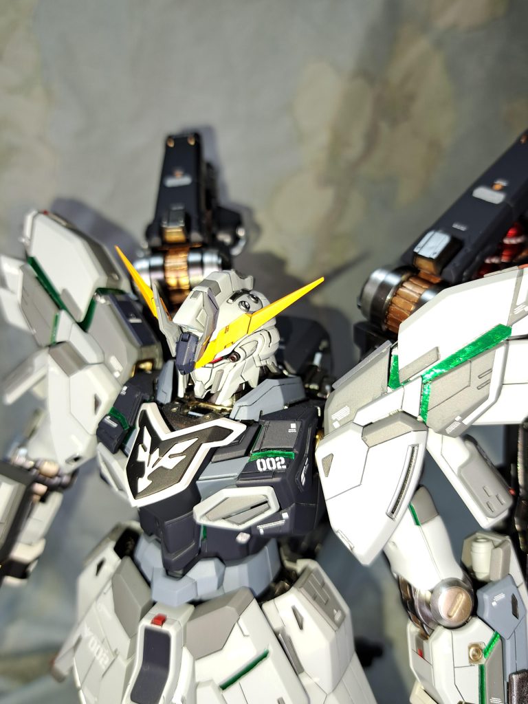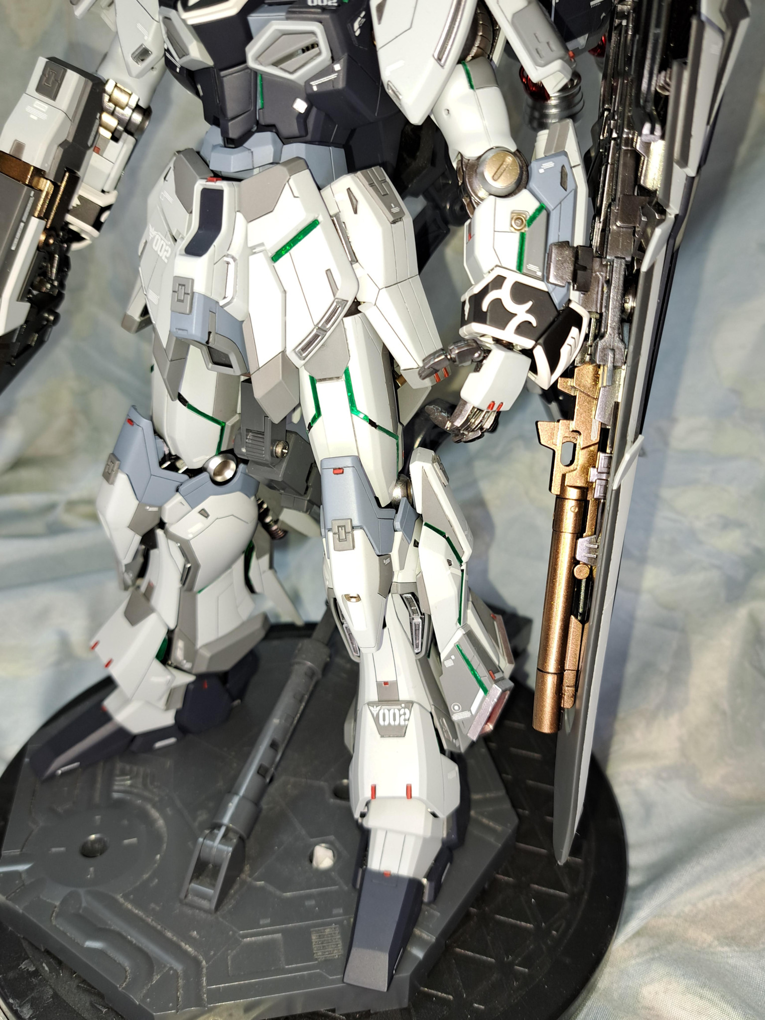 シナンジュスタインをフルサイコフレームぶちこんで、超高速にして、モリモリにしてみたく制作しました。頭部とバックパック以外はプラバンはったり、余剰パーツを使いディテールあっぷしました。息子に見せたら、「これはスタイン(原石)じゃあない!ウェッジ(楔石)だ!シナンジュウエッジだ!」って言われたので、そうします。