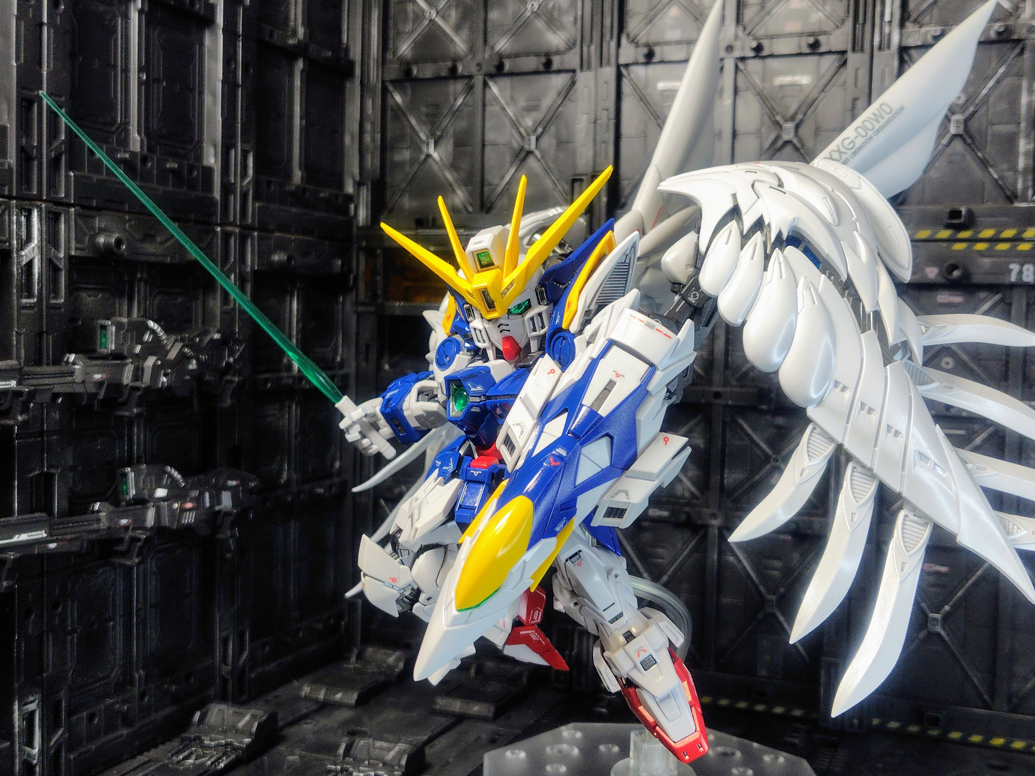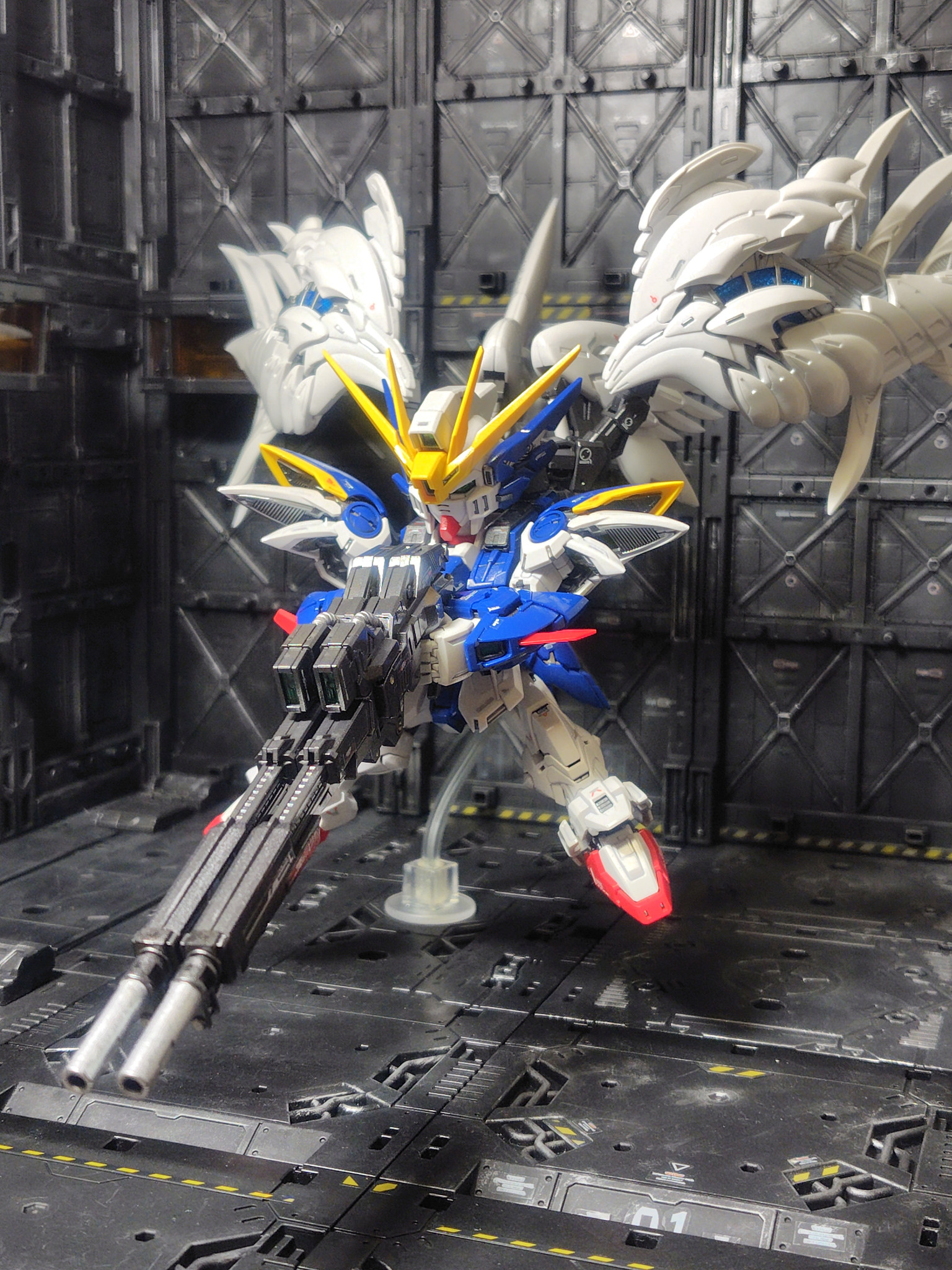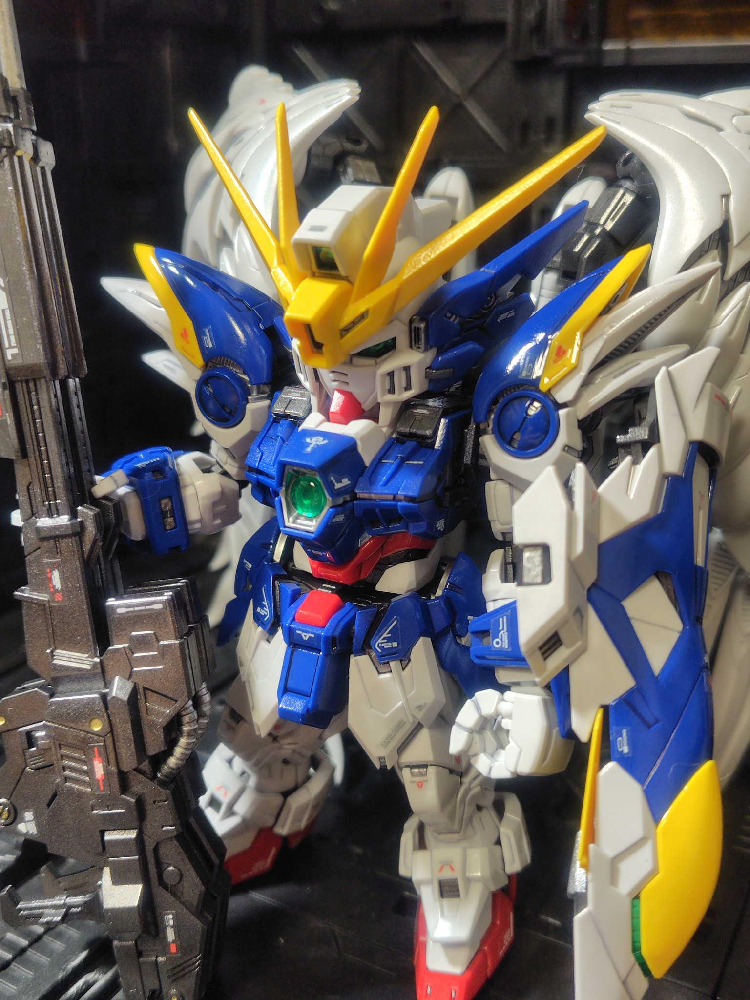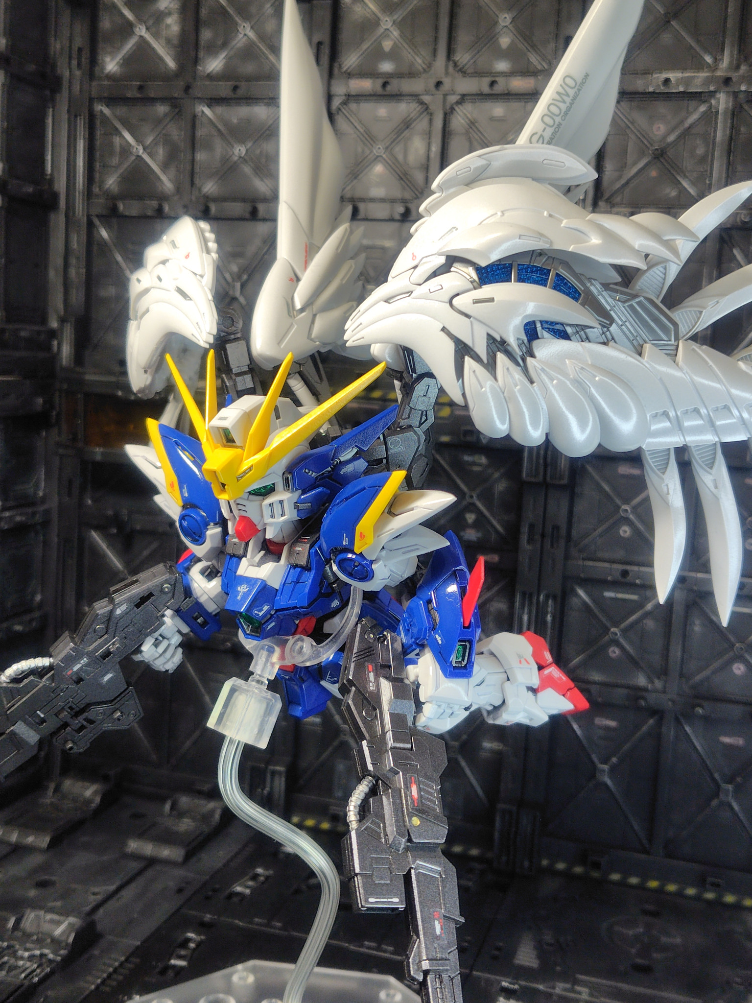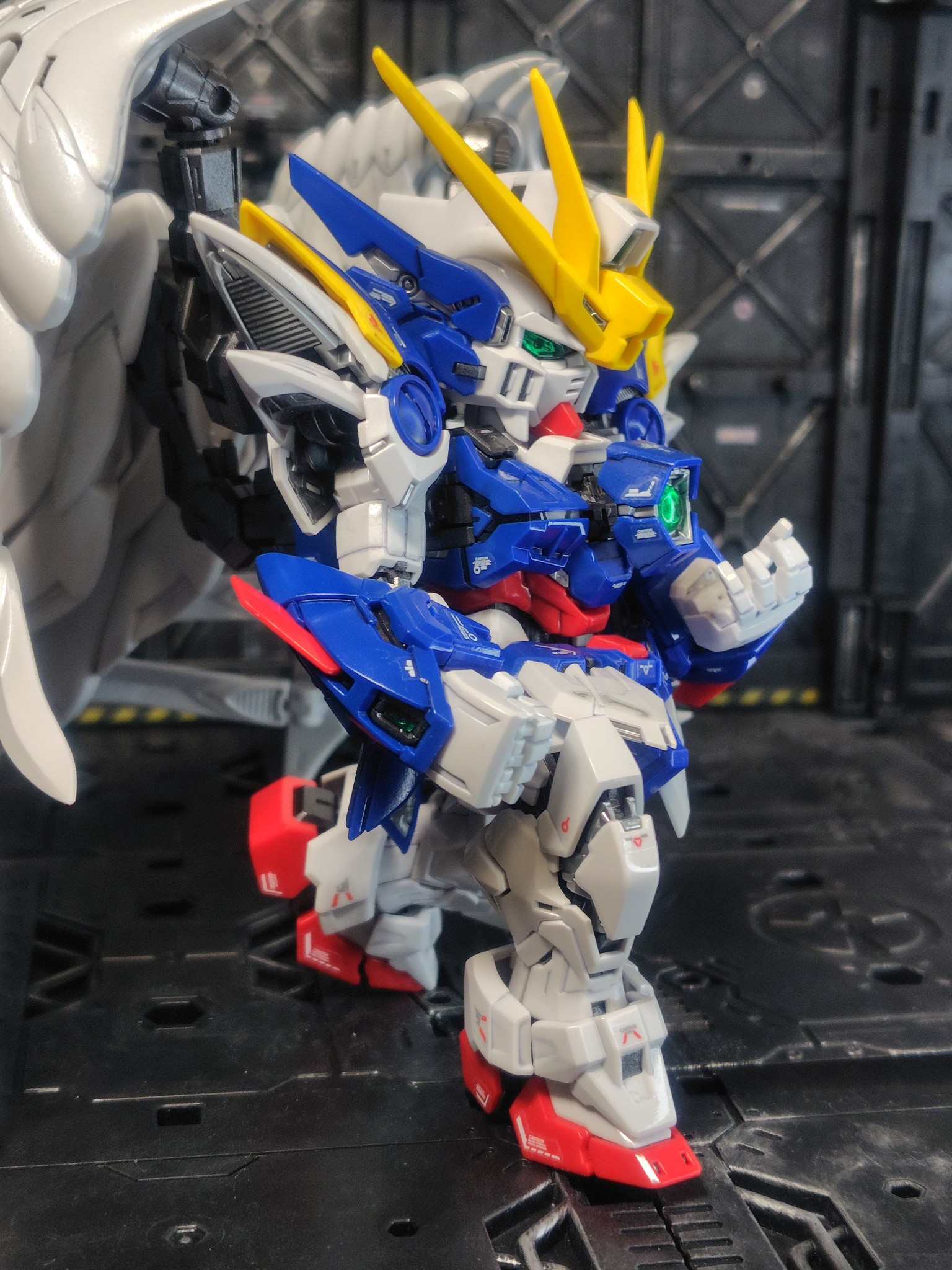 初めてのMGSD!ウイングガンダムゼロEWです!羽をホワイトパール、フレーム部分とライフルをガンメタルでスプレー塗装。付属のマーキングシール、光沢トップコート仕上げです。ポロリもなく良く動く素晴らしいキットです。何より作っていて楽しい(gundam-kao6)