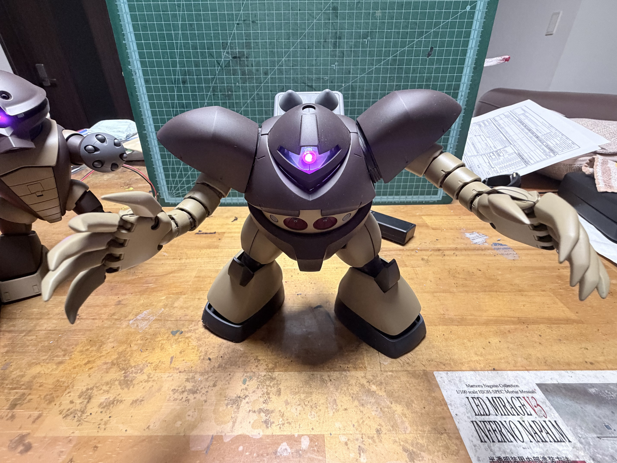 前回のアッガイと同様に今回もモノアイを光らせたいために、製作したようなもので、昔のMGである関係で内部フレームもスカスカなので、LEDは設置しやすくて、簡単お手軽にグポンすることができました。