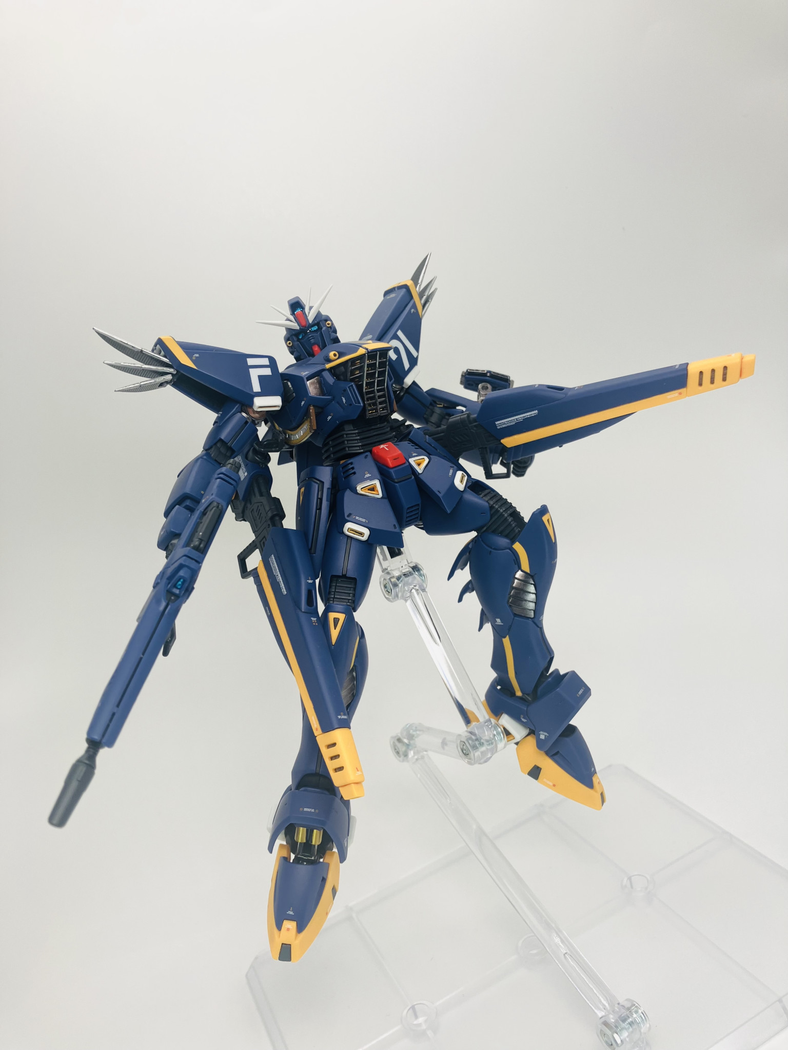 両肩部の放熱ファンの展開、脚部のスラスター展開ギミックがあります🤩 なお、今回はメタルパーツは一切使用せず、珍しく😋