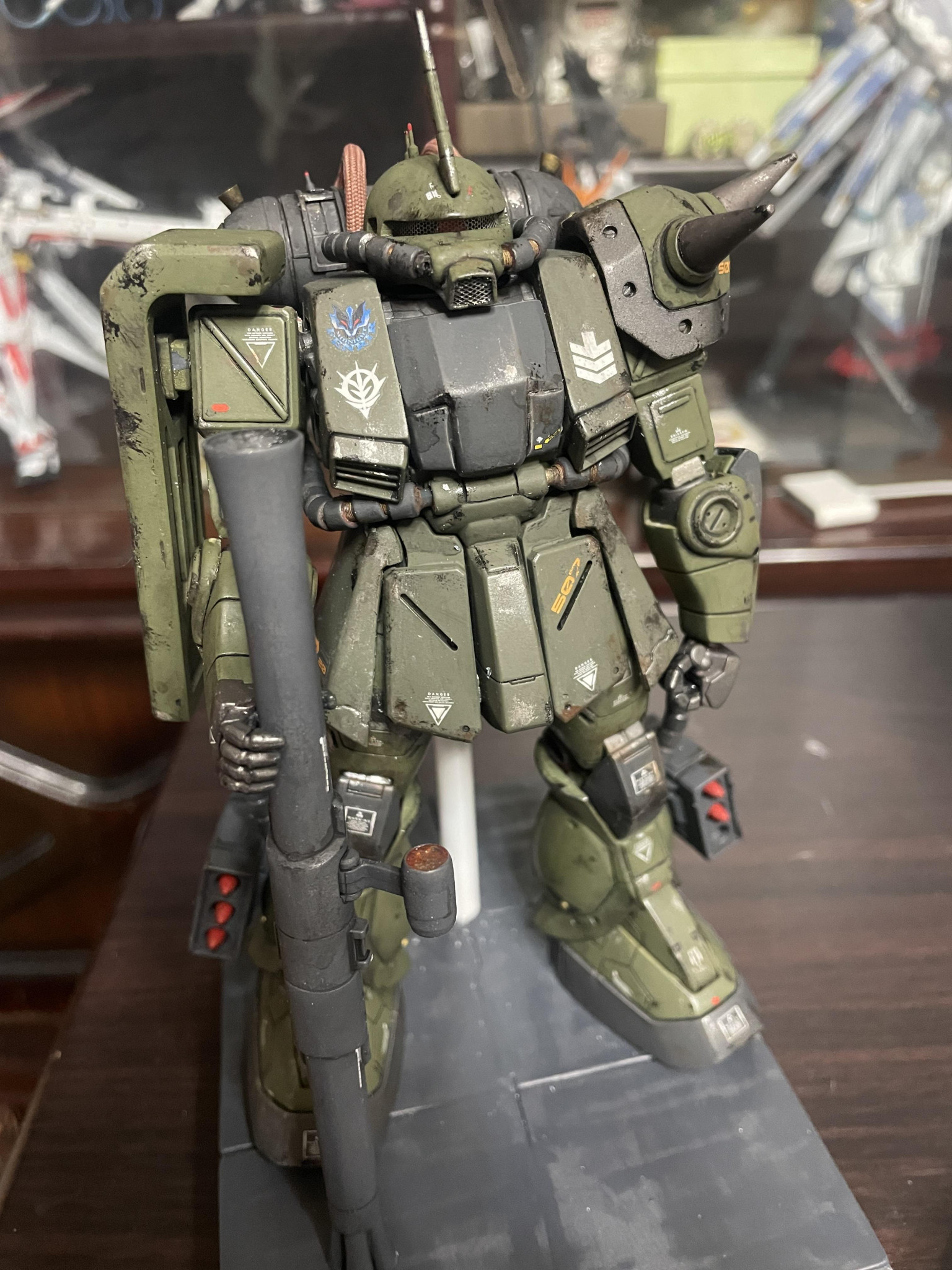 ジャンク品で買ったシャアザク1.0を再生しました。パイプ折れて外れ、関節ゆるゆる、股関節骨折でした。でっかい武器も作りましたが、最終的にはバズーカにしました。実は、背中の支えとバズーカが無いと立ってられないひ弱な子なんです😭関節固定すれば良かったかな、、、