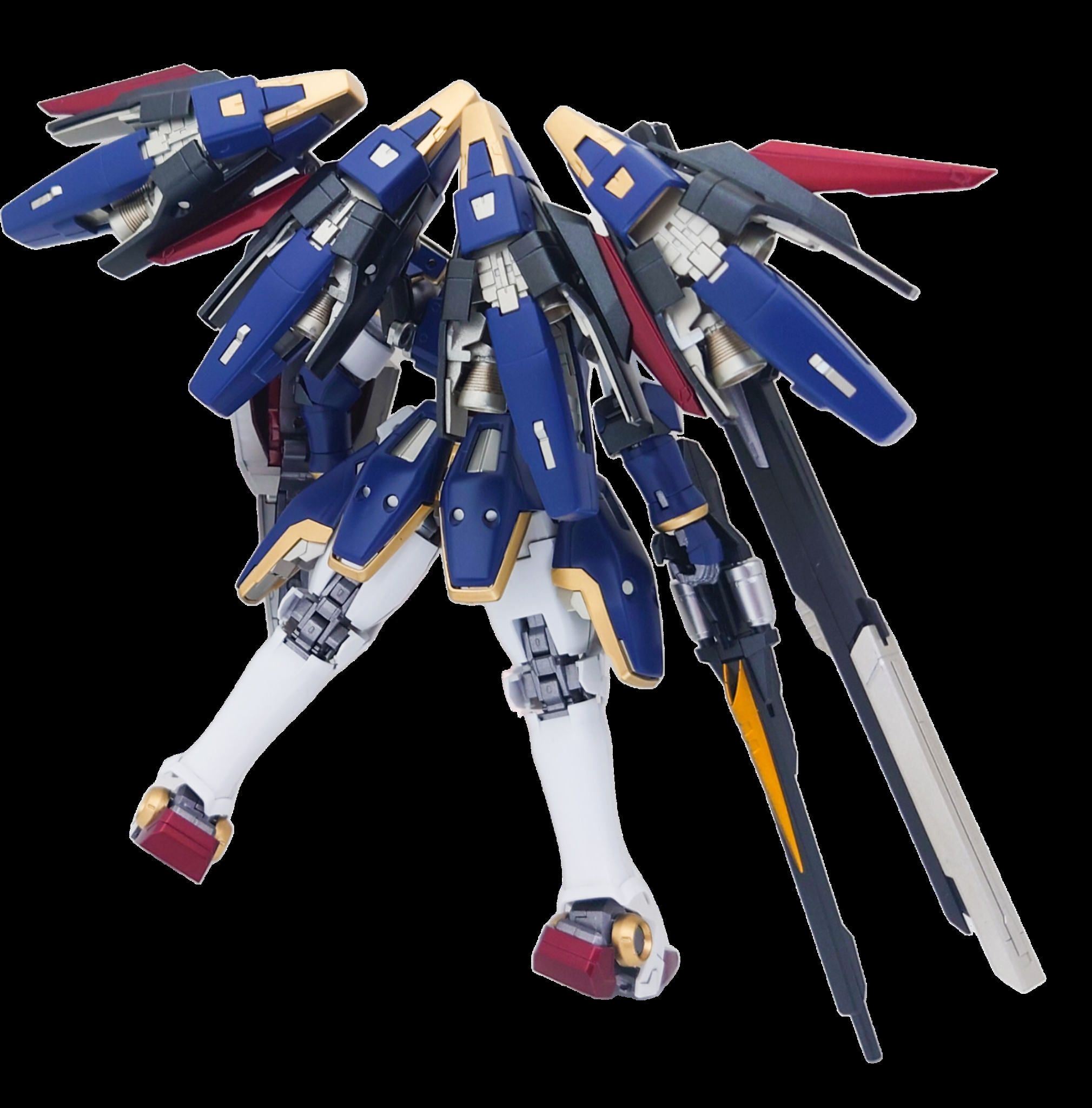 背面のバックパックには、トールギスのブースターを4基搭載させてみました。2基でパイロットに15Gの負荷がかかるとのことなので、4基だと恐ろしいことになりそうですね(gundam-kao5)