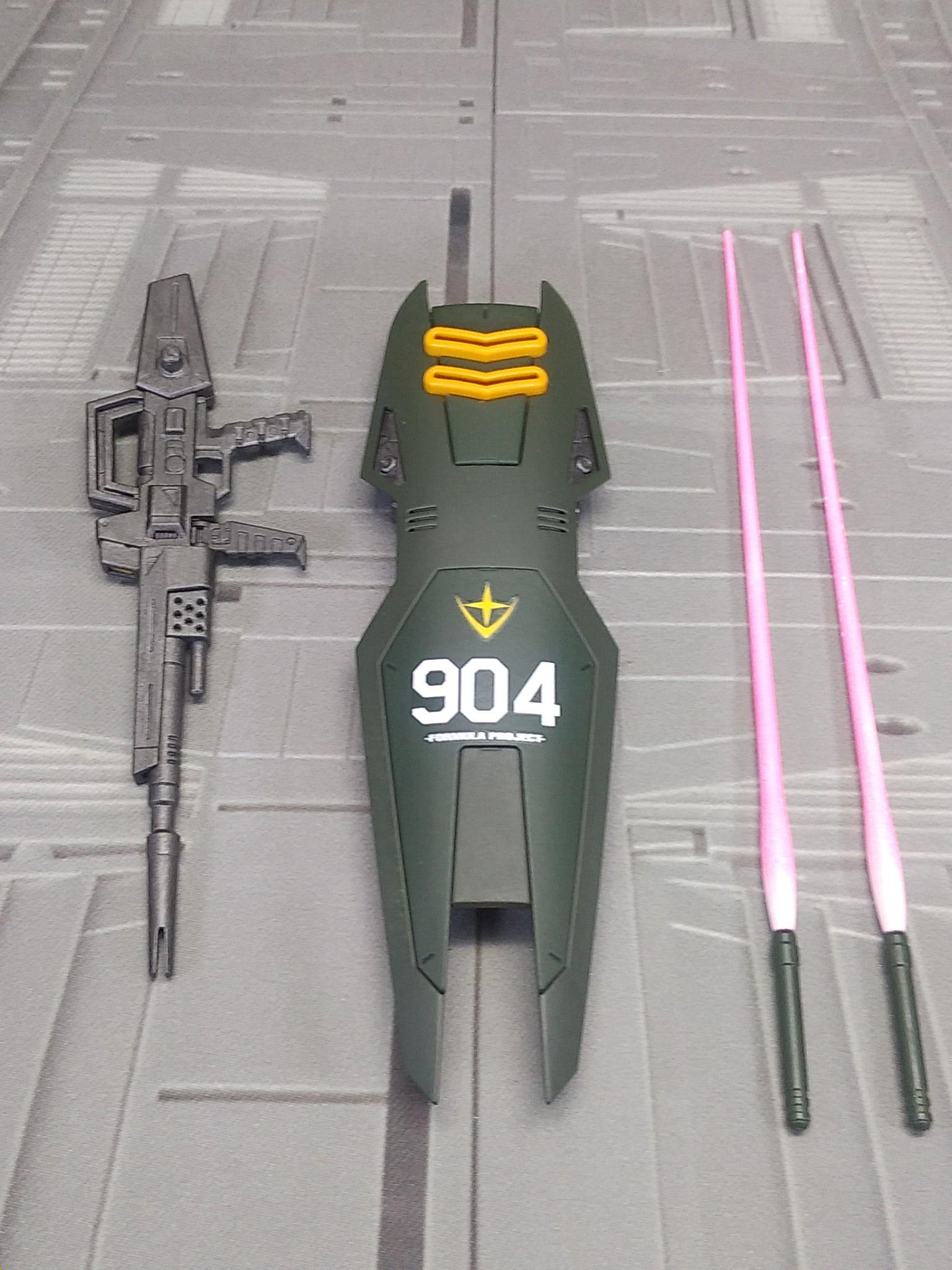 ビームライフルとシールド裏は焼鉄色で塗装。ビームサーベルはF90の物をガンダムマーカー蛍光ピンクで塗装後、根元部分にホワイトを吹き付けてグラデーションを入れています。