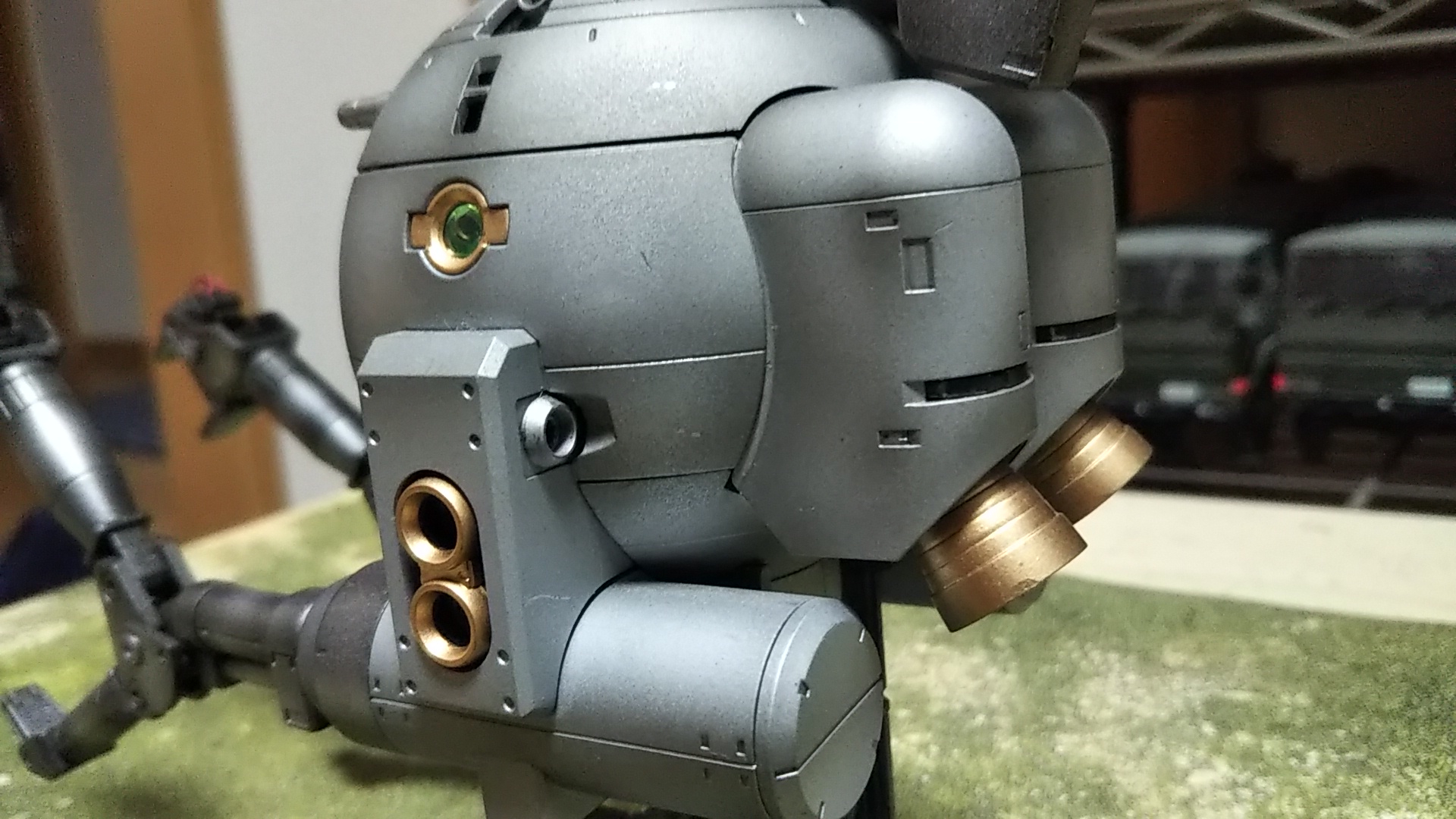 さてキットですが、MGボールプロショップ限定の川口名人仕様なるものです。名人のありがたい作例の真似をして金銀鉄?のメタリックカラーで球を塗ったものに、再度塗装として黒立ち上げのグラデーションかけております💦なお、いつもの正面、撮影忘れてました💦