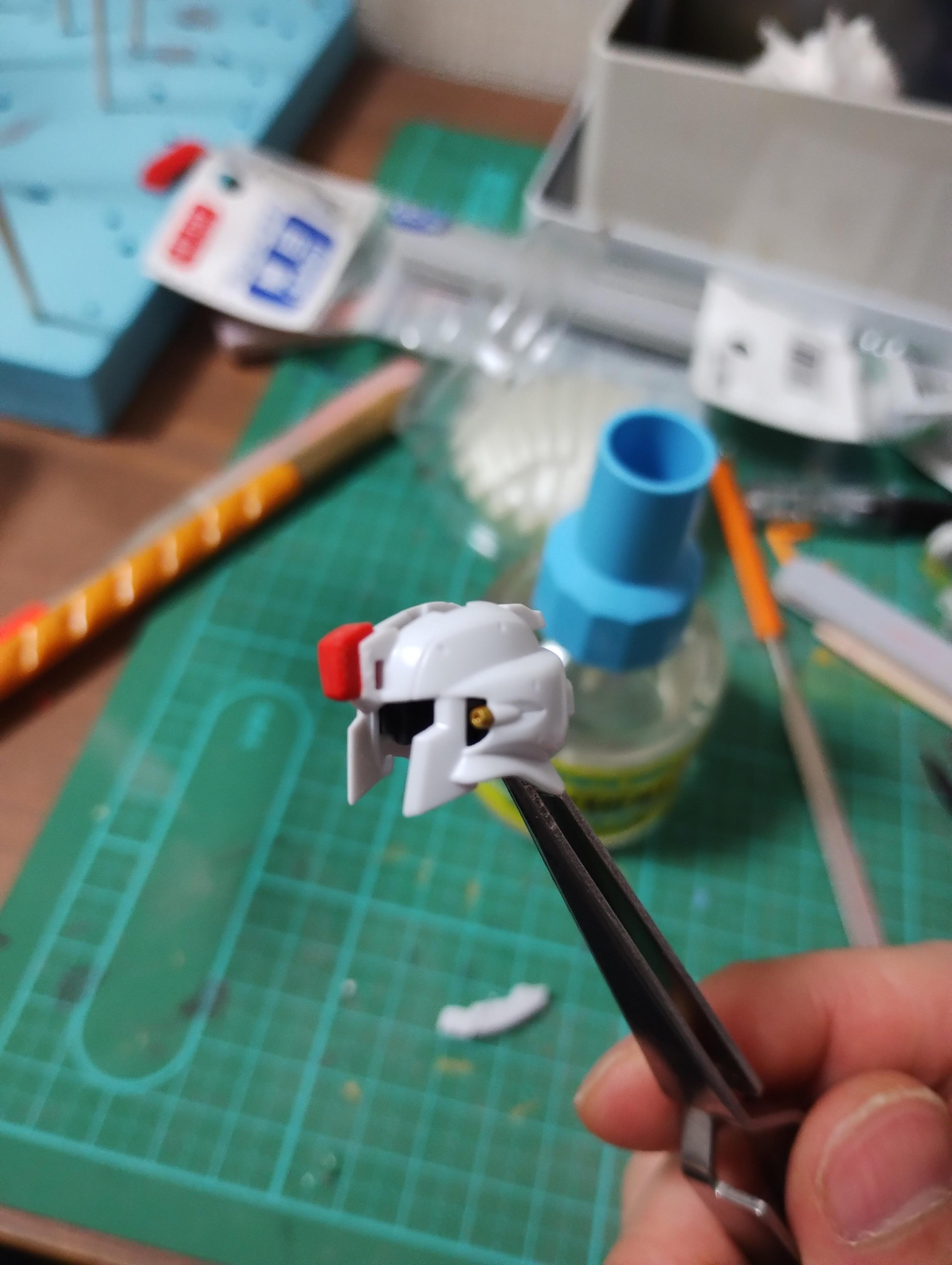 ちなみにヘッドパーツのアンテナ基部の赤いパーツなんですが、間違って捨ててしまい自作することに。プラ板削り出してなんとか作成。
