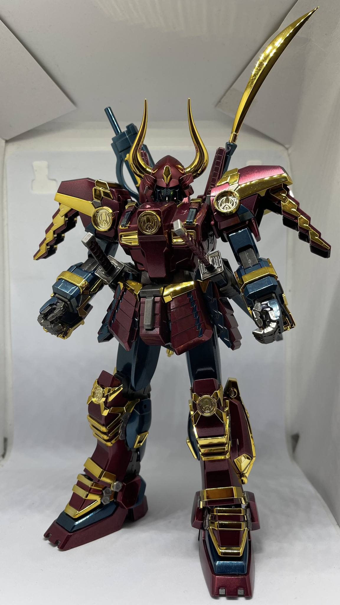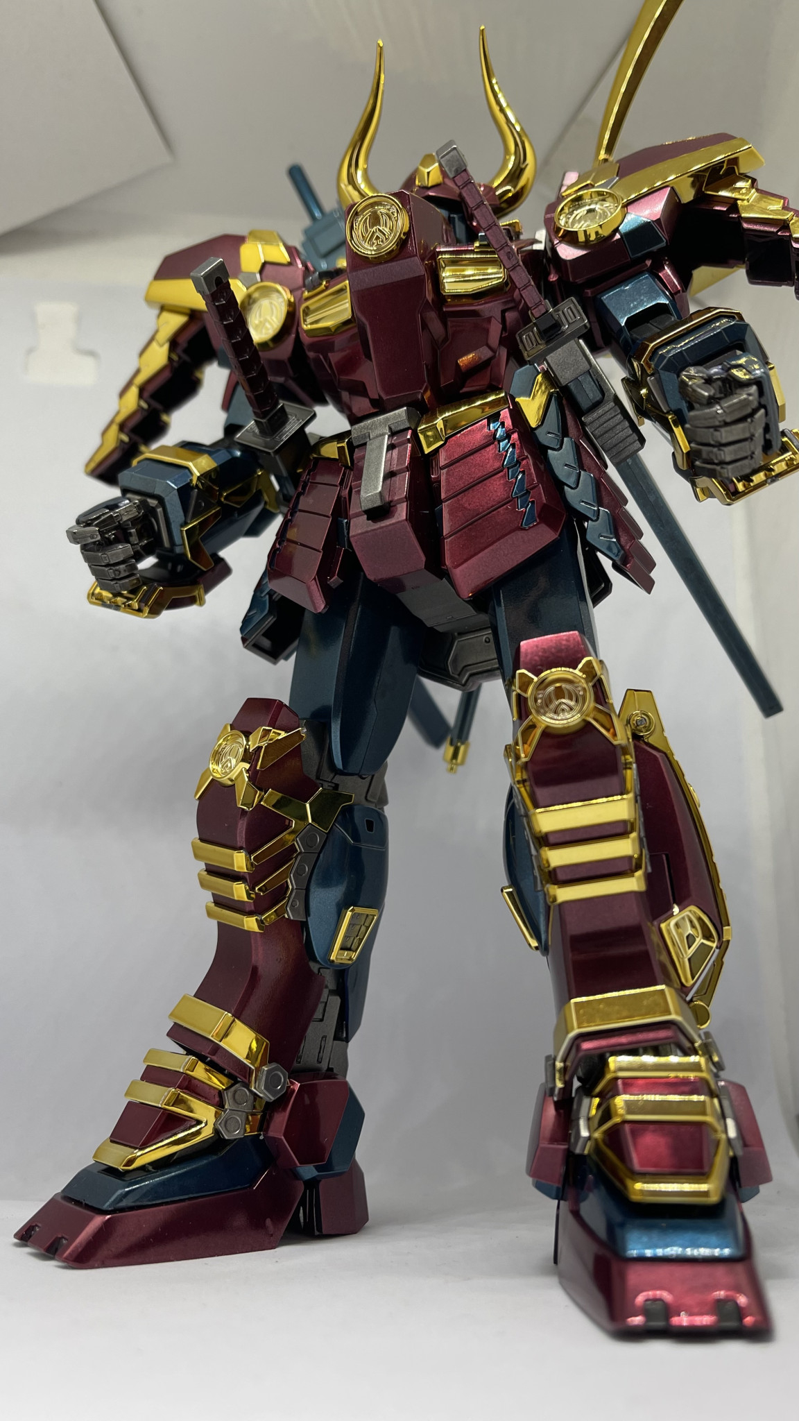 立ち姿です。赤や青に塗装したパーツと金メッキパーツが良い感じにマッチして良い仕上がりになりました。