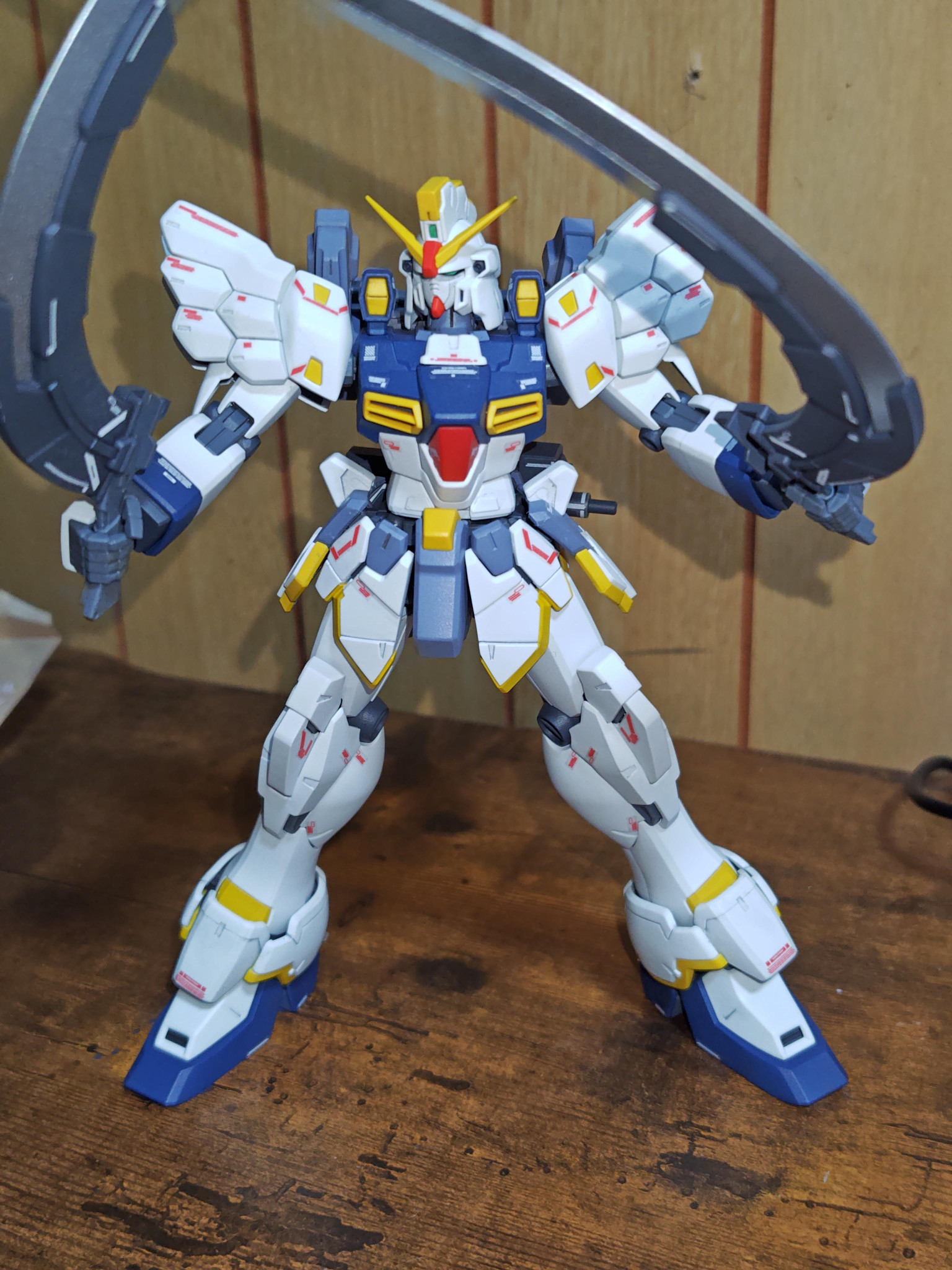 ガンダムマーカーエアブラシと筆塗りで全パーツを塗装して、デカール貼りと墨入れとつや消しをした作品。