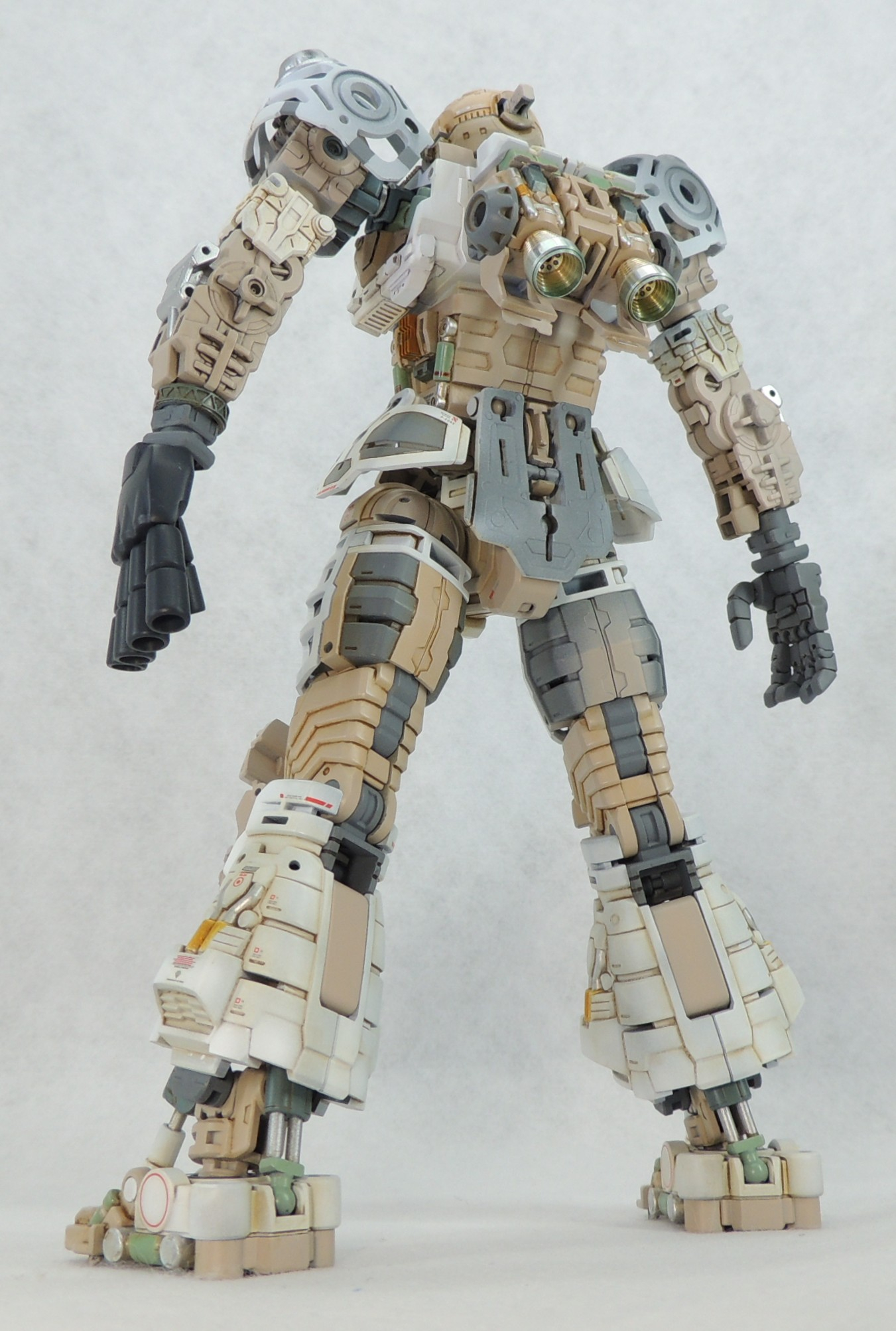 大腿部の前側、ひざ下、スネのサイド、足の甲の装甲を取り外したままとし、内部メカやフレームを露出させました。細かい塗り分けやマーキングにより、精密感のアップを狙いました。