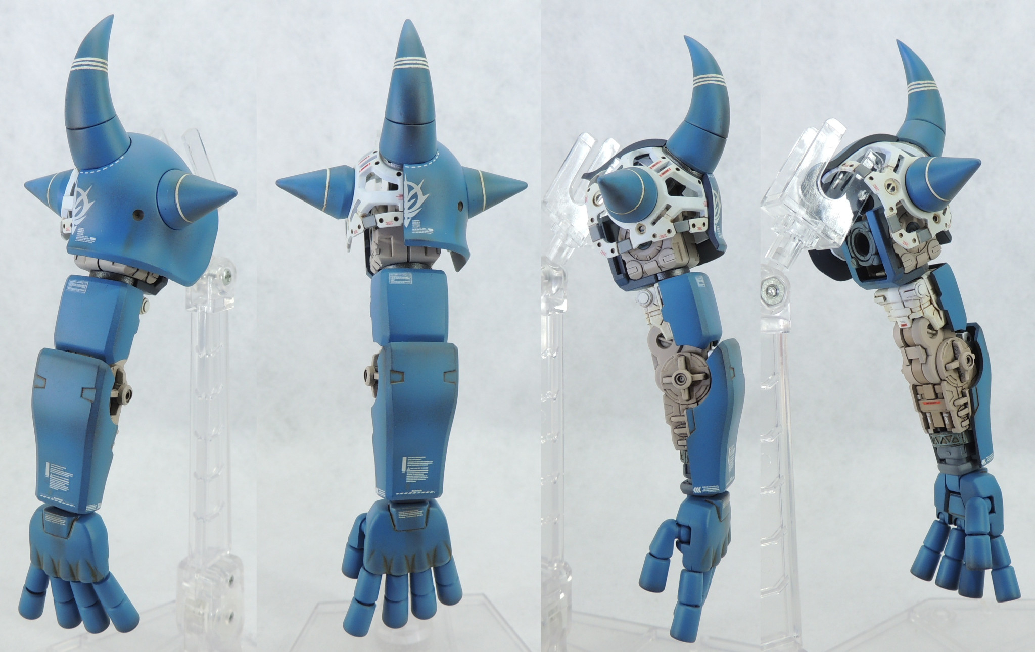 肩アーマーはスパイクをヤスリで先鋭化し、中央で切り離して内部フレームが見えるように加工しました。ピンバイスによる開口やスジボリ、金属部品の取付等によりディティールを追加しています。フィンガー・バルカンにはHIQPARTS製の「イージーガンマズル(1.5mm)」を取り付けました。