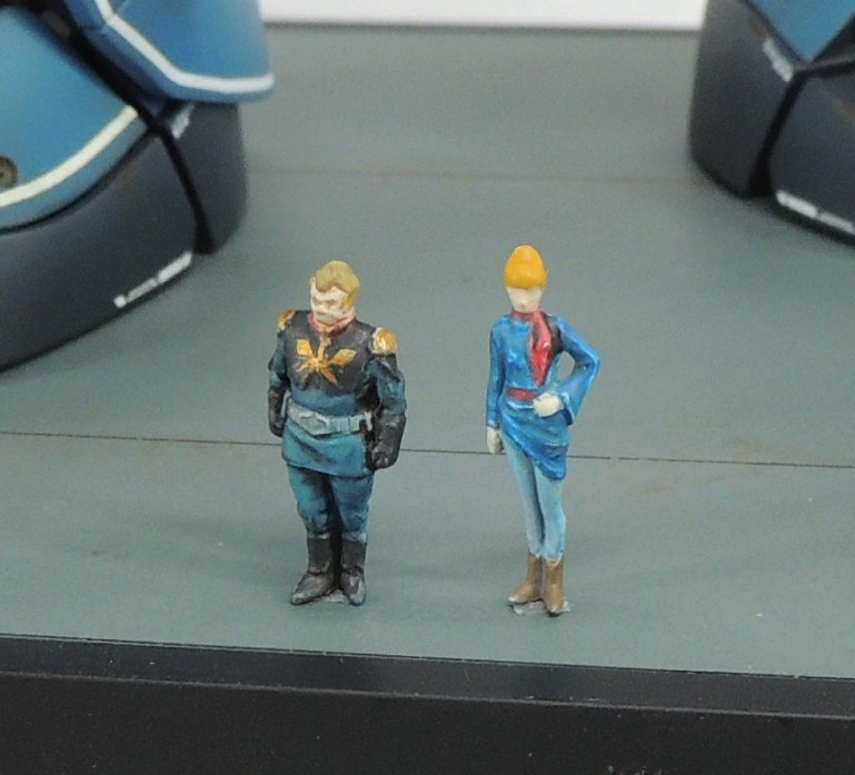 製作したフィギュアは、ランバ・ラル、クラウレ・ハモン、ランバ・ラル(ノーマルスーツ/着座)の3体で、無改造のまま使用しました。パーティングラインをヤスリで丁寧に消し、極細の面相筆によりラッカー塗料で塗装後、エナメル塗料のダークブラウンでスミ入れしています。遠目で見てもキャラクターが判別できる素晴らしい造形であり、ベースに配置することでグフの巨大感を演出できると思います。