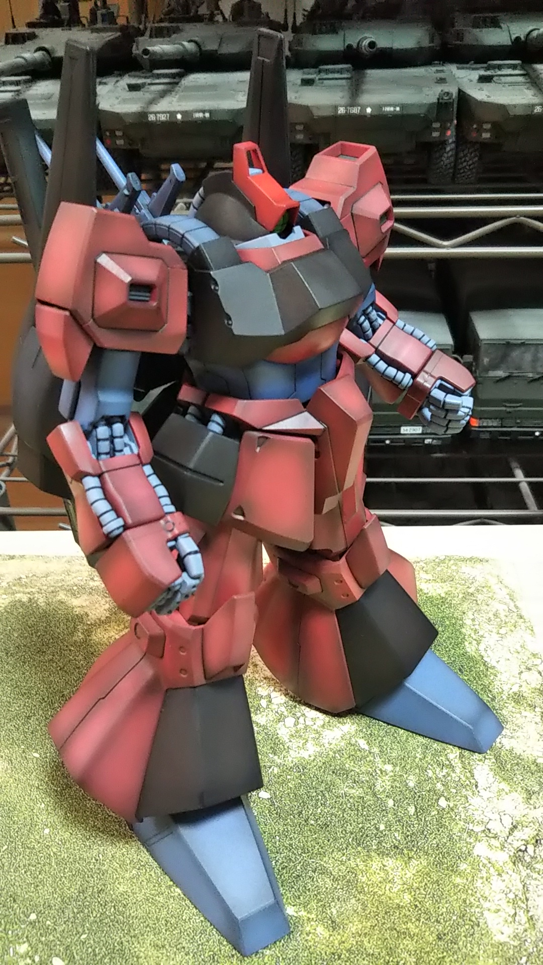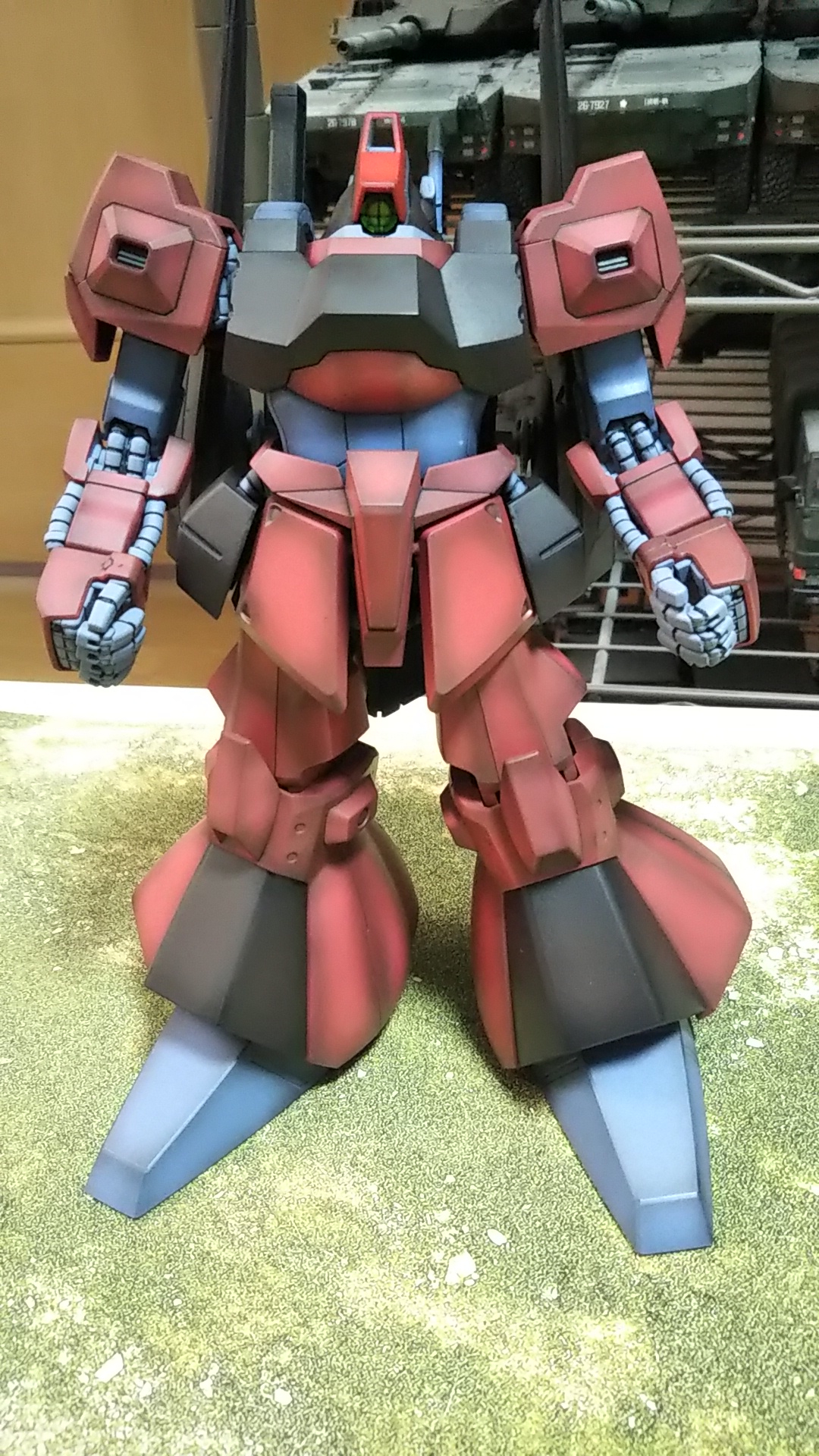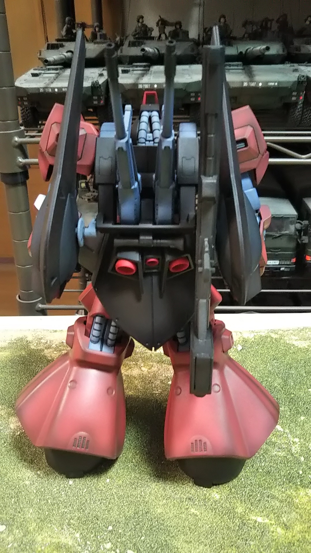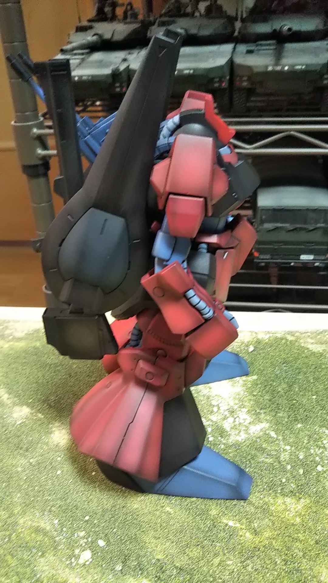 正面💦今回再塗装に当たってシャア専用機ということを意識してハイライトに若干ピンク要素を入れております、あと黒立ち上げを強めにしております💦