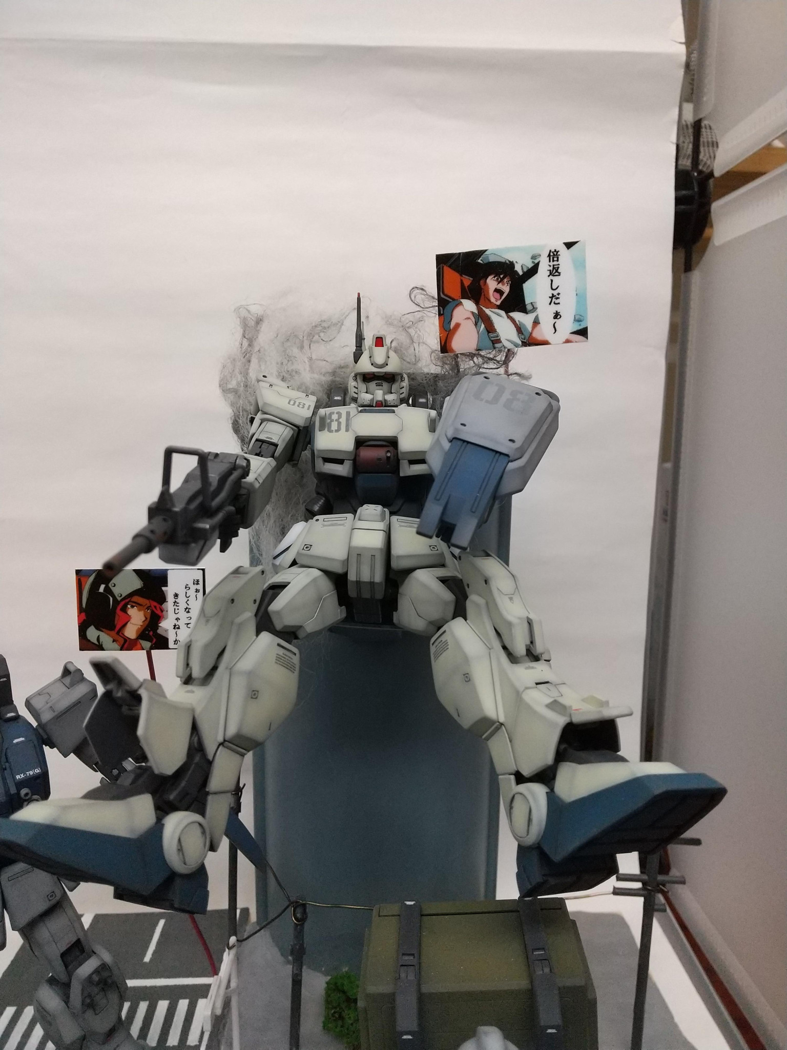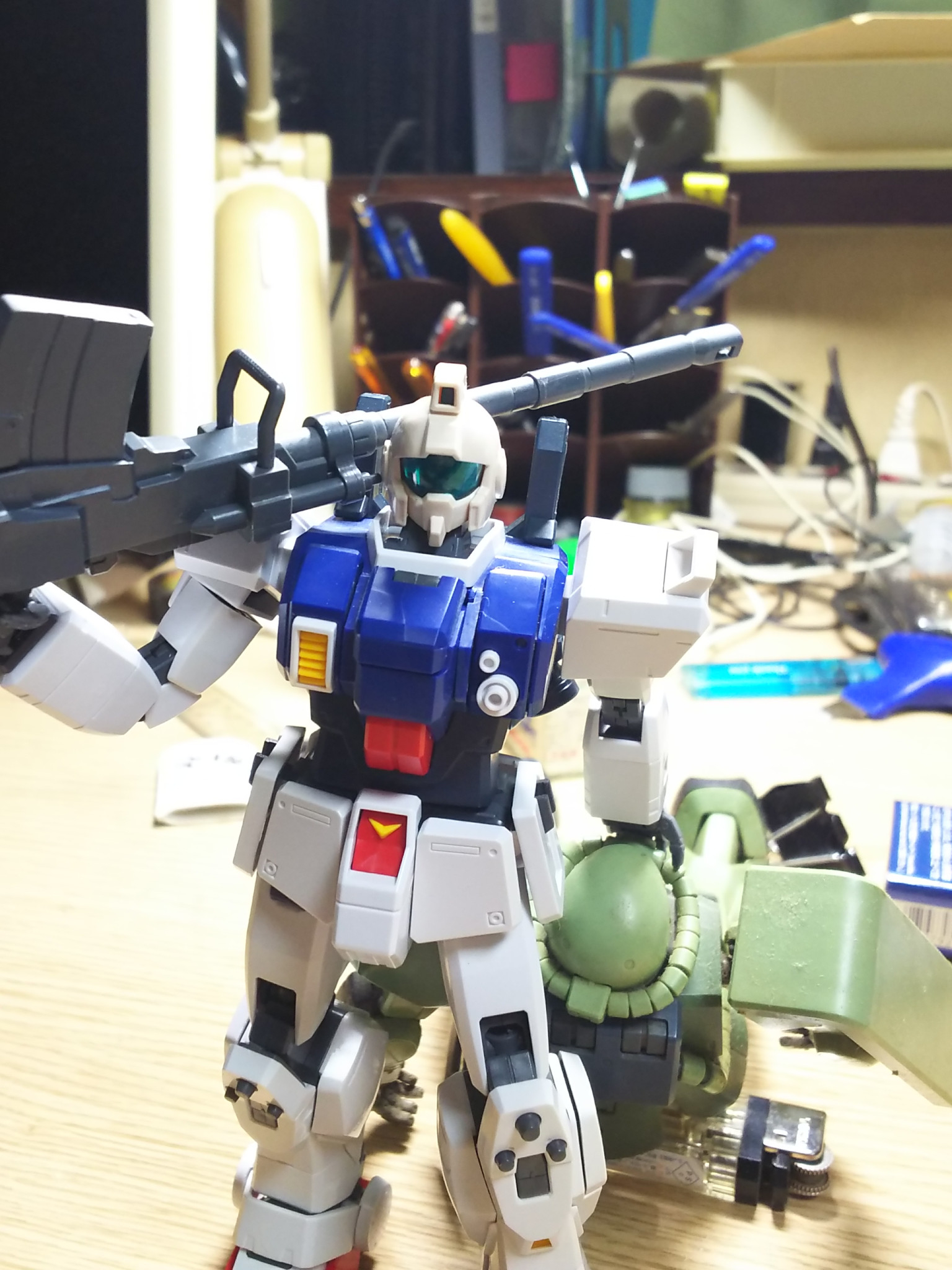 陸戦型ガンダムはヒザ立ちの足関節(膝立による肩の水平ライン出し、通常斜めにらっちゃう)・180mmダブルハンドの為の肩と肘関節の可動域拡張加工・物理的に盾は短いため傾斜のある地中にぶっ刺してスタンドさせる方式としました。