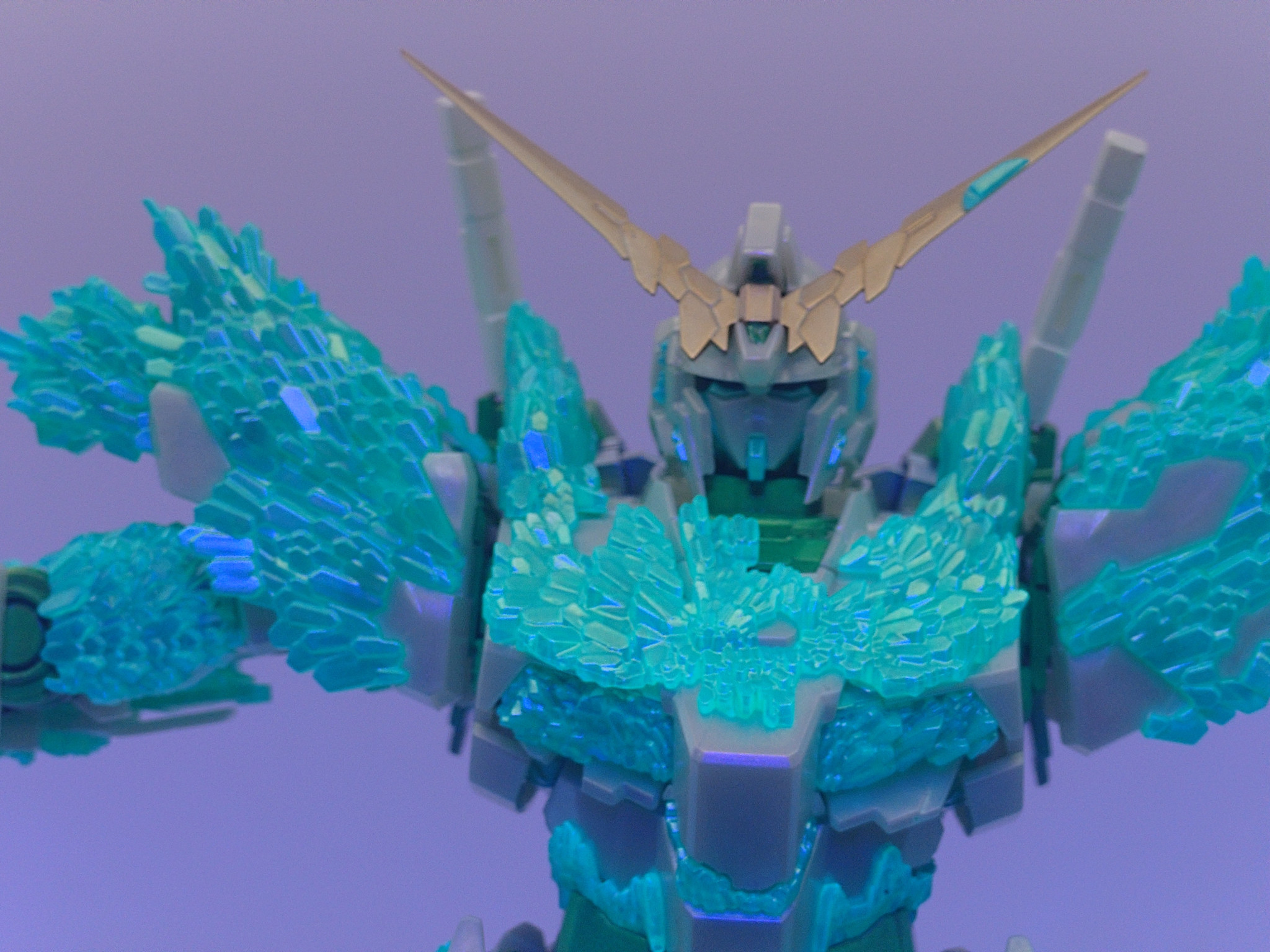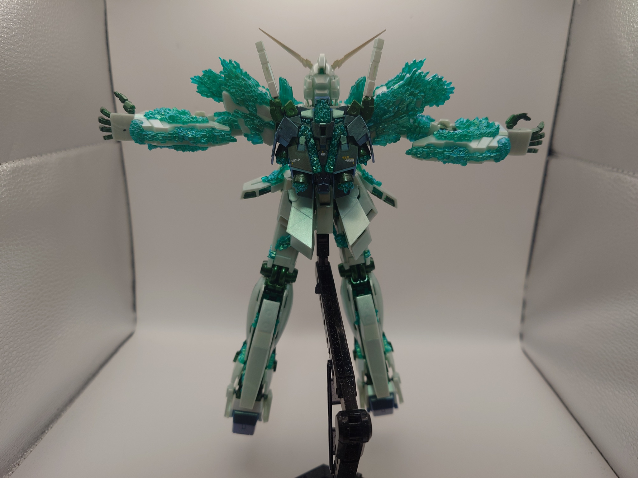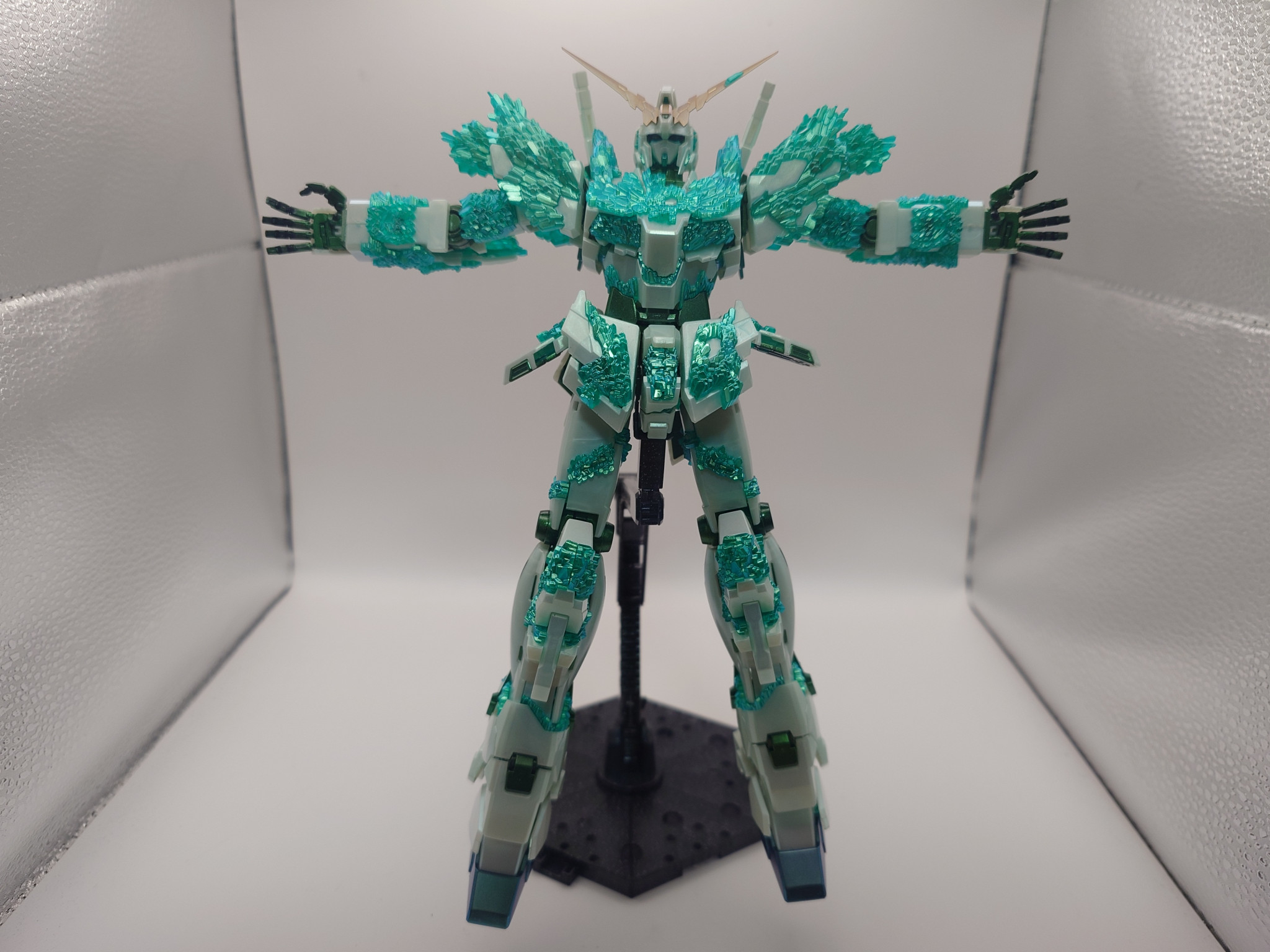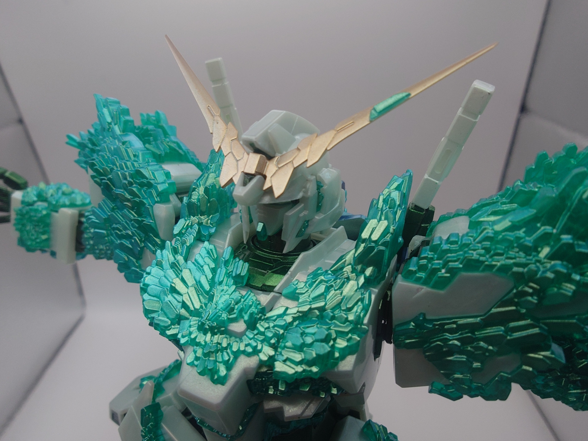 今回はユニコーンガンダム(光の結晶体)の全塗装です。外装と結晶体は成形色の上からプリズムブルーグリーンを塗装しただけですが、労力に対してかなり満足度の高いものになりました✨