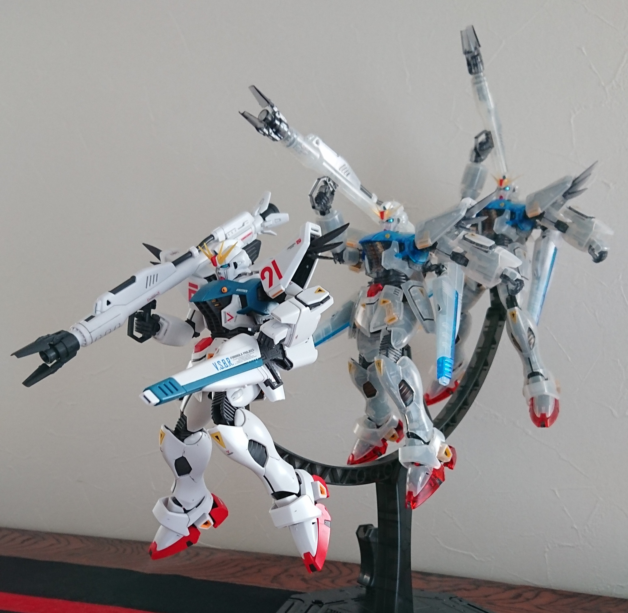 昔は普通にプレバンで買えたのでクリアを2体買って残像を表現。ドライデカールは初挑戦でした。キレイに「F91」が貼れたときは感動しました