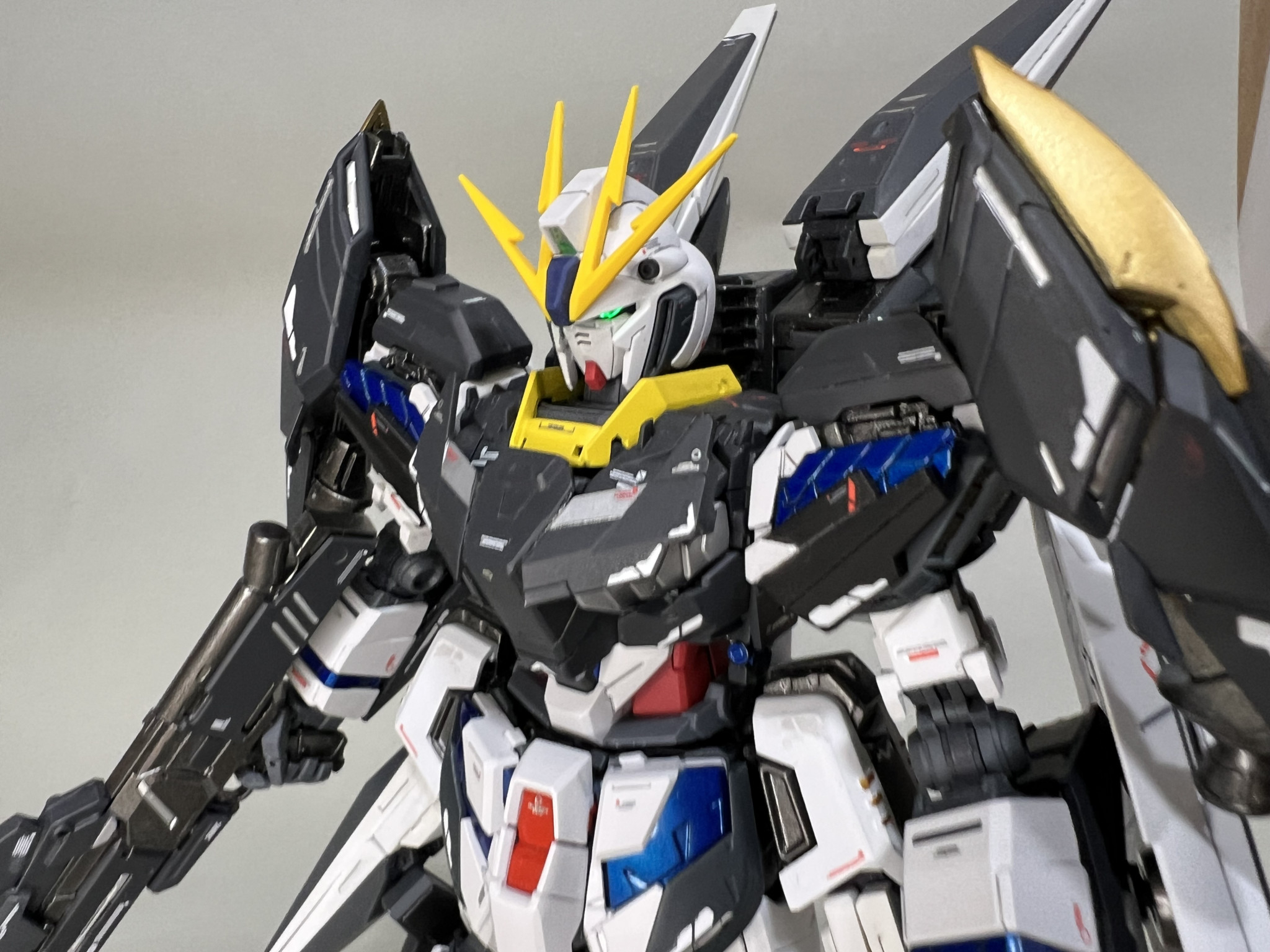 全体的なカラーは暗色系にまとめたかったのとνガンダムとは差別化したかったのでサイコフレームを青色に、ところどころ金を差し色に使っています。