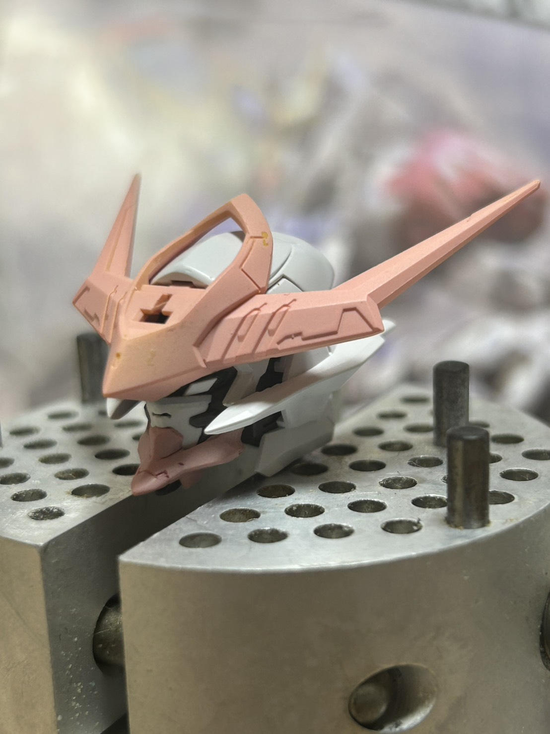 フェイスパーツをプラ板で大型化、ツインアイを作り直し。