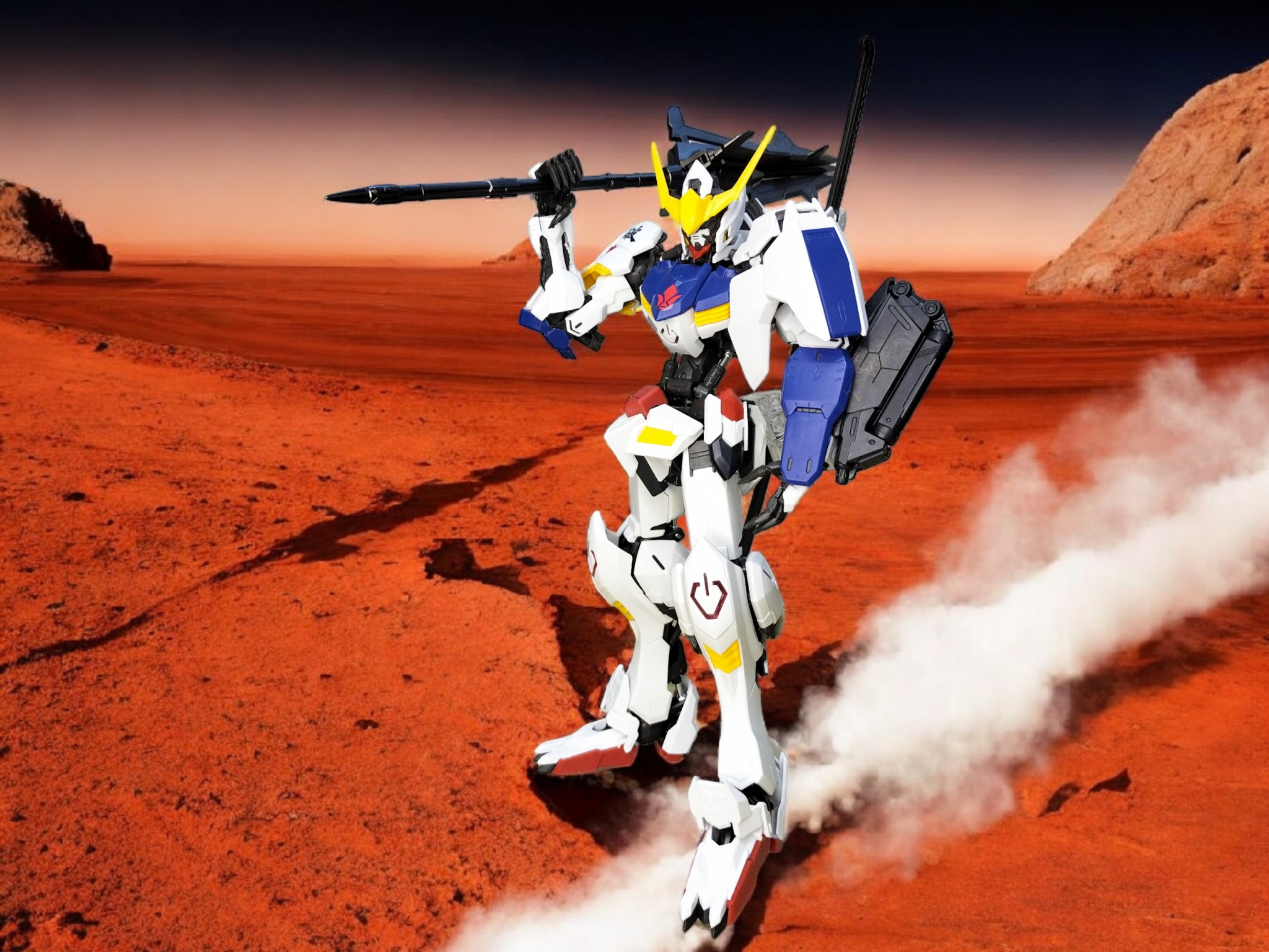 バルバトス火星の台地に立つ!!恰好良いですが、ミカはキャラ的にわざわざ赤マント付けて決闘とかしなさそう(gundam-kao5)
