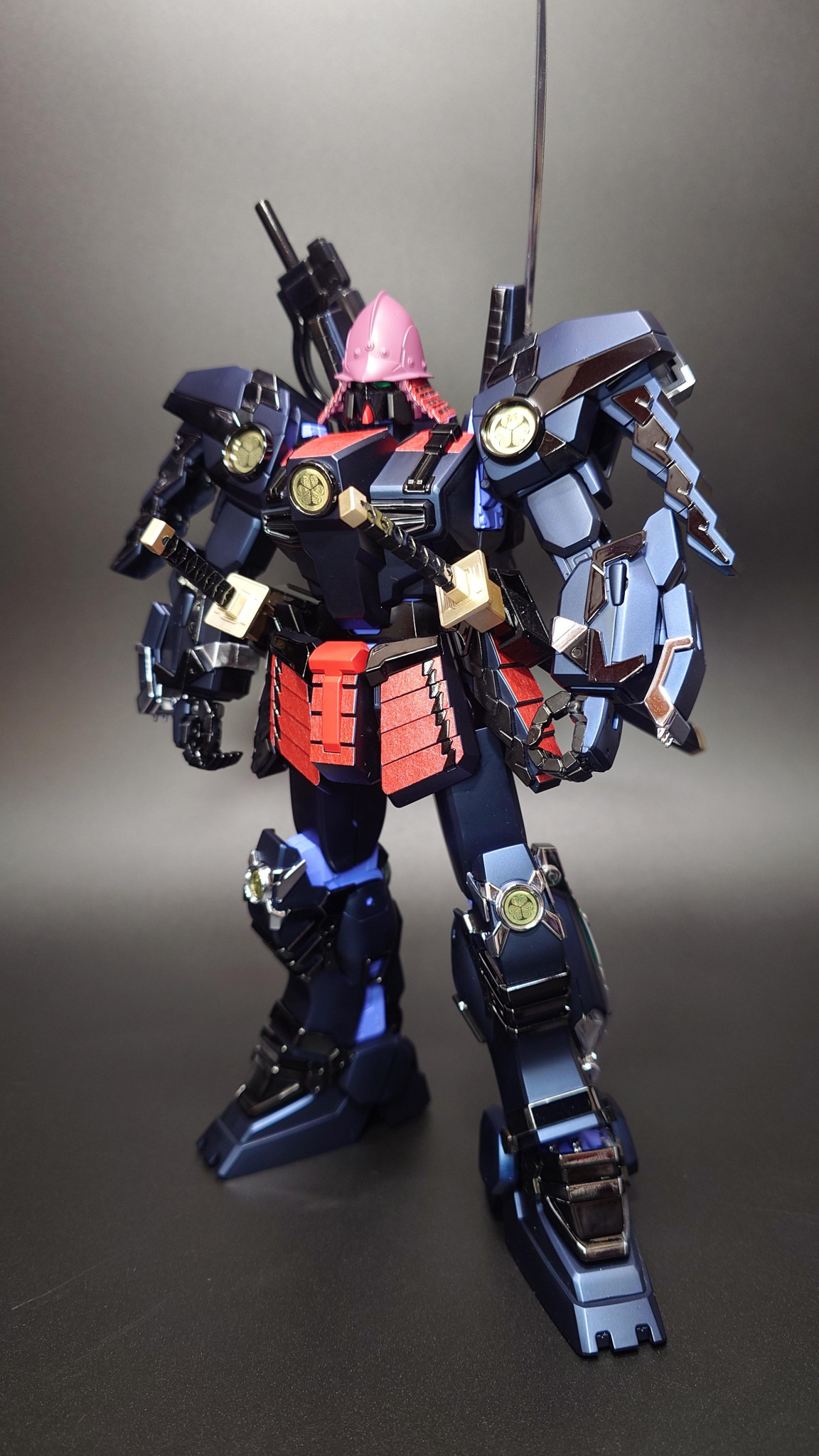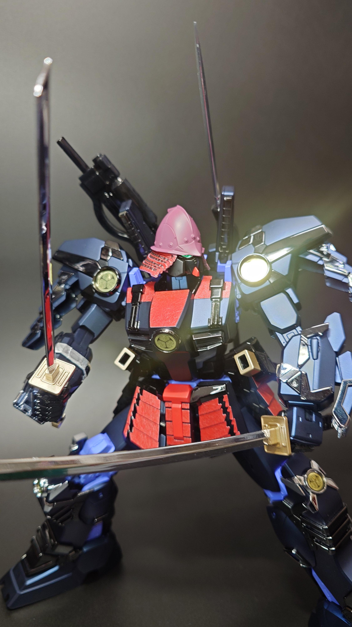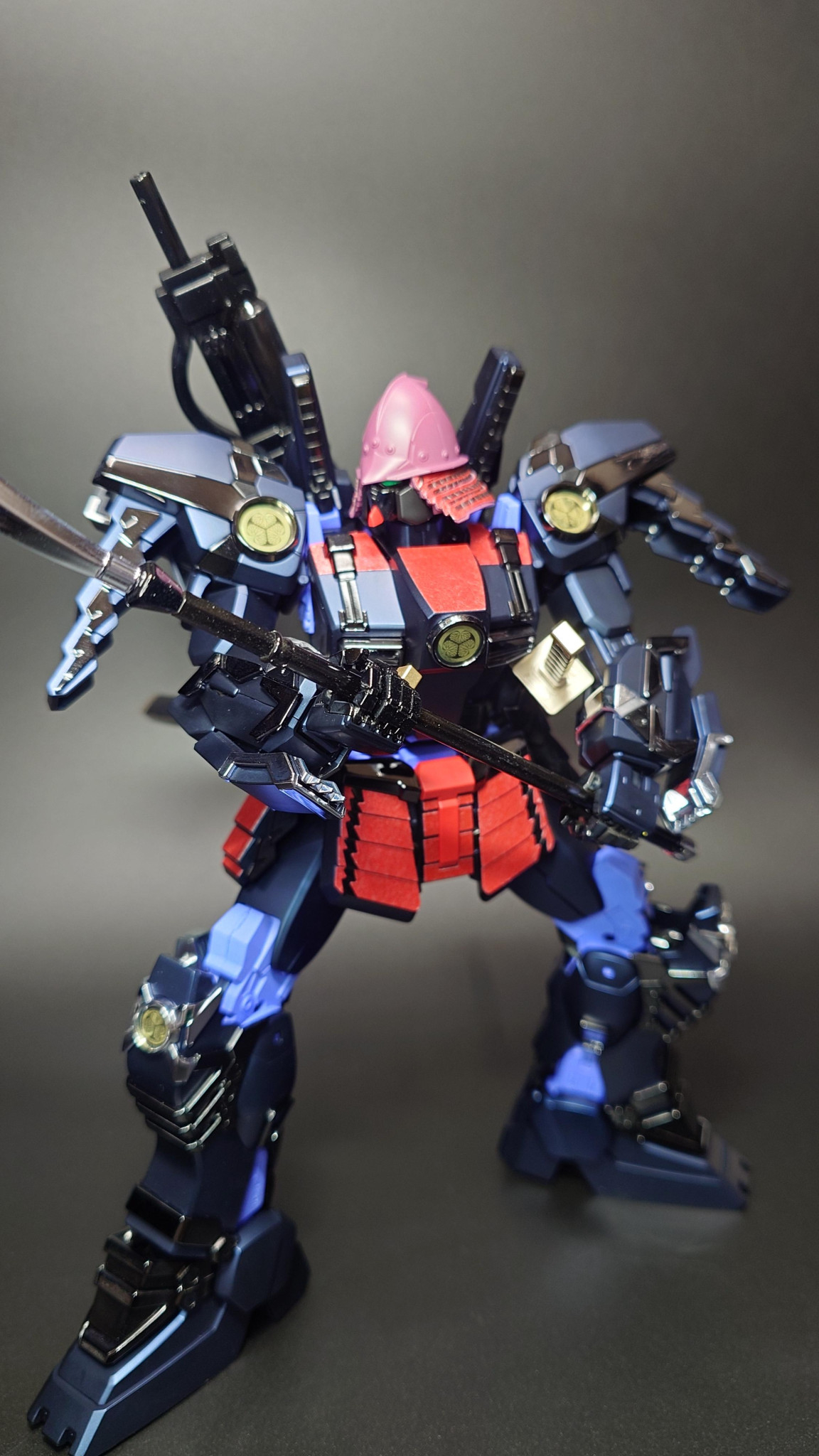 武者ガンダムMk-II徳川家康 南蛮胴具足Ver.全塗装です。メインカラーはガイアのプリズムブルーブラック半光沢仕上げで、黒パーツはガイアのアルティメットブラック光沢、フレームはガイアNAZCAカラーのミリオンブルー艶消し、兜はガイアの焔小豆、赤はクレオスのハーマンレッドになります。製作途中右前腕内側のパーツ紛失、同場所のメッキパーツ割れ等、心折れる場面がありましたが、目立たない場所だったので良かったです。腰部のシールが繊維質がある物で良い質感でした。