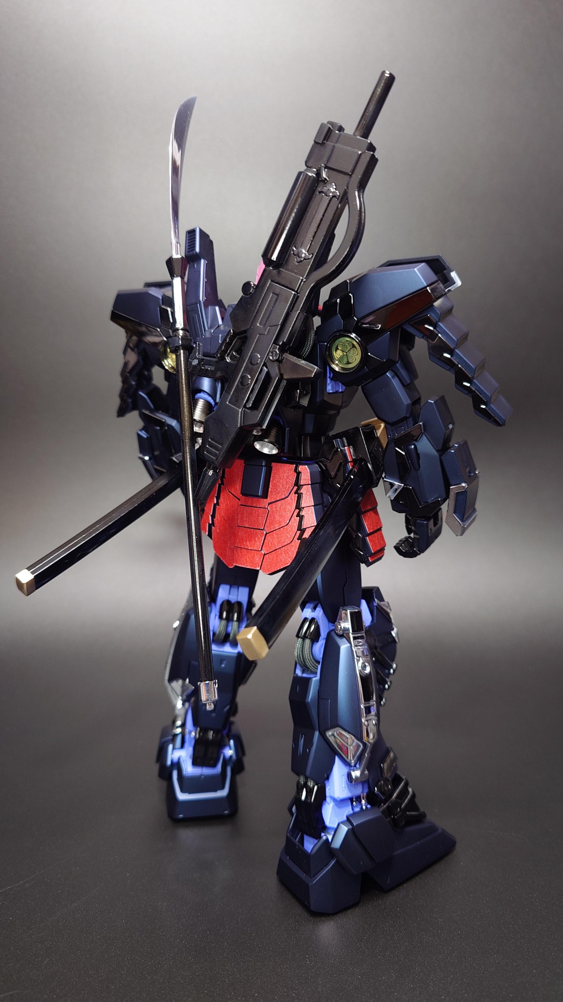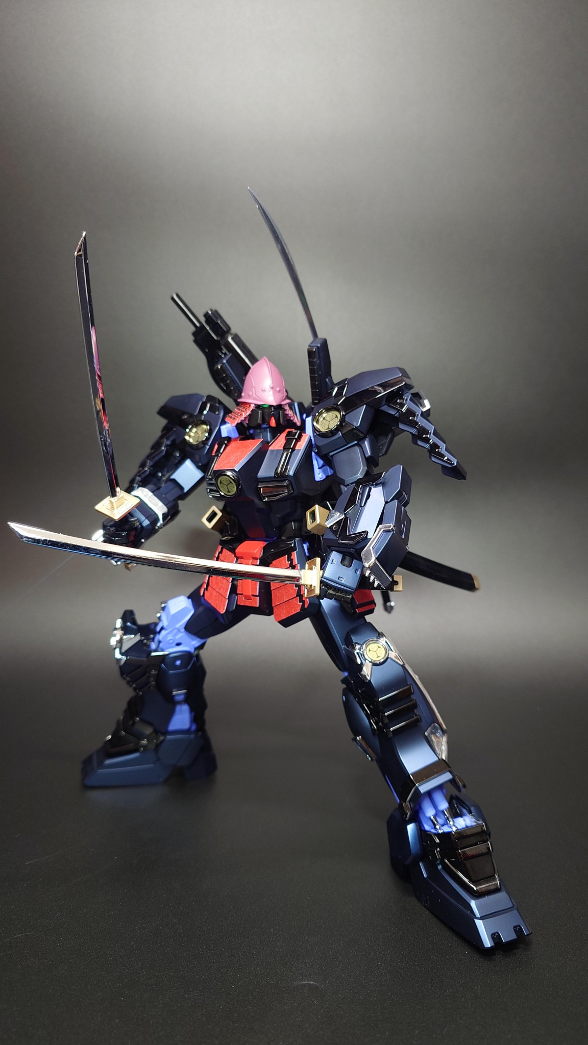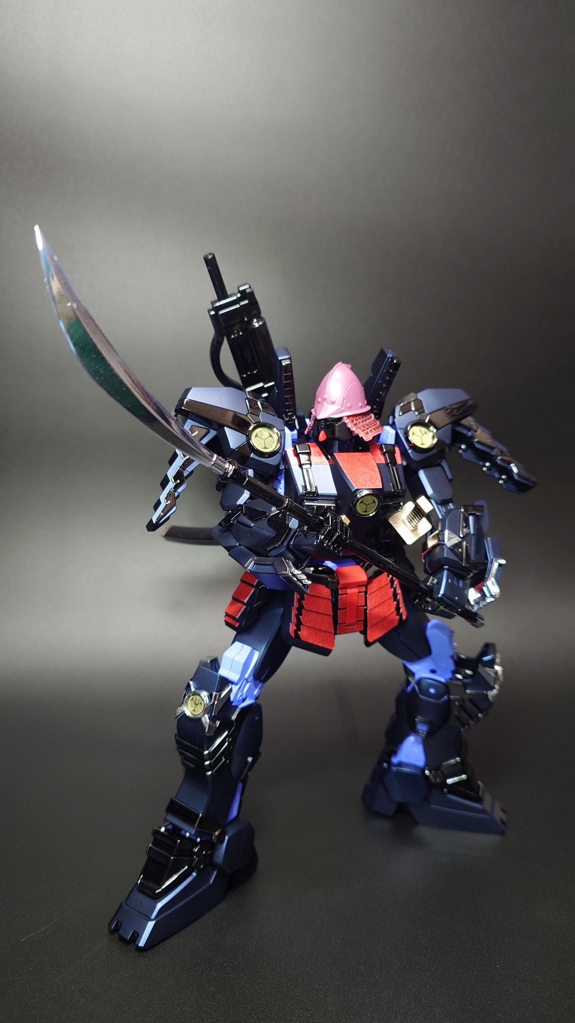 武者ガンダムMk-II徳川家康 南蛮胴具足Ver.全塗装です。メインカラーはガイアのプリズムブルーブラック半光沢仕上げで、黒パーツはガイアのアルティメットブラック光沢、フレームはガイアNAZCAカラーのミリオンブルー艶消し、兜はガイアの焔小豆、赤はクレオスのハーマンレッドになります。製作途中右前腕内側のパーツ紛失、同場所のメッキパーツ割れ等、心折れる場面がありましたが、目立たない場所だったので良かったです。腰部のシールが繊維質がある物で良い質感でした。