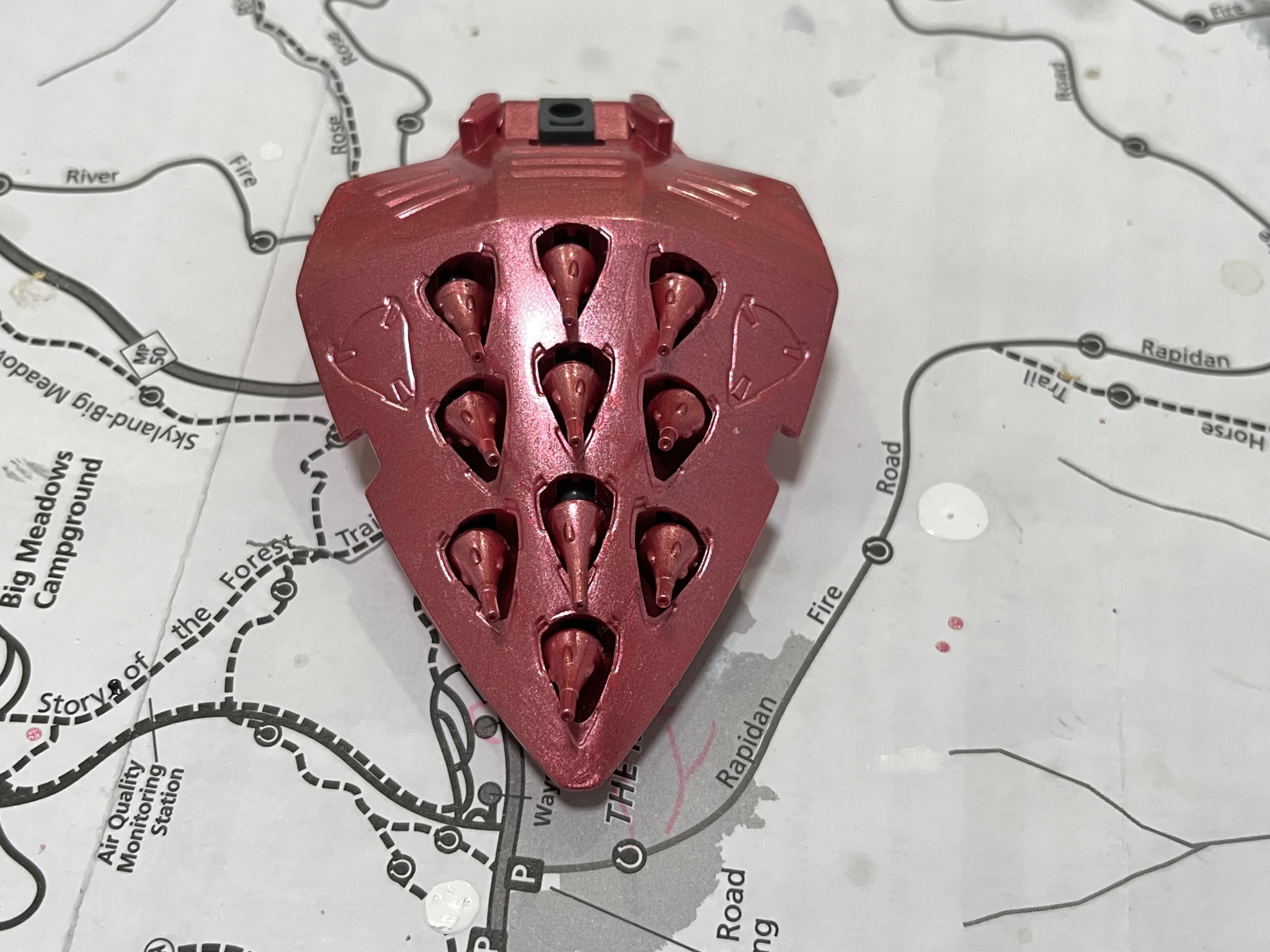 肩の裏側の塗り分けを頑張りました。12基のスラスターが肩だけに装備されています。その逆に言えば、両肩が破壊されると機動力を全て失ってしまうでしょうか。