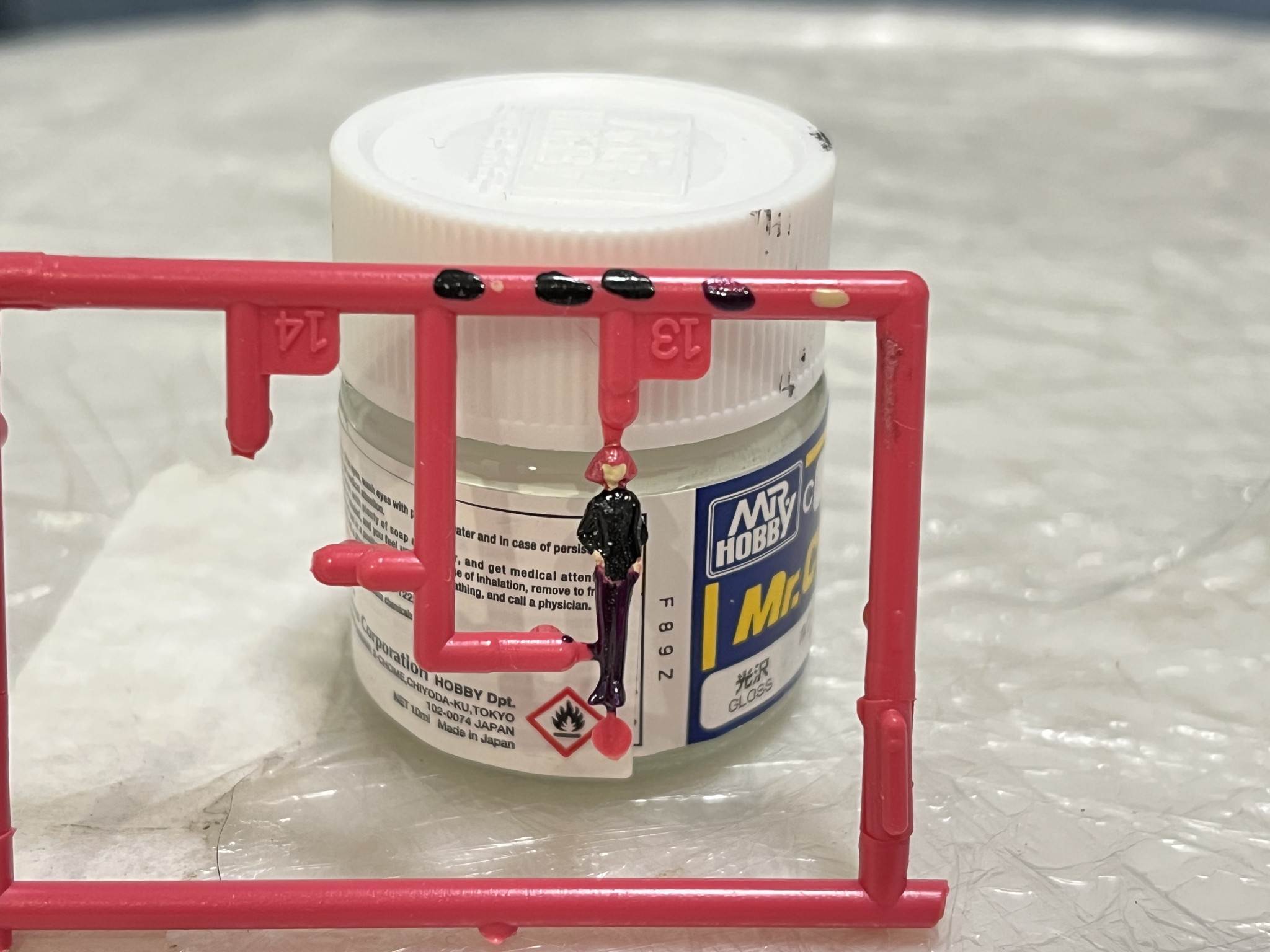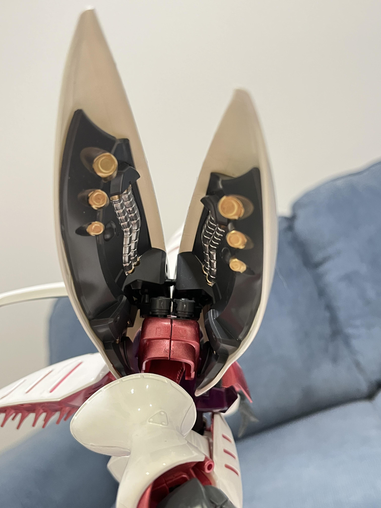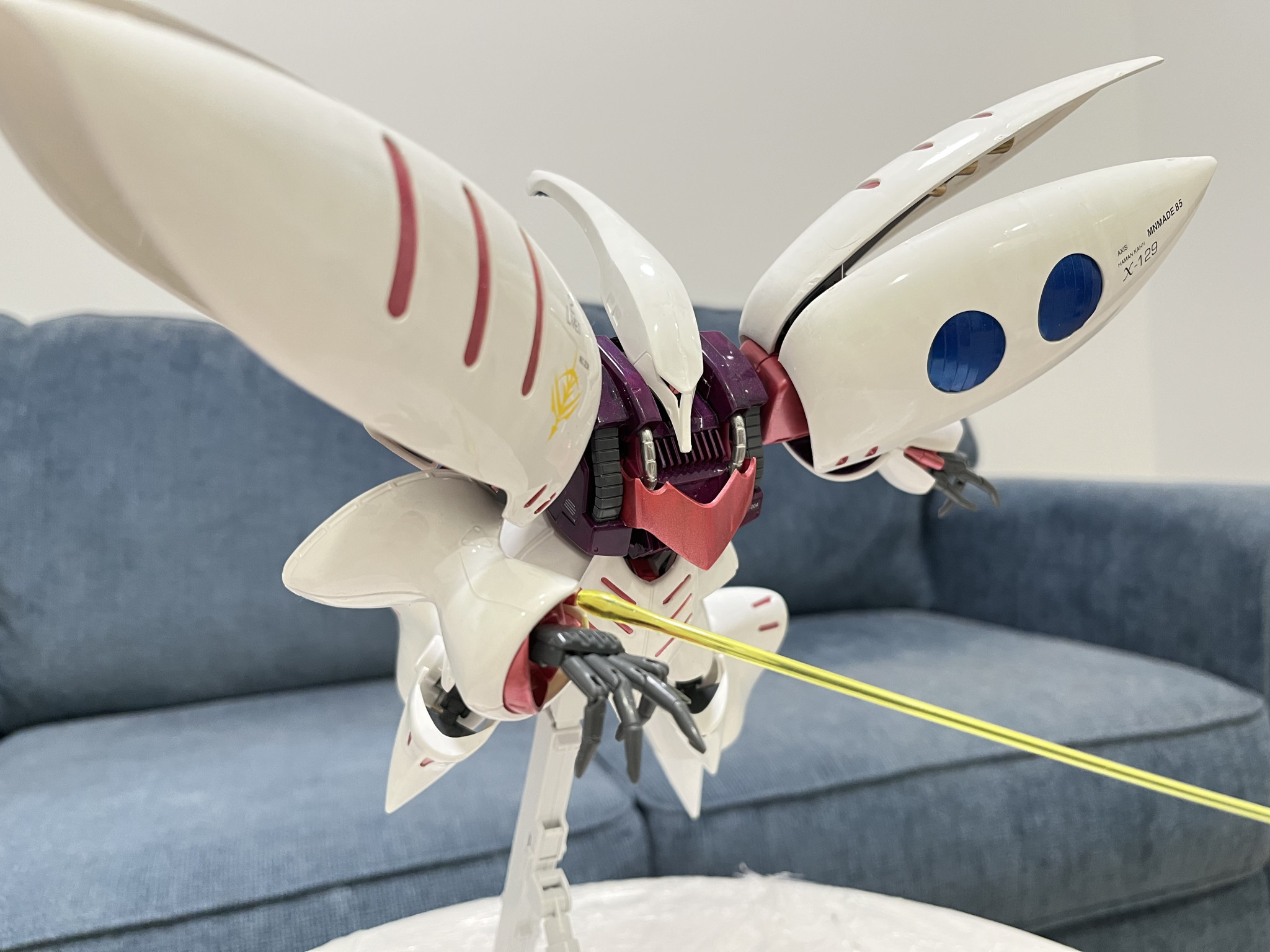 白はMr.Hobbyの1番光沢白とアメリカ製のパール白を1:1という比率で調色しました。ムラが目立ったので、羽根のような肩パーツをはじめ何度も塗り直しました。写真では少しの黄色に近いものに見えますが。