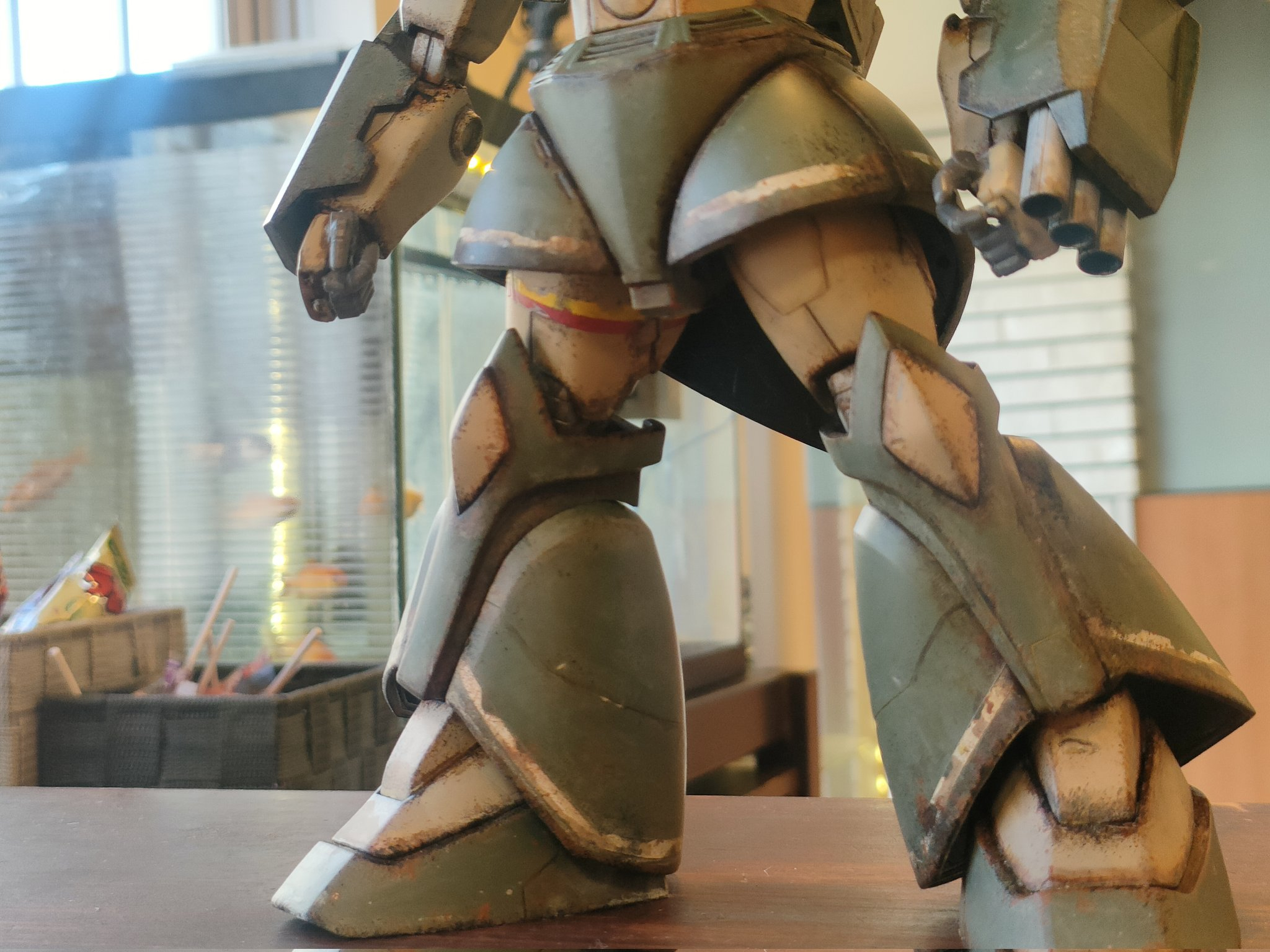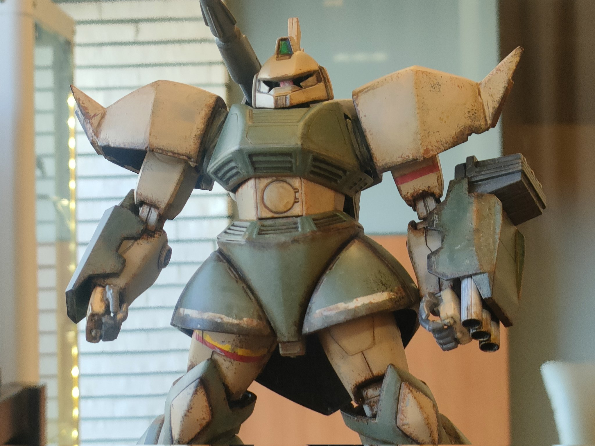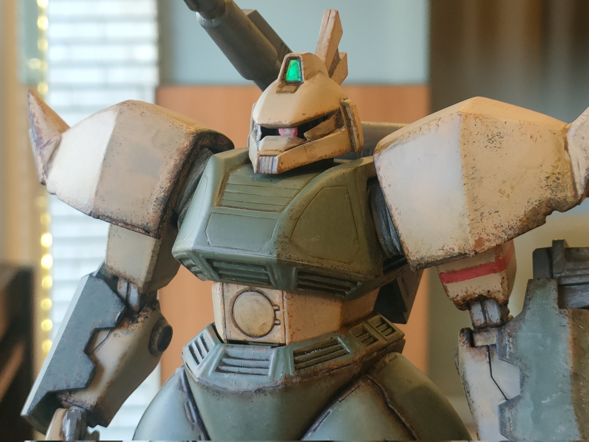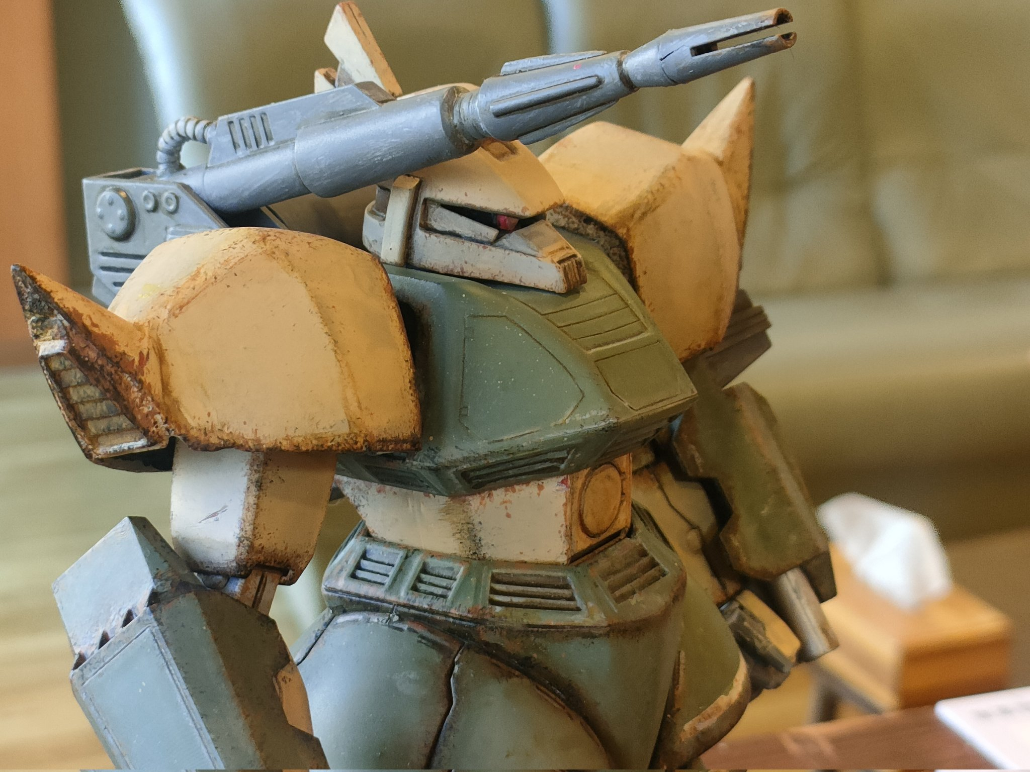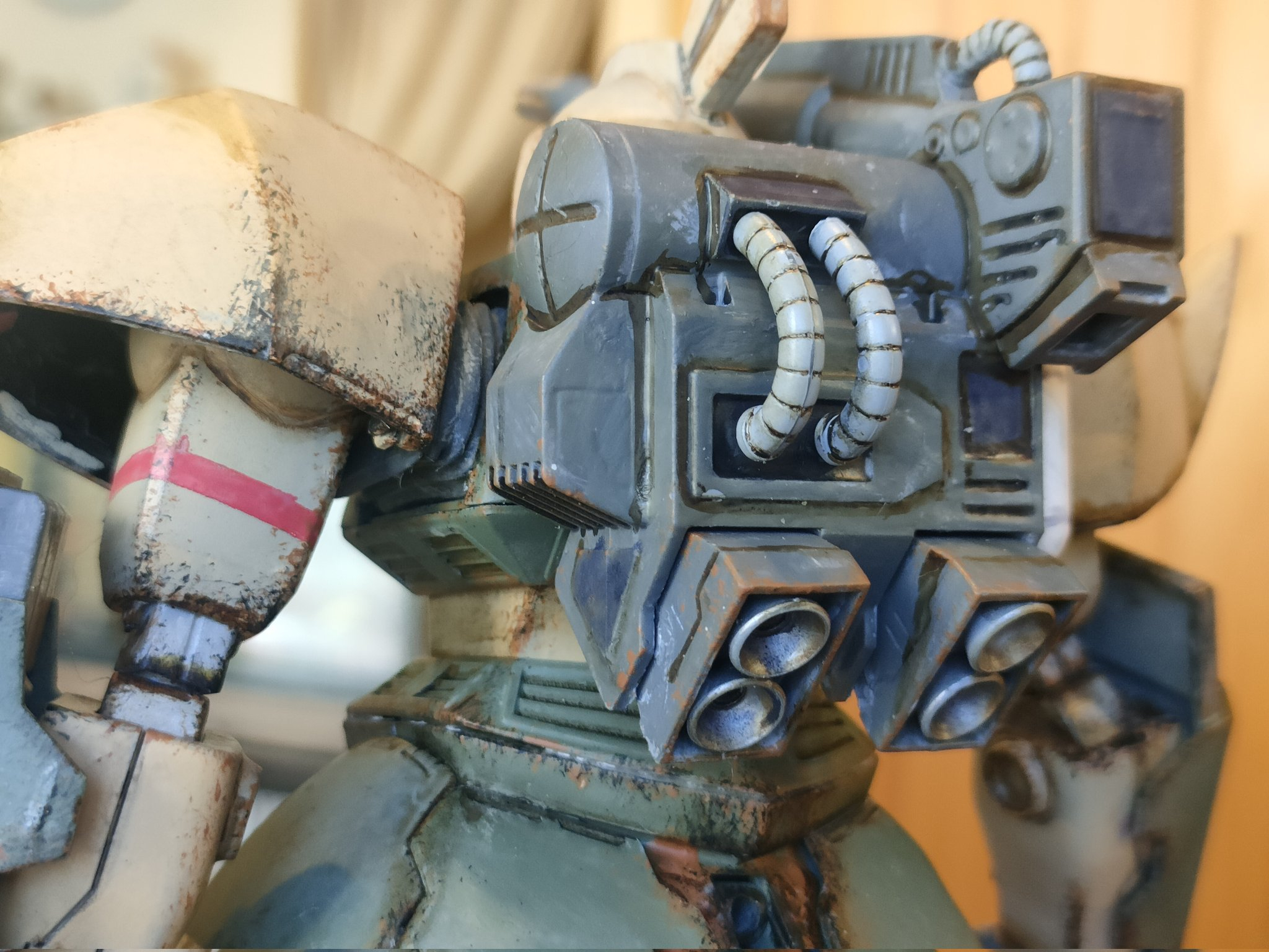 最近は手間を掛けて作る事が多かったので、今回はウェザリングでサクッと仕上げです。でも個人的にMSV世代という事もありウェザリングは楽しいですね。中々カッコ良いと思います。頭部センサーはラピーテープです。レジンで固めようかと思ったのですが、UVライトが行方不明なので止めました…