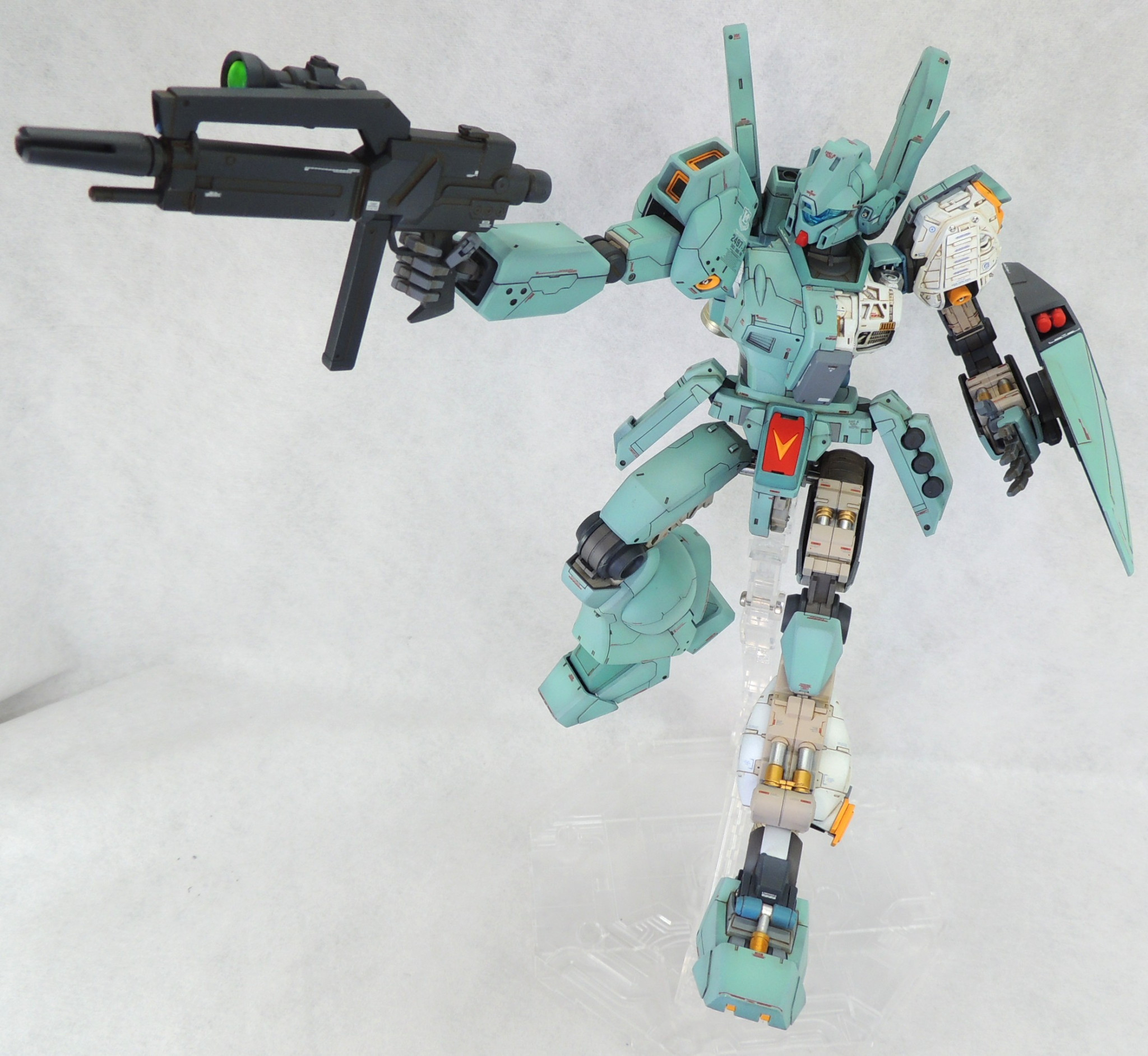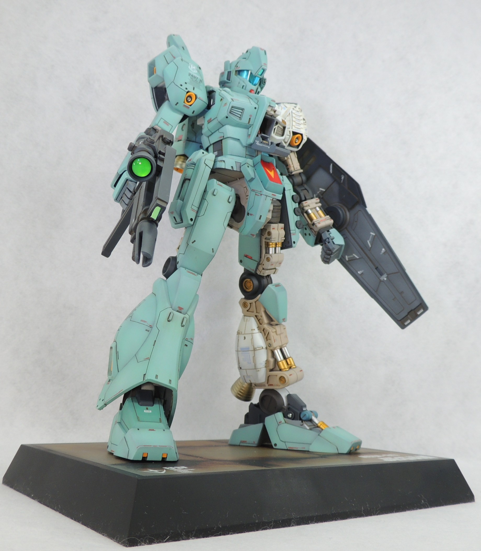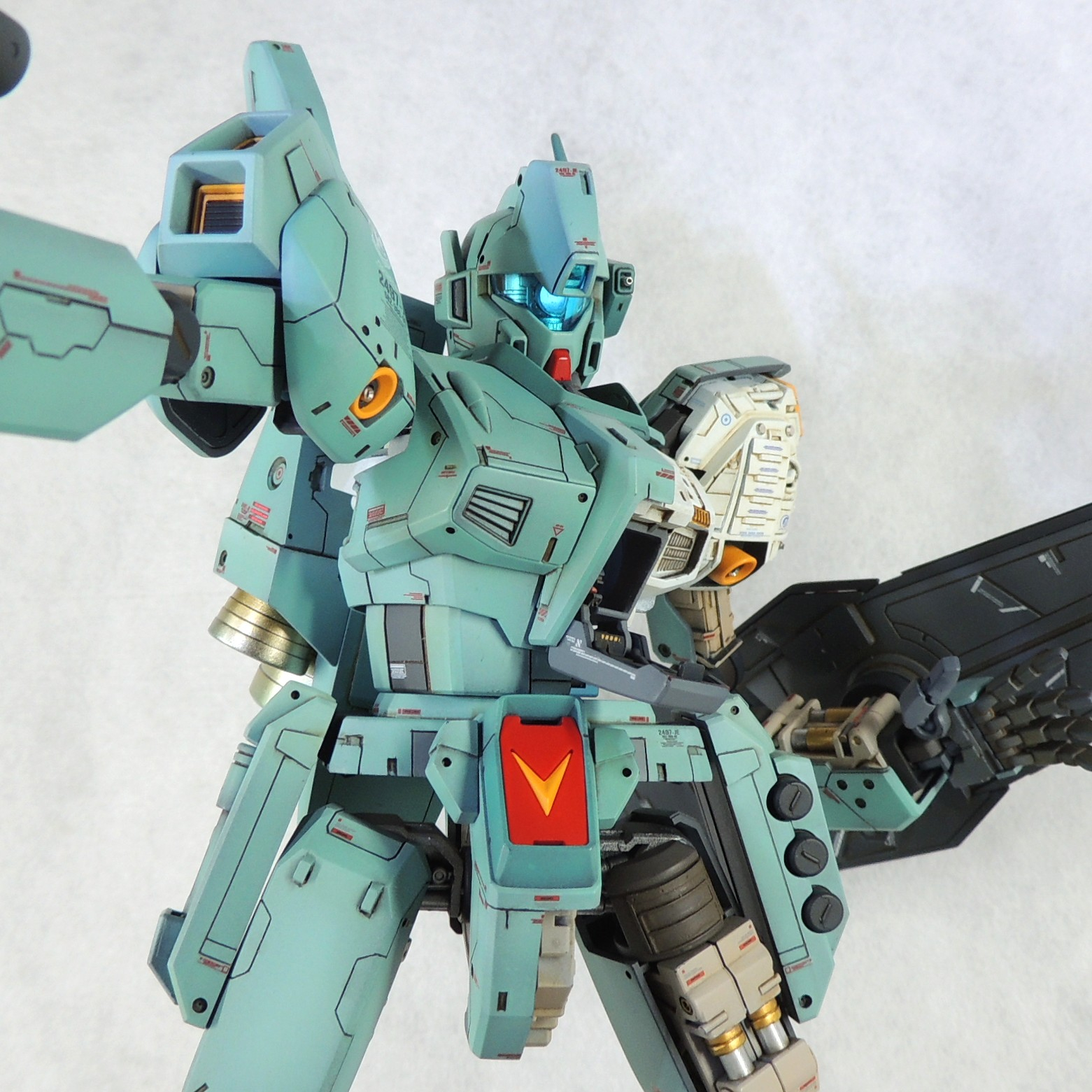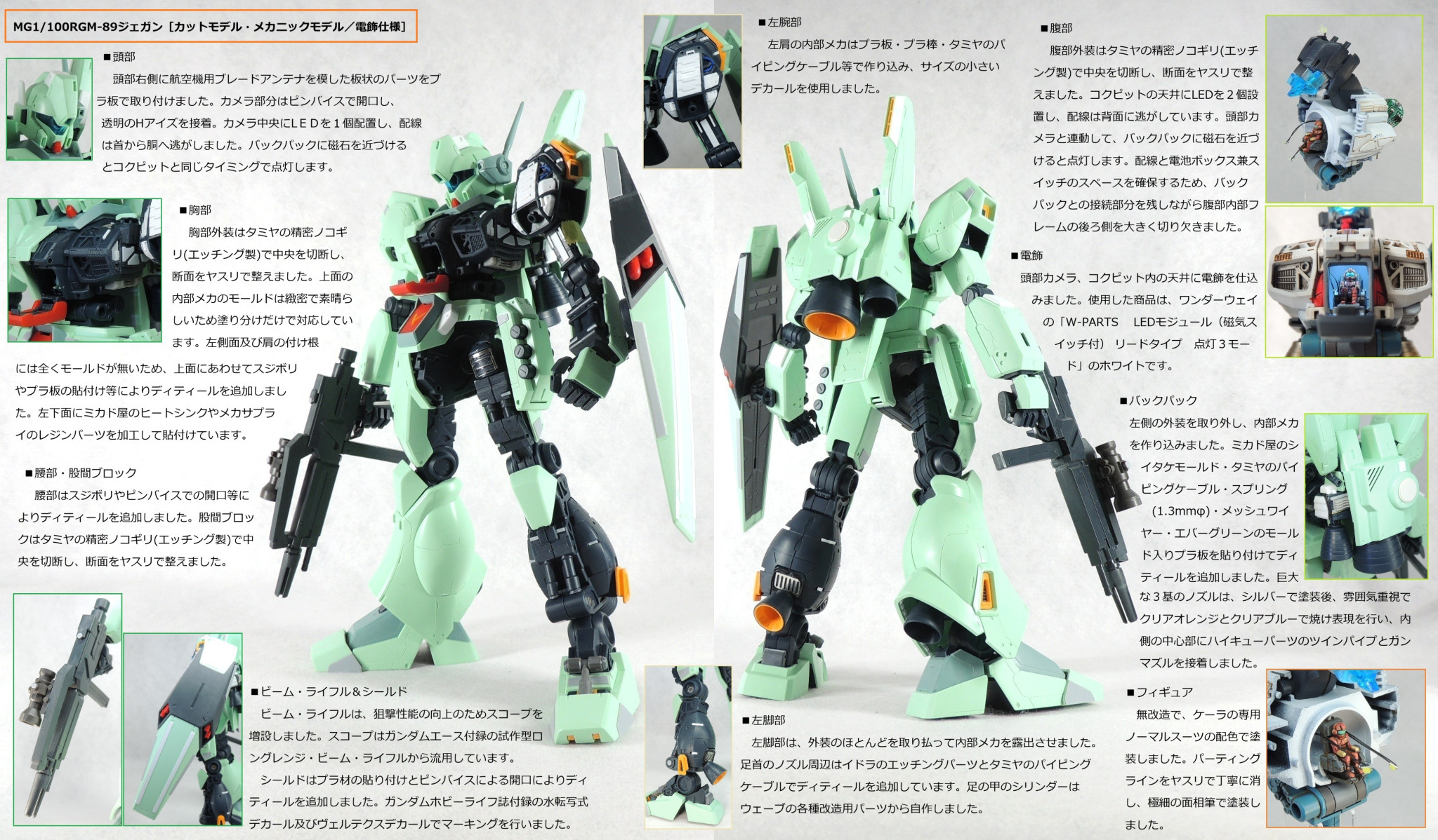マスターグレードのジェガンに、カットモデルやメカニックモデルのテイストを盛り込み、さらに頭部とコクピットに電飾を仕込んで完成させました。ロンド・ベル隊の熟練パイロットの一人である、ケーラ・スゥ中尉機として製作しました。実戦経験豊富なケーラからのオーダーとアストナージの愛情?により、基本装備と武装を一部カスタム化された機体にしてみました。