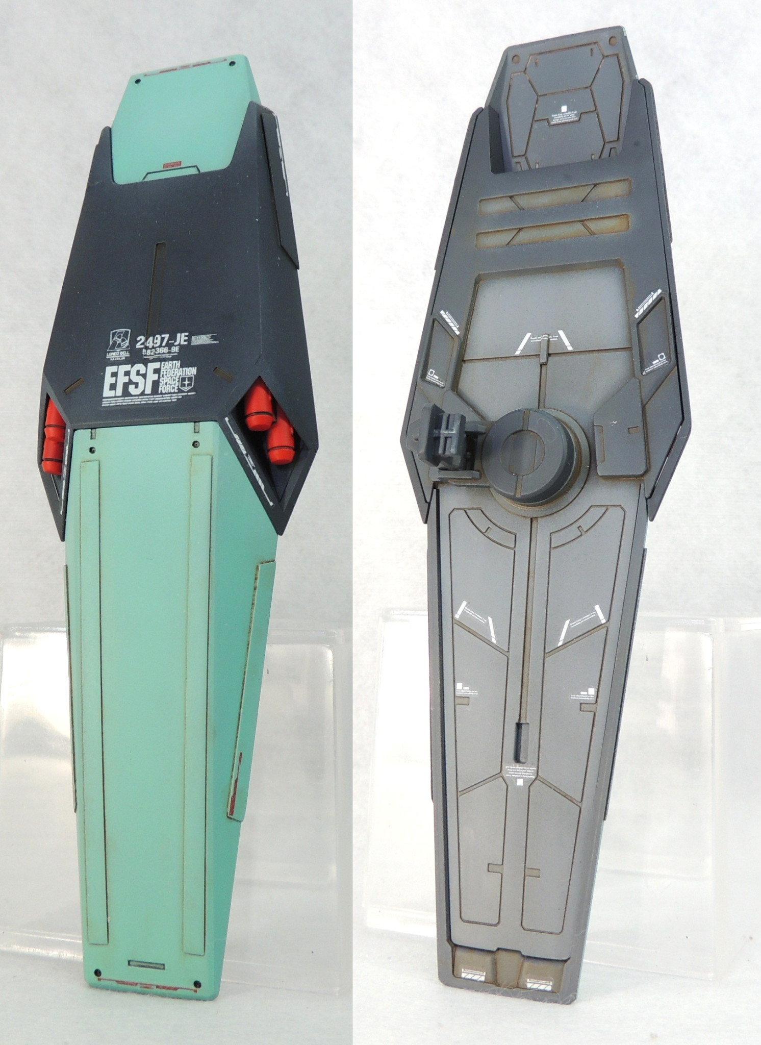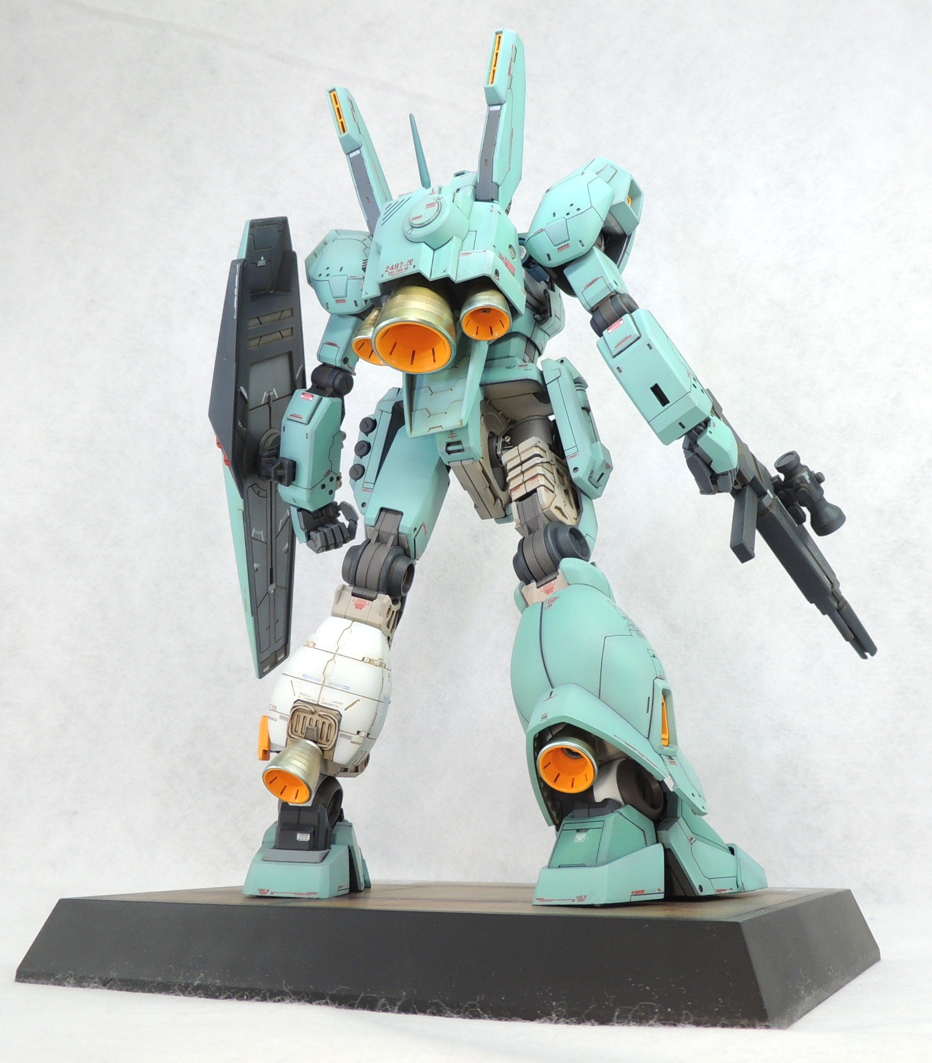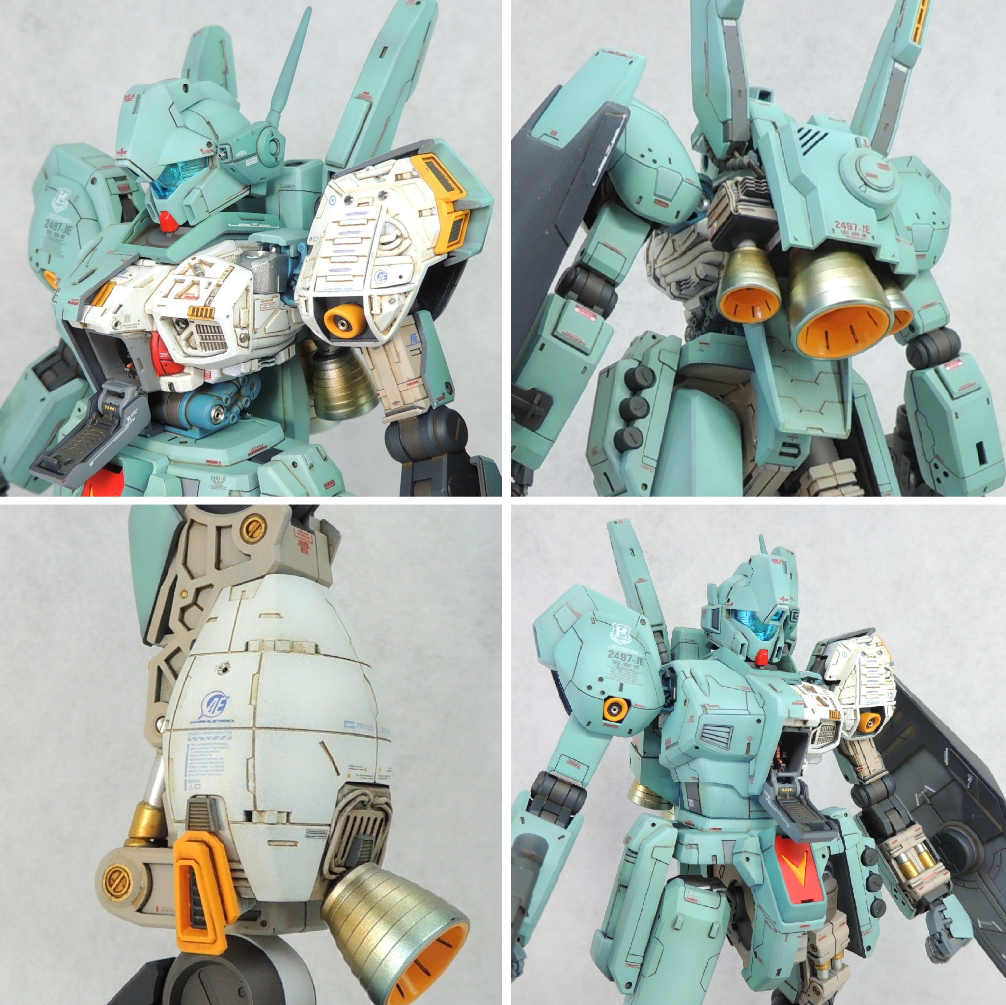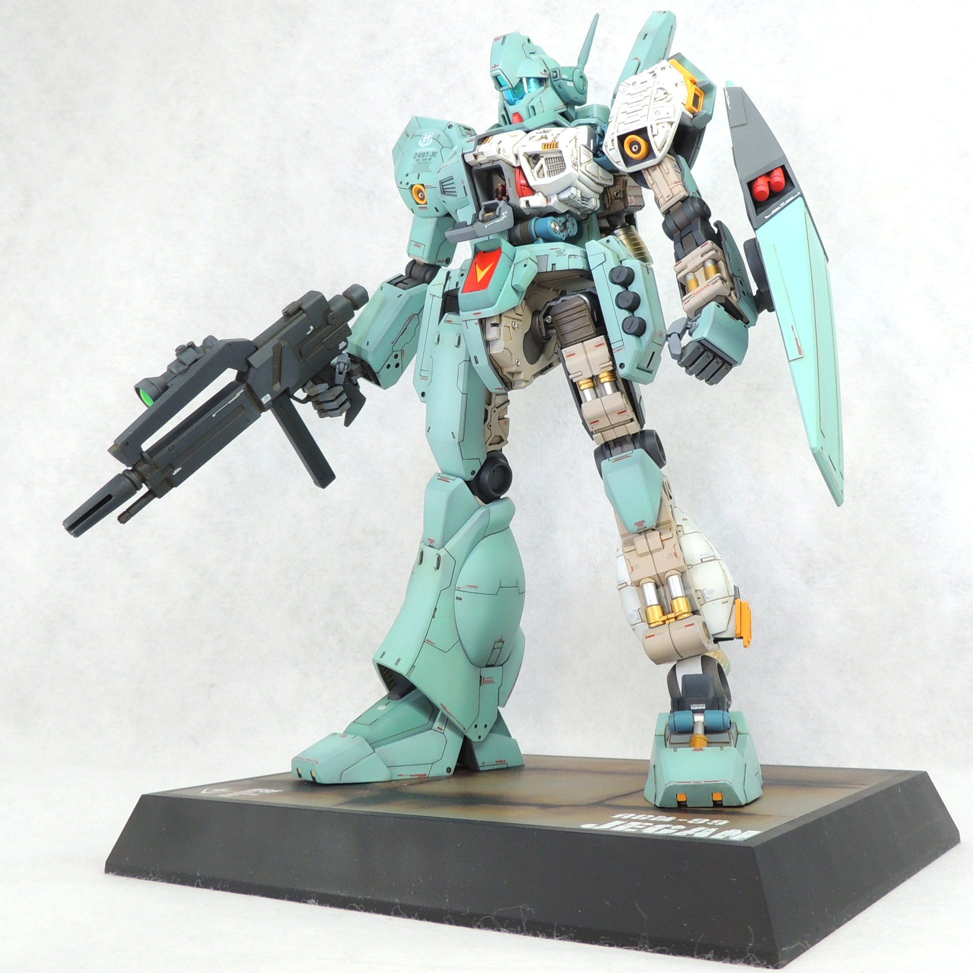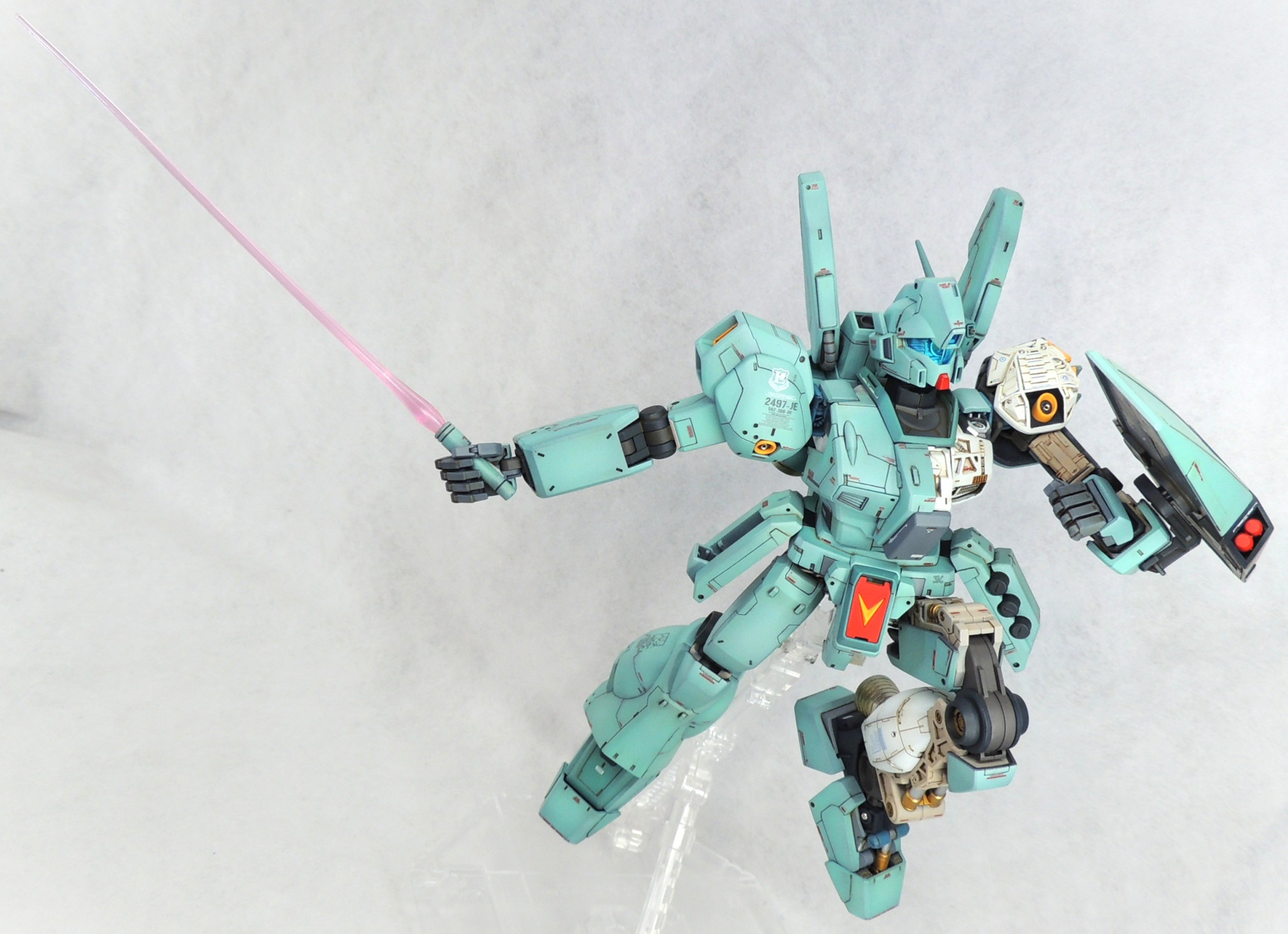 マスターグレードのジェガンに、カットモデルやメカニックモデルのテイストを盛り込み、さらに頭部とコクピットに電飾を仕込んで完成させました。ロンド・ベル隊の熟練パイロットの一人である、ケーラ・スゥ中尉機として製作しました。実戦経験豊富なケーラからのオーダーとアストナージの愛情?により、基本装備と武装を一部カスタム化された機体にしてみました。