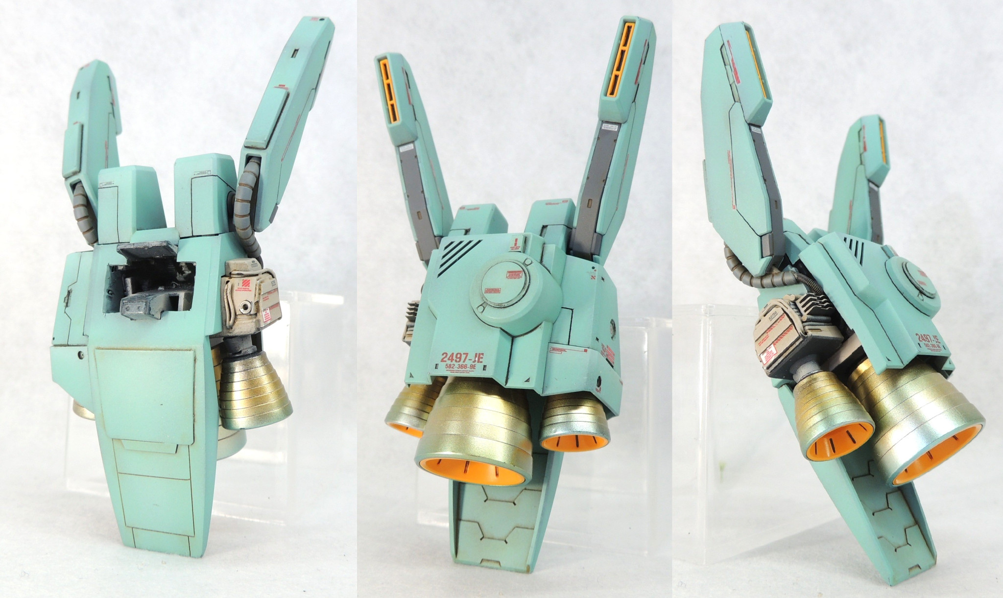 左側の外装を取り外し、内部メカを作り込みました。ミカド屋のシイタケモールド・タミヤのパイピングケーブル・スプリング(1.3mmφ)・メッシュワイヤー・エバーグリーンのモールド入りプラ板を貼り付けてディティールを追加しました。巨大な3基のノズルは、シルバーで塗装後、雰囲気重視でクリアオレンジとクリアブルーで焼け表現を行い、内側の中心部にハイキューパーツのツインパイプとガンマズルを接着しました。