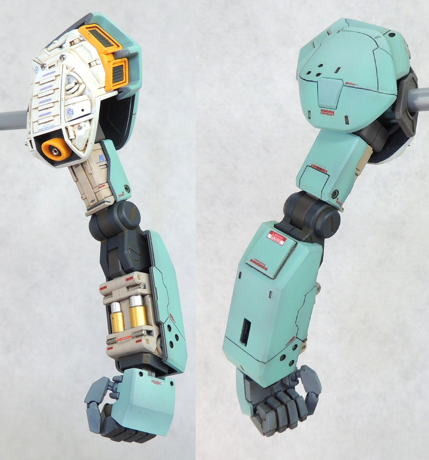 左腕は部メカを半分露出させ、プラ材の貼り付けや細かい塗り分けを行いました。内部フレームがつや消しなのに対し、シリンダー部分にキラリと光る金属色を使用してアクセントとしています。