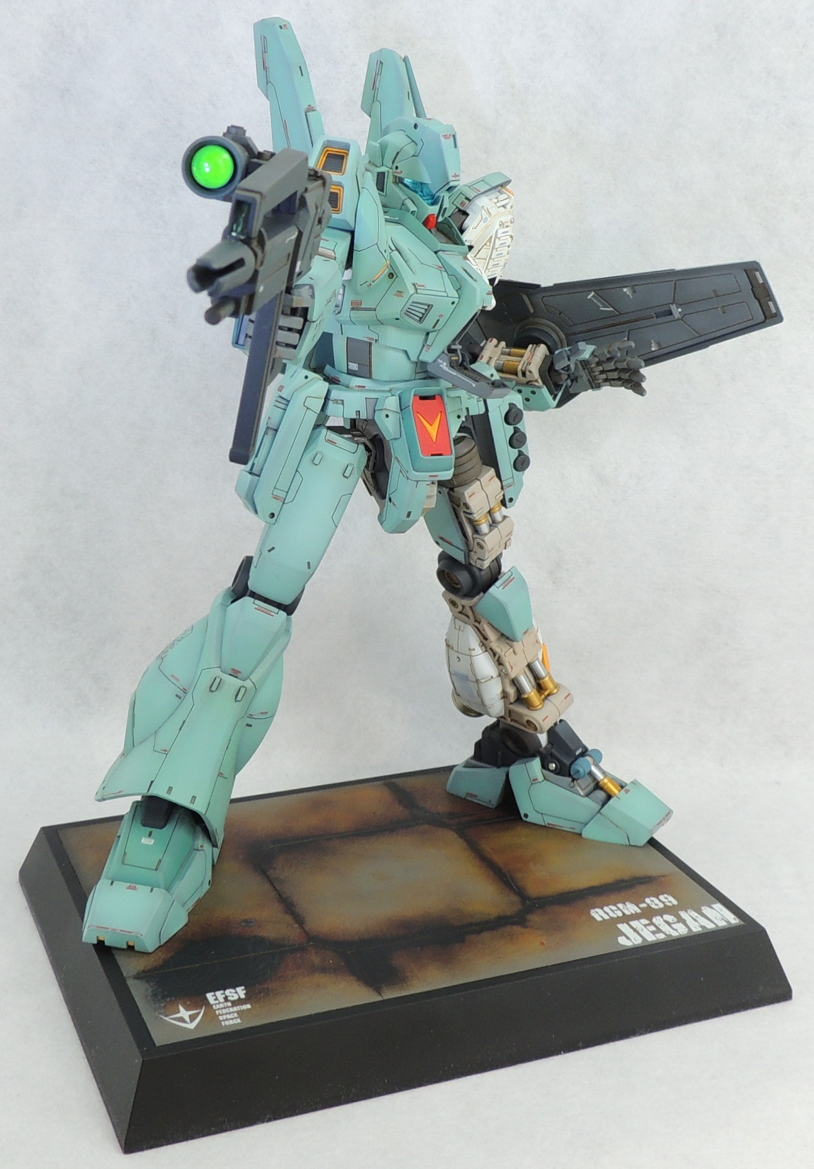 キットには台座が付属していないため、サイズ的に丁度良いタミヤのディスプレイベース・スモール(148mm×108mm)を使用しました。格納庫の一部に見立ててパネルラインのスジ彫りを入れ、下地をブラックサフで塗装した後、油彩によるドッティングにより複雑で奥深い色味を出しています。雰囲気としては、ラーカイラムの格納庫をイメージしています。使用したデカールは、地球連邦軍のエンブレムと”EFSF”は「ガンダムデカールDX」から流用し、文字はスジボリ堂のチッピングデカールを使用しました。