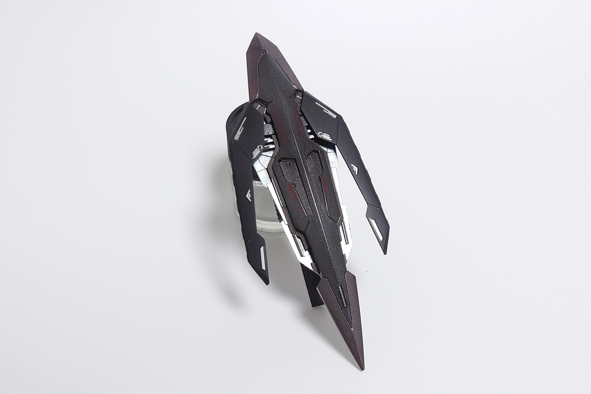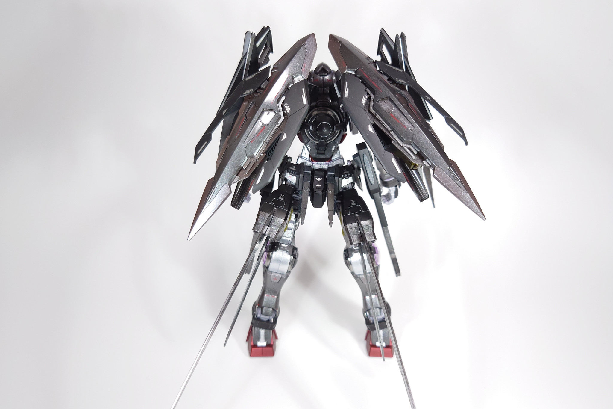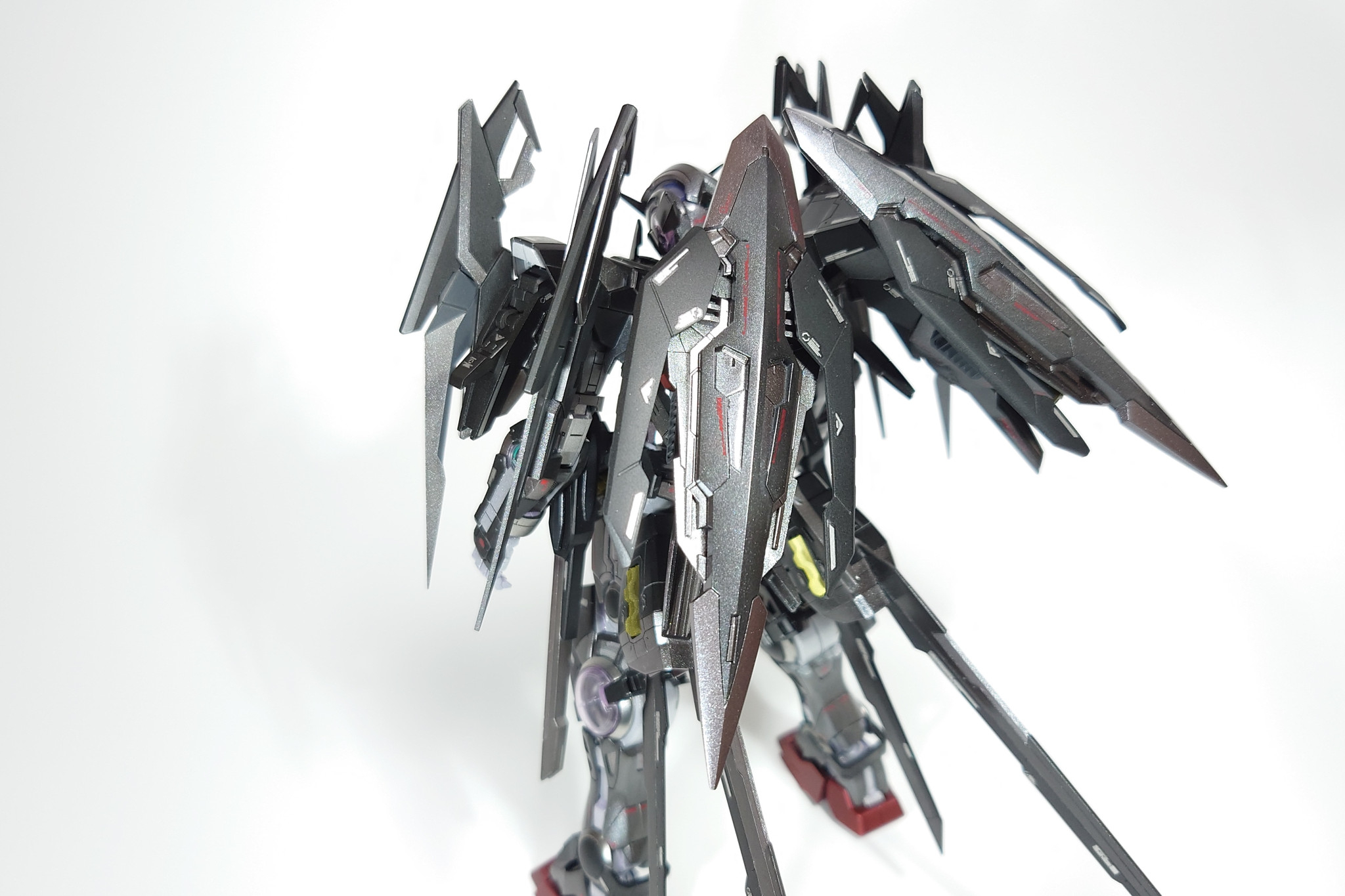 背部にはGNシールド2つを羽として展開できるように改造し、追加スラスターとして搭載しています。
