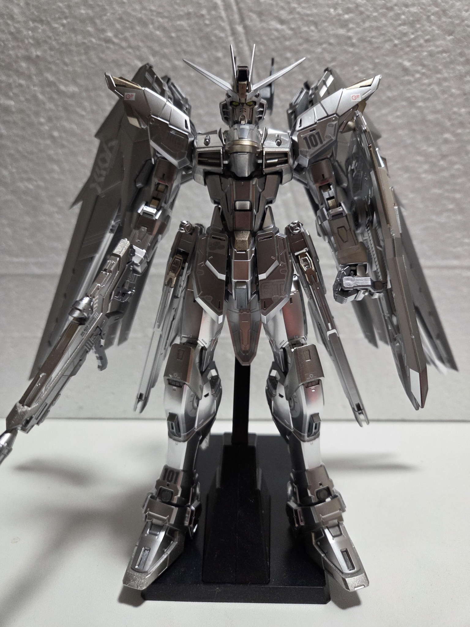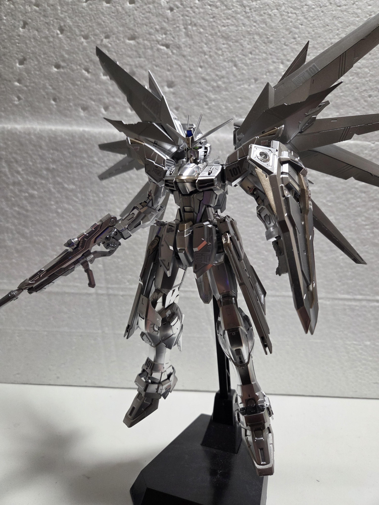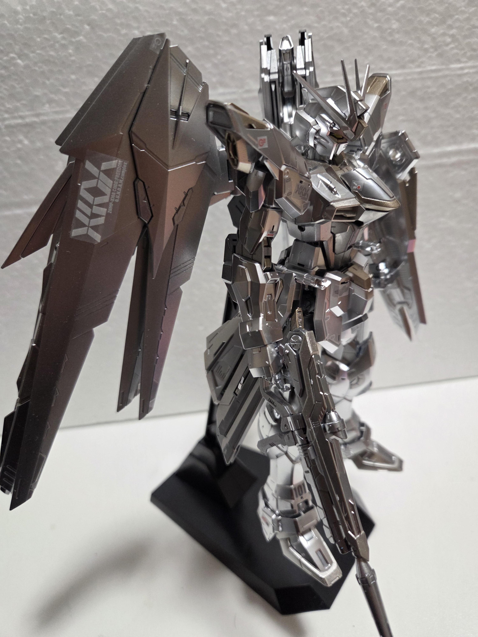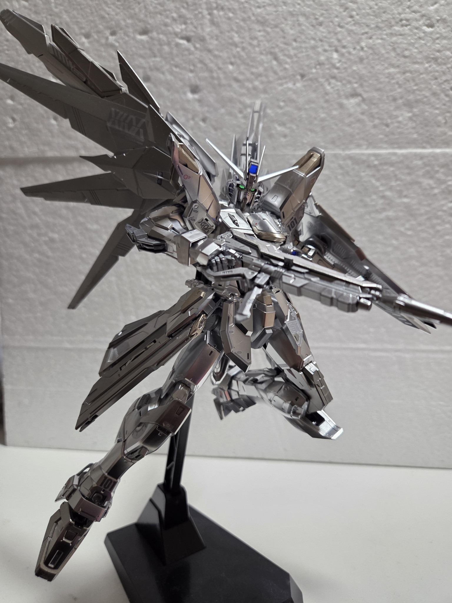 要望通りのギンギラギンになったと思います。メインカラーの白い外装部分はメッキだったのでそのままに成型色がグレーになっている所を塗りました。意外と銀のバランスを取るのが難しく塗るまでに結構シュミレーションしました。一応羽の部分はグラデーションにしているのですが写真だと良く分からないですね…