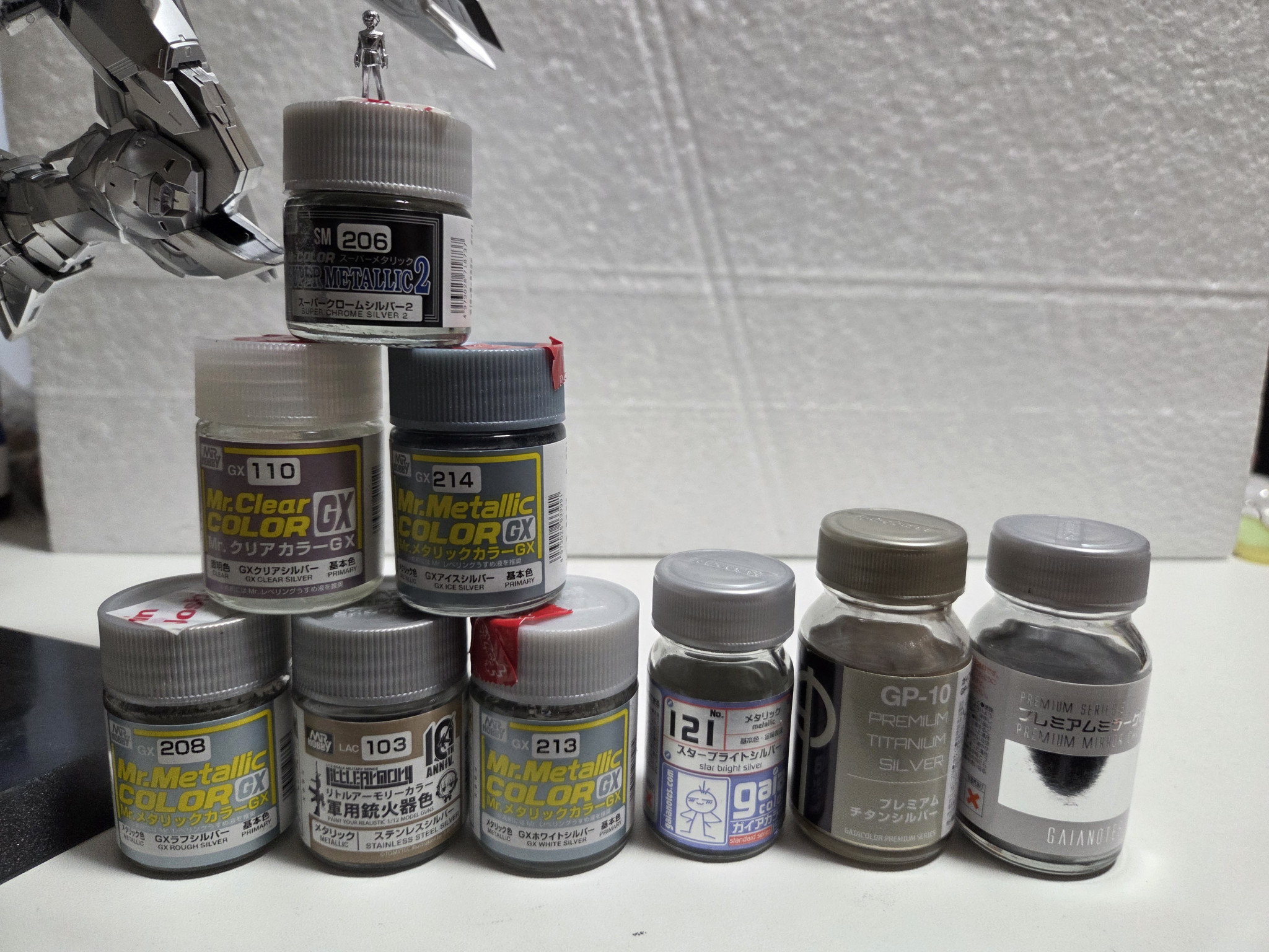 ギンギラギンにするために使った塗料はこちらになります。自分が持ってる銀の塗料全部使った感じですね。所々塗料を混ぜて使った場所もあります。元キットが赤の成型色の部分にプレミアムチタンシルバーを使ったのでわかりやすいアクセントになったかなと思います。