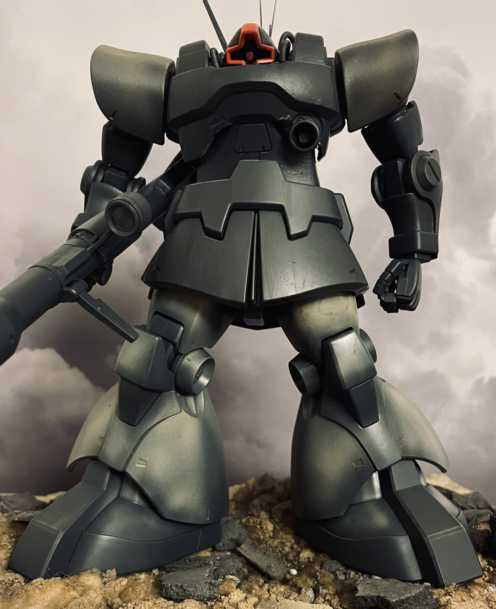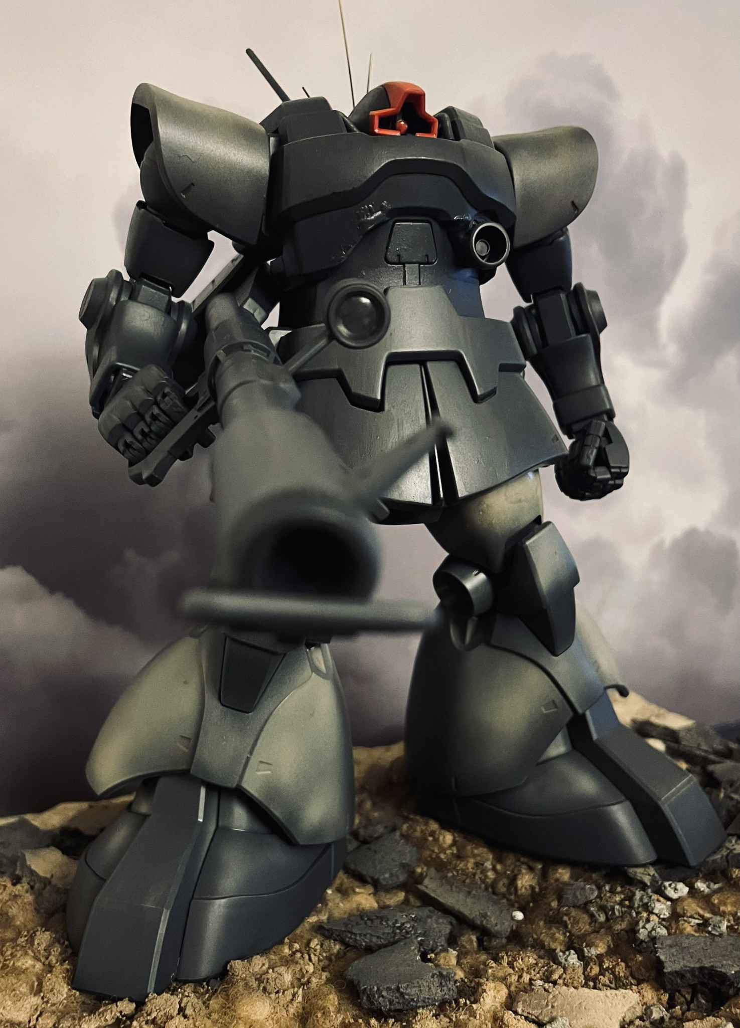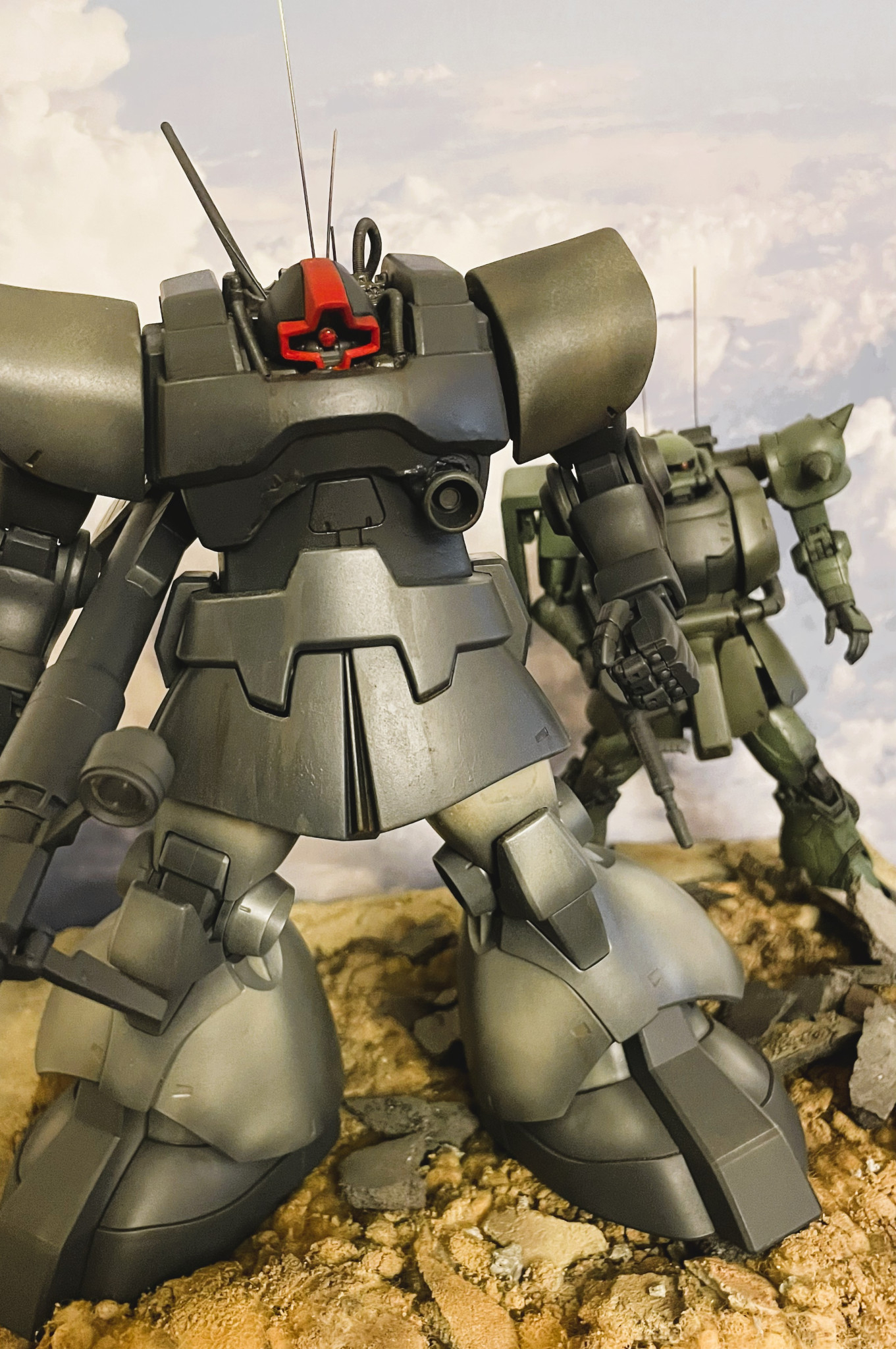 MS戦記のアレンジをイメージしたドムです。MGキットを使用しています。頭部回り及びバックパックを劇中のイメージに近づけるべく修正しています。後方にHGザクIIを配置しています。